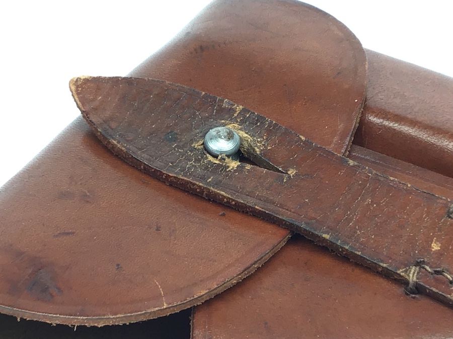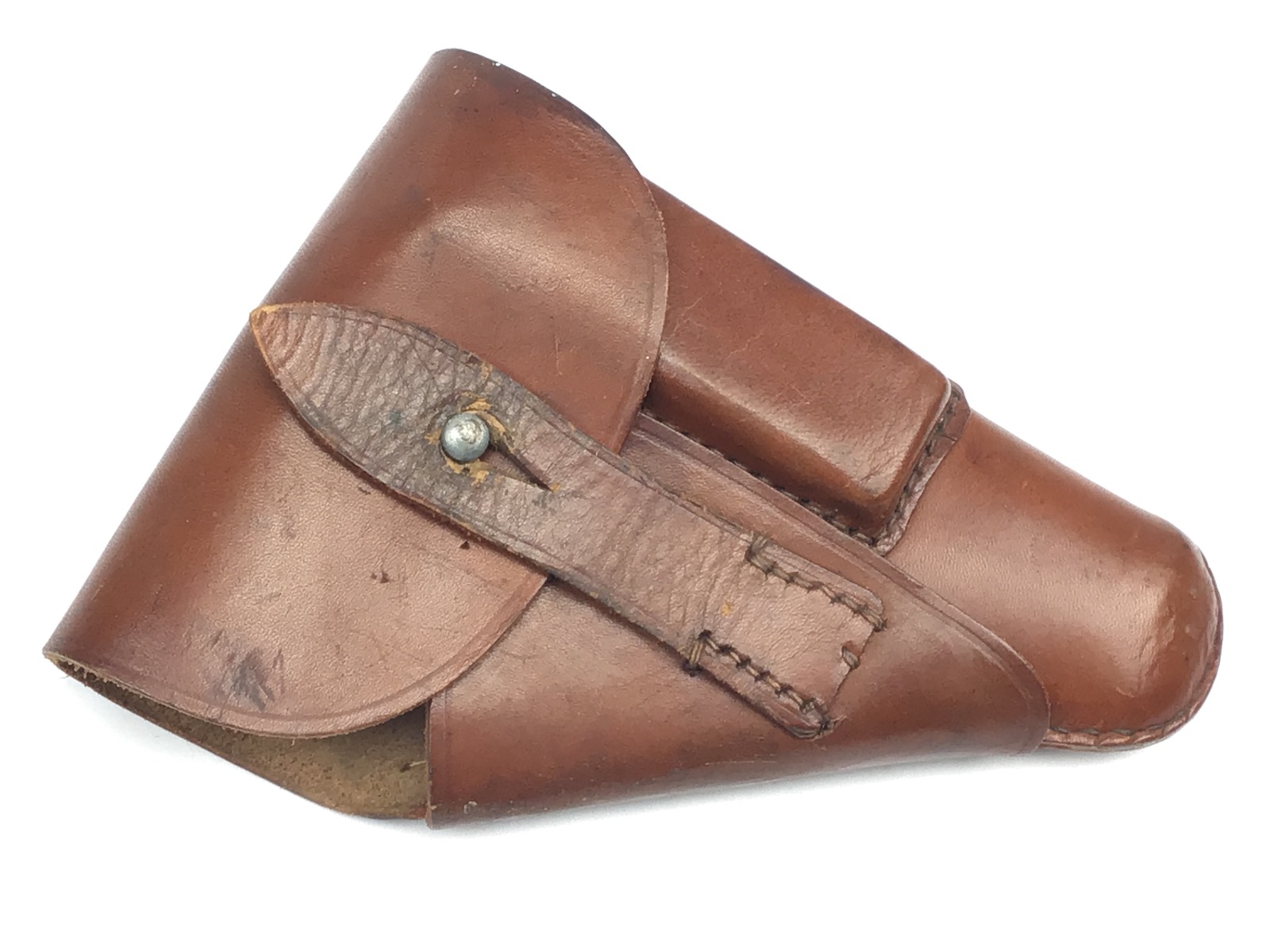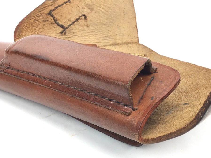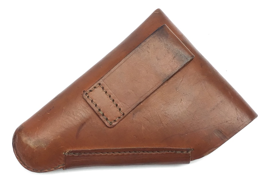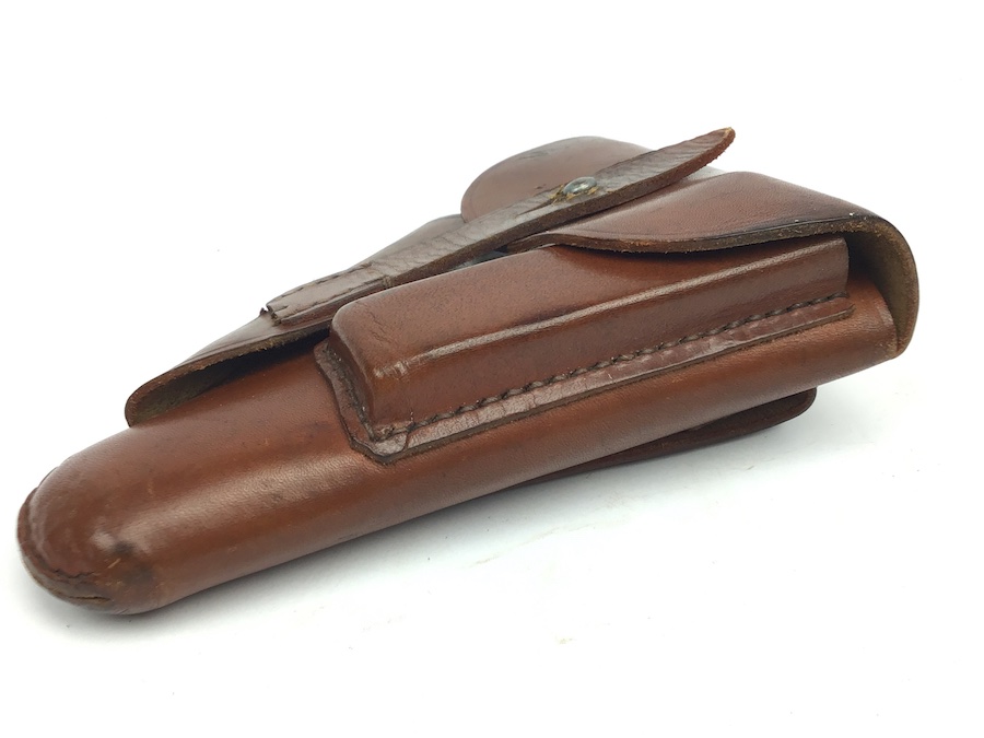 9/15/20 – This is an original Walther PPK holster from WW2 era. The holster has no markings, so we assume commercial issue. The holster has a very nice exterior with minor use wear and some staining. The closure strap has minor wrinkling. The interior leather is clean. The stitching is all tight and original. Guaranteed authentic.