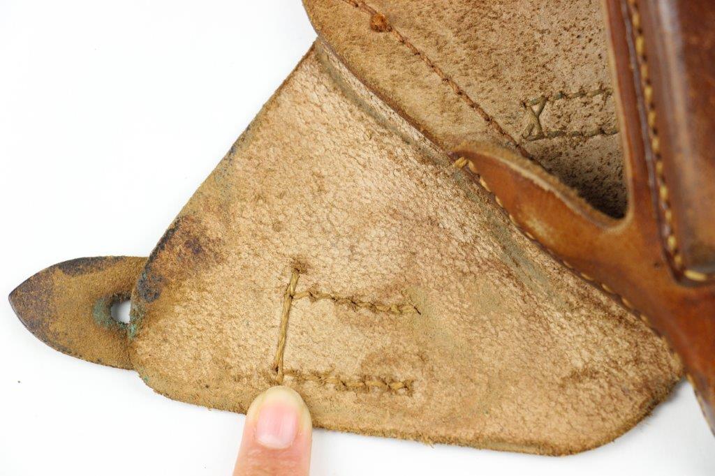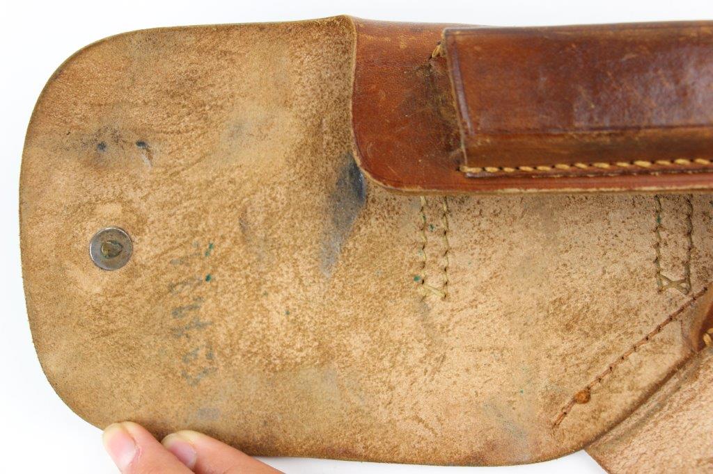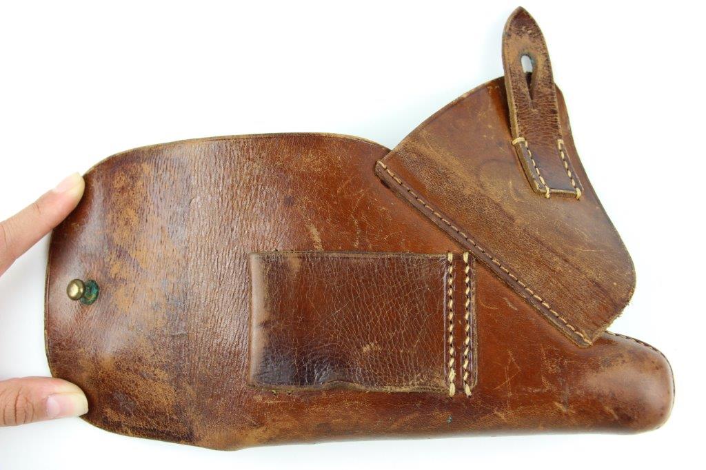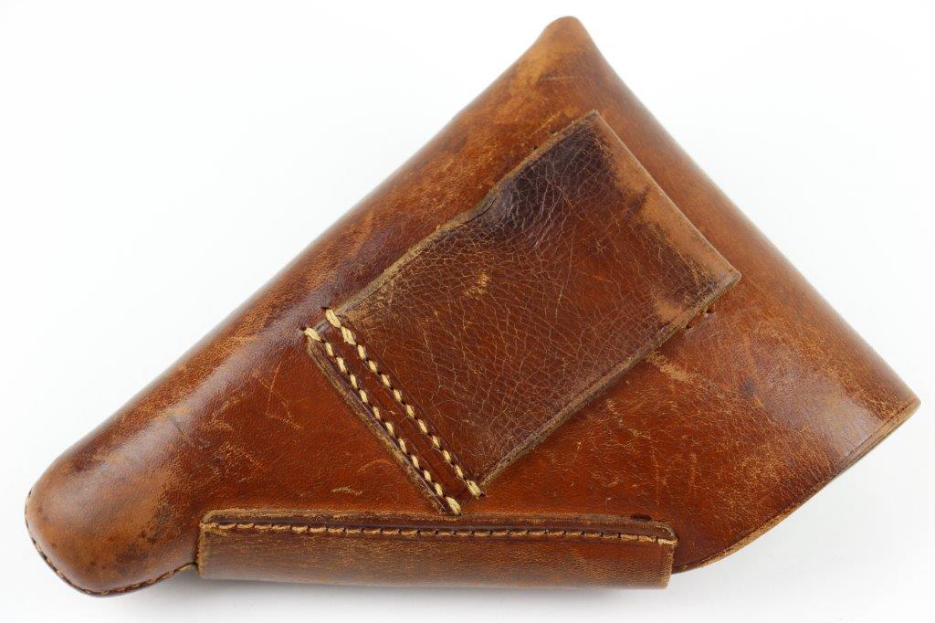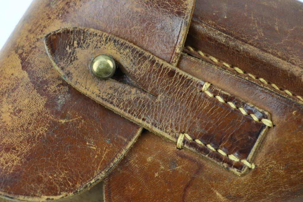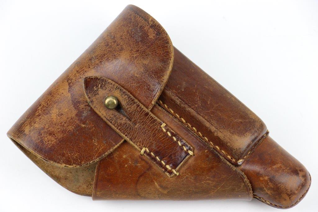 8/28/24 – This is an early WW2 style leather holster for a 7.65mm pocket pistol. The holster is unmarked and measures approx. 16.7cm long and 11.7cm wide when closed. Perfect size for a Walther PPK (similar sized pistols are suitable as well). The holster has brown leather with light surface wrinkling and mild scuffs from age and use. The interior leather shows normal use wear and a serial number is lightly written inside from a previous owner. This looks like German style handwriting and is faded with age. The stitching is all tight and original with no stitching issues. Nice, early brass closure knob as well. Perfect for an early (crown/N) Walther PPK pistol.