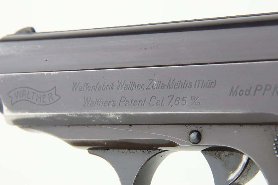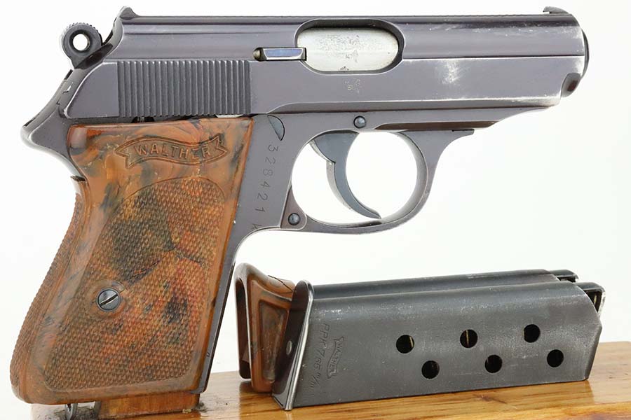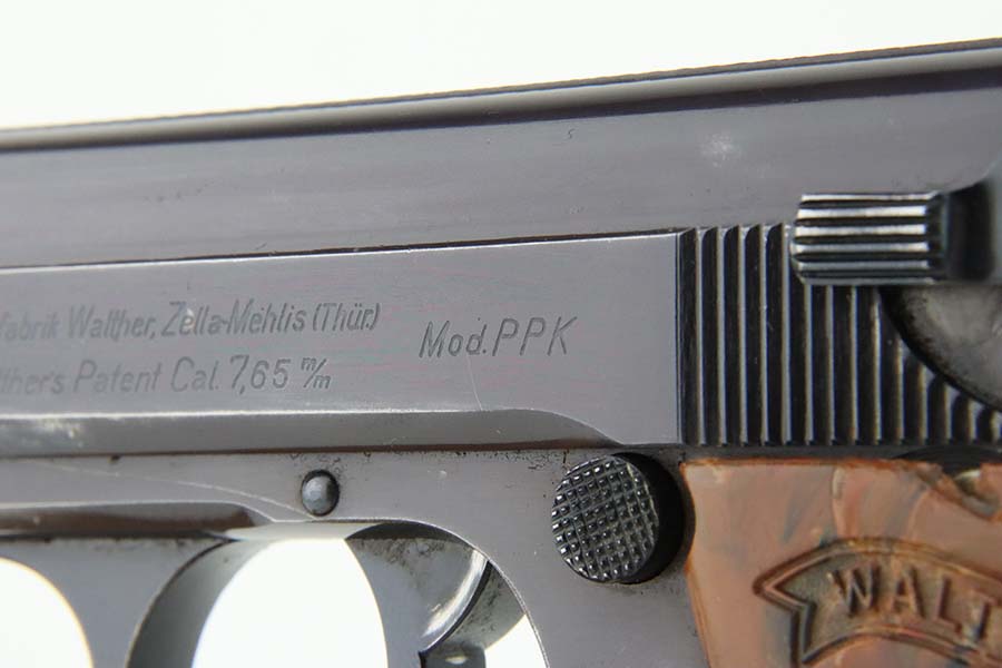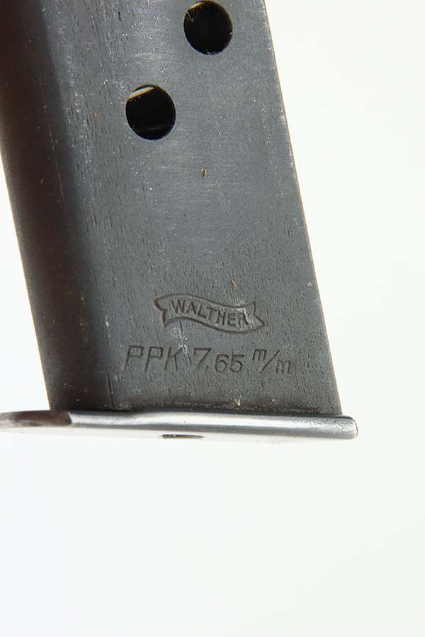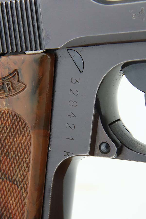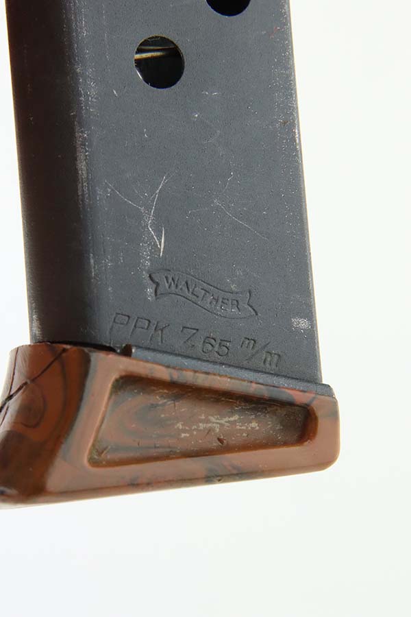 3/21/24 – This is an excellent example of a Walther PPK sold in the commercial market in 1941. All matching and “Eagle N” proofed. Its original high-polish bluing has a nice plum-colored tint to it and rates about 94%. Minor muzzle wear and a spot of wear on the right side of the slide. Fitted with a nice brown grip – a couple of tiny chips on the top edge of the left side, and there is a hairline crack on the left side as well. Comes with a finger extension magazine (crack in base) and a flat-bottom magazine. Mint bore. The hold-open does not work properly.