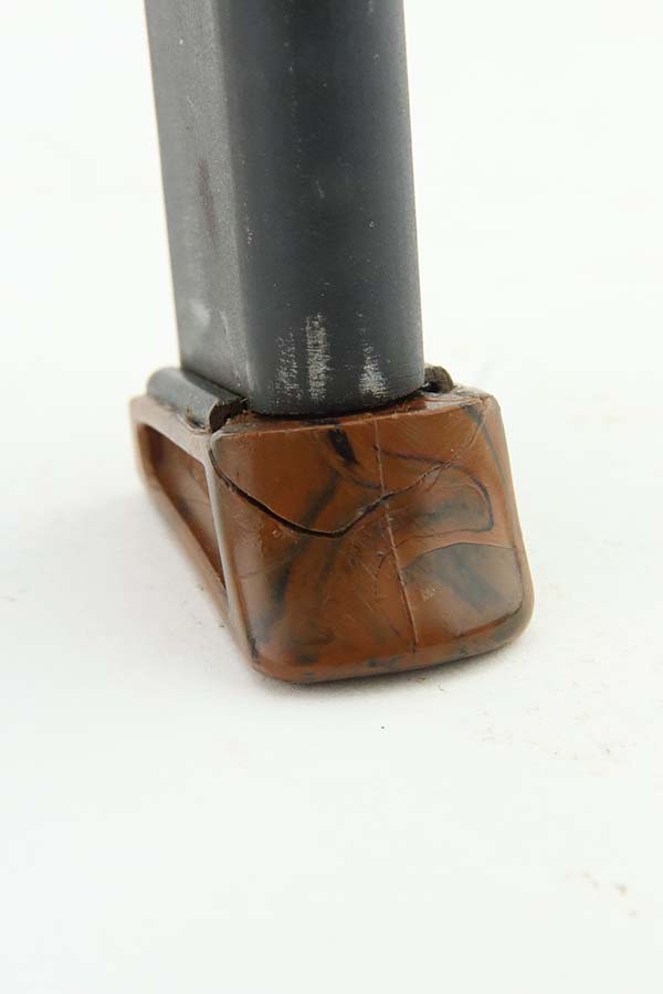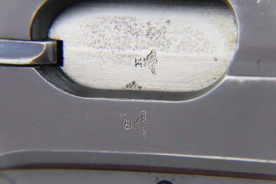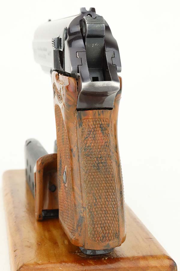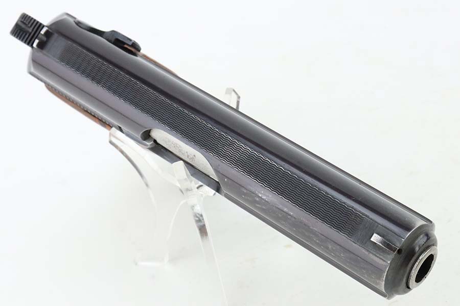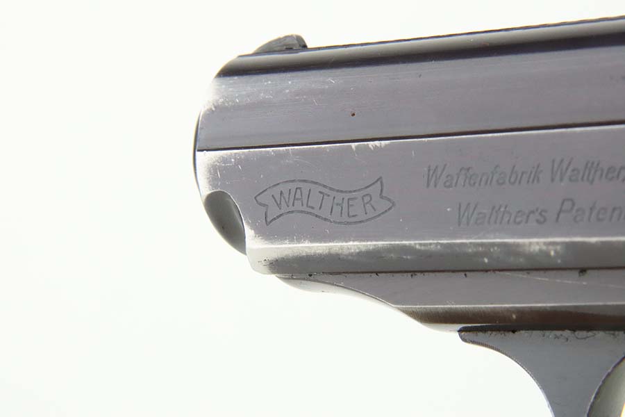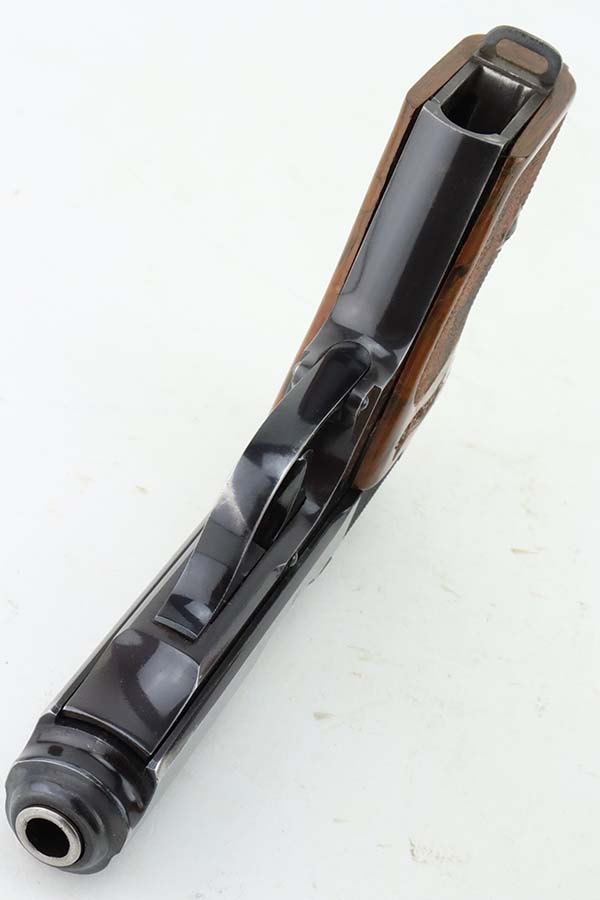 3/21/24 – This is an excellent example of a Walther PPK sold in the commercial market in 1941. All matching and “Eagle N” proofed. Its original high-polish bluing has a nice plum-colored tint to it and rates about 94%. Minor muzzle wear and a spot of wear on the right side of the slide. Fitted with a nice brown grip – a couple of tiny chips on the top edge of the left side, and there is a hairline crack on the left side as well. Comes with a finger extension magazine (crack in base) and a flat-bottom magazine. Mint bore. The hold-open does not work properly.