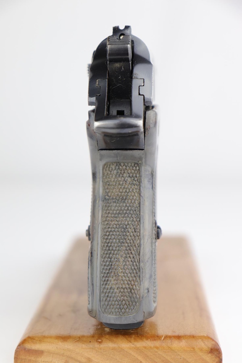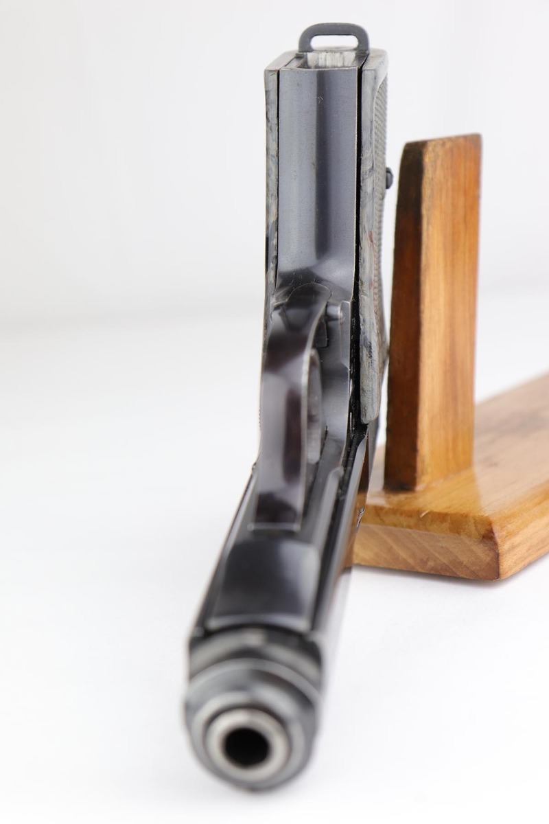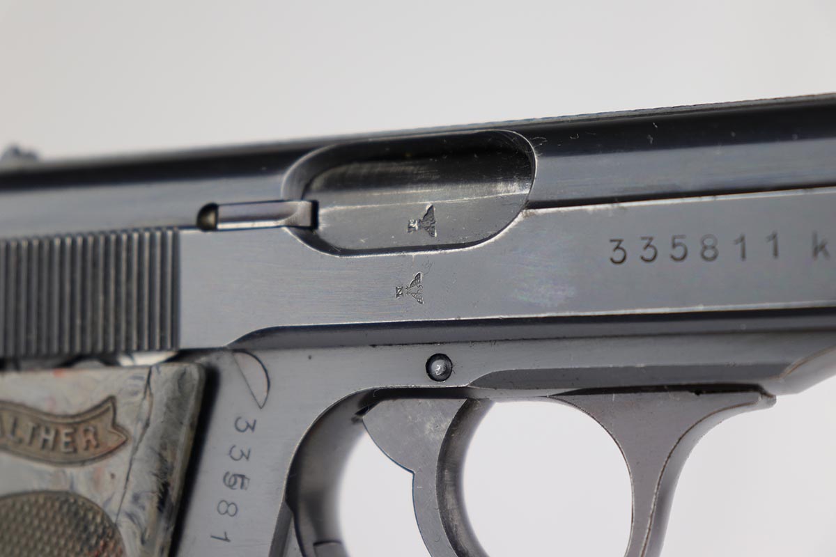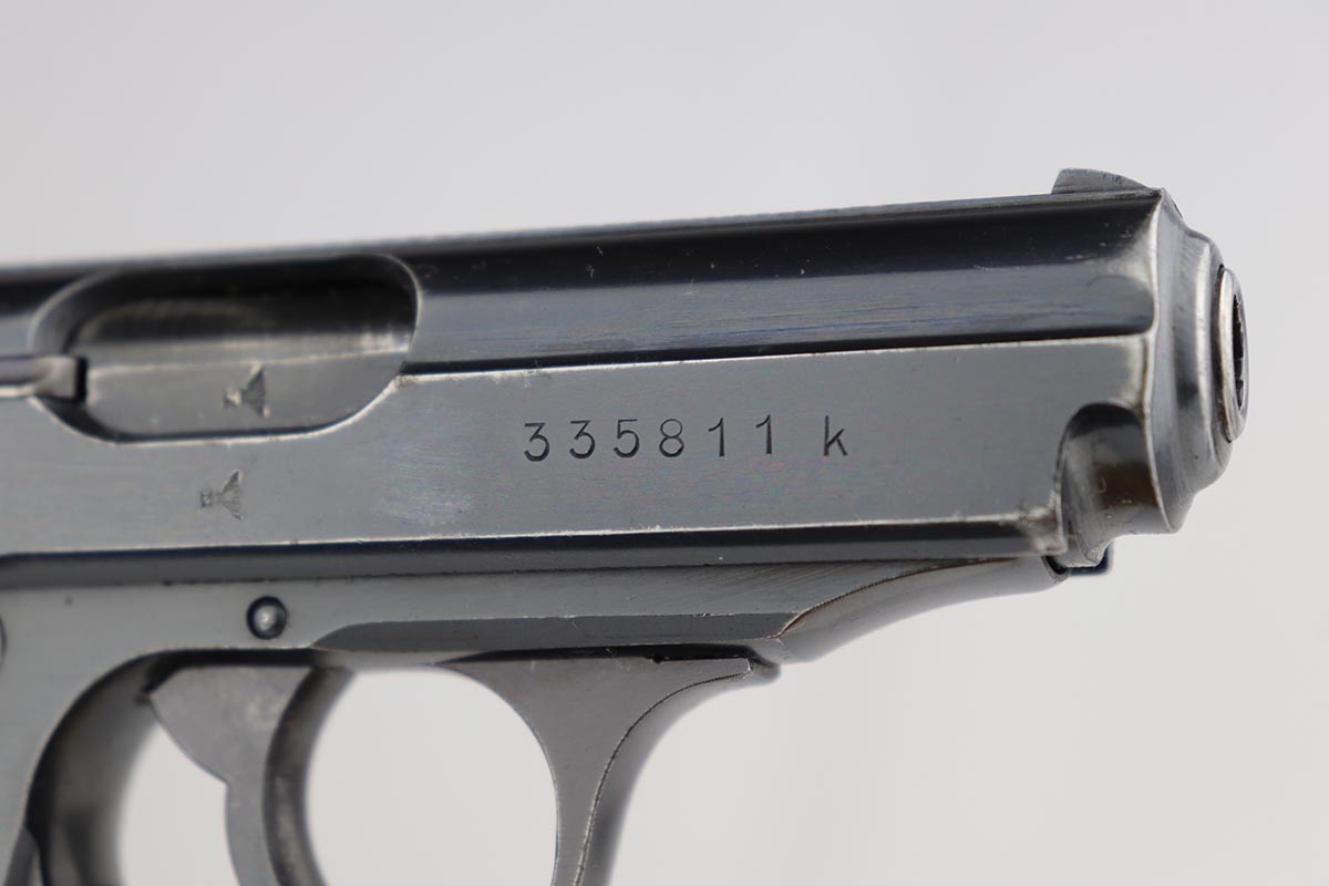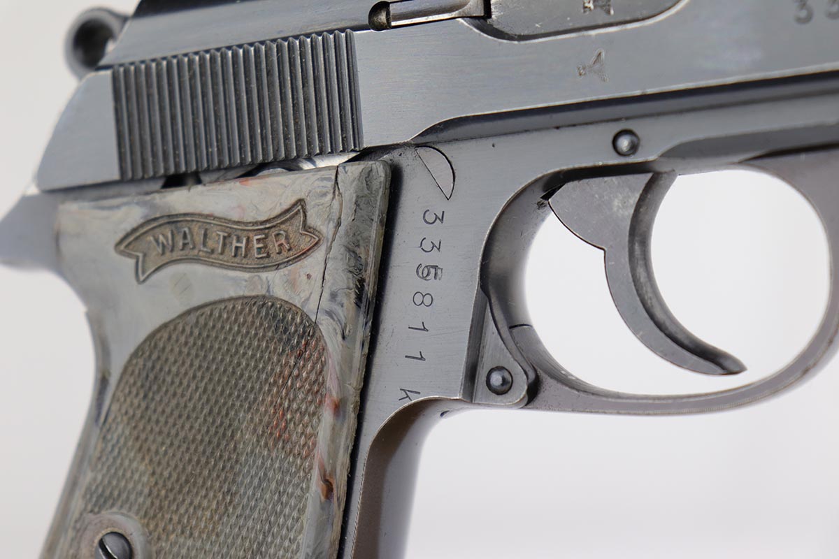 4/26/19 – For those of you who love the rare transitional gray grip, this is one of the most colorful I have ever seen, as it is almost a bluish gray color. The gun is a transitional PPK in that it is Eagle/N (wartime) proofed but still has the high-polish finish. It is matching slide and frame. The original finish is about 95% with finish loss on both sides of the slide near the muzzle. It also comes with the blued ejection port which is also correct and transitional. The frame serial has a minor overstamp on the 5, which as you Walther collectors know, is not uncommon. The magazine is a correct wartime variation. The grip was made in the transition from brown to black. There were not many made in this transition and this one is particularly unique in color. There are “dings” on both sides of the screw hole, and a crack on the right side of the grip. Not sure how this came about but they are on both sides and render the screw escutcheons to be a bit loose. No effect on the guns operation, just aesthetics. Excellent bore – shiny and strong rifling.