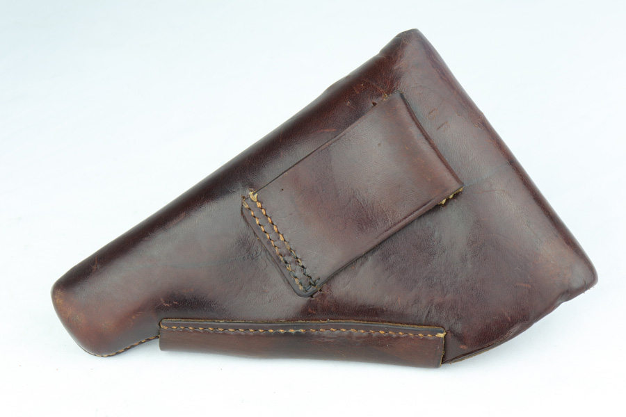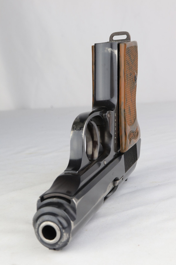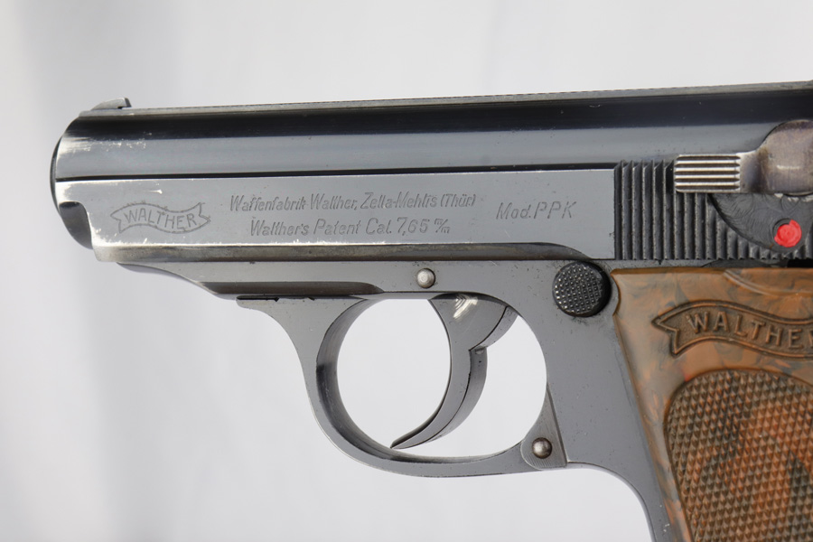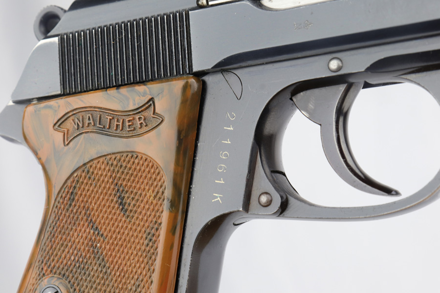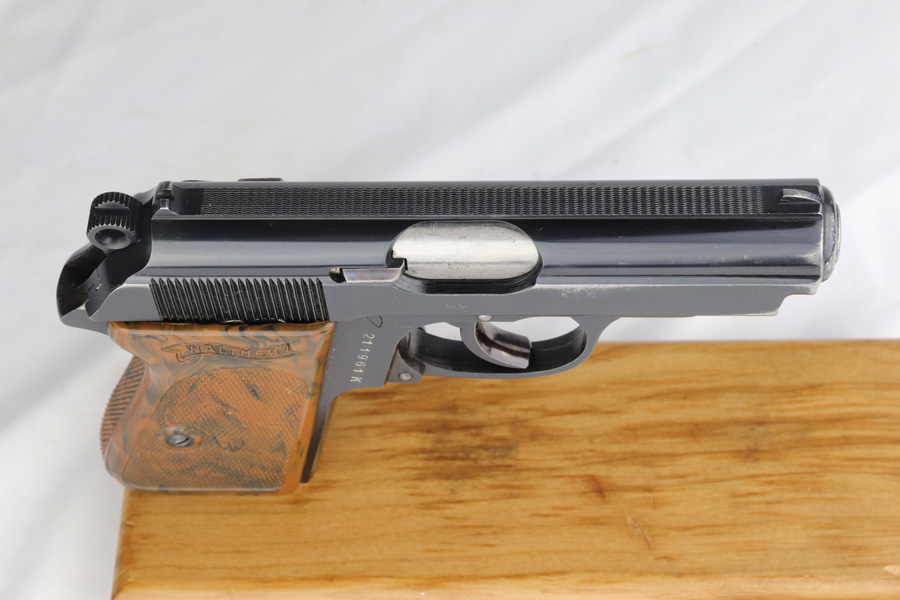 4/9/19 – This is a complete and original Walther PPK rig from the Nazi era. It was produced for the commercial market in 1939. The pistol retains 93-94% high-polish blue, with muzzle wear on both sides, as well as some finish loss on the front strap, trigger guard, and near the ejection port. Excellent, shiny bore. Grip is in very good condition with only a very thin and small stress crack in the spine. The rig is completed by an original spare magazine, and Akah marked holster with faint internal inkstamp.