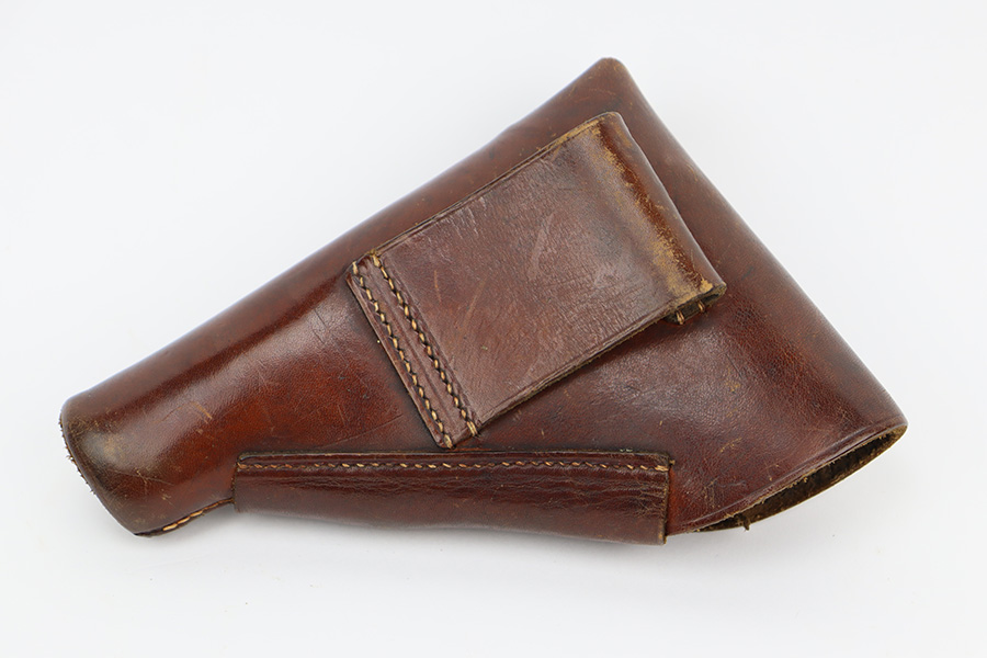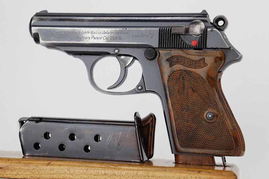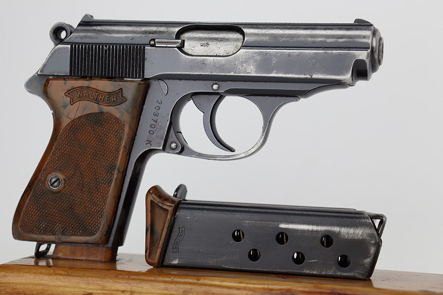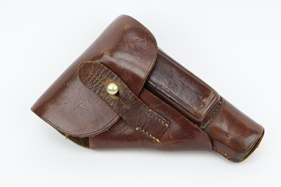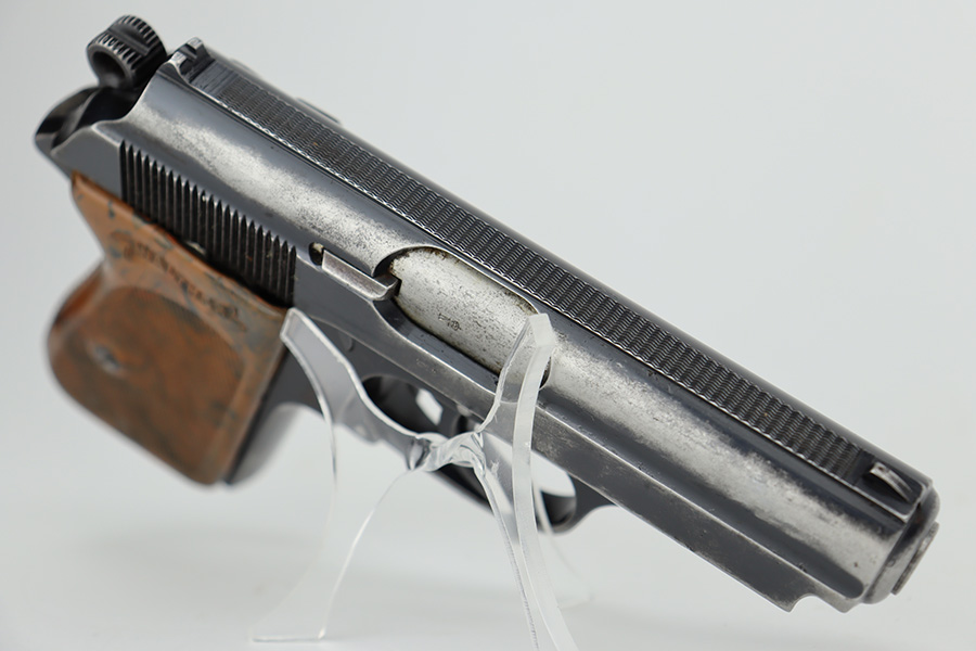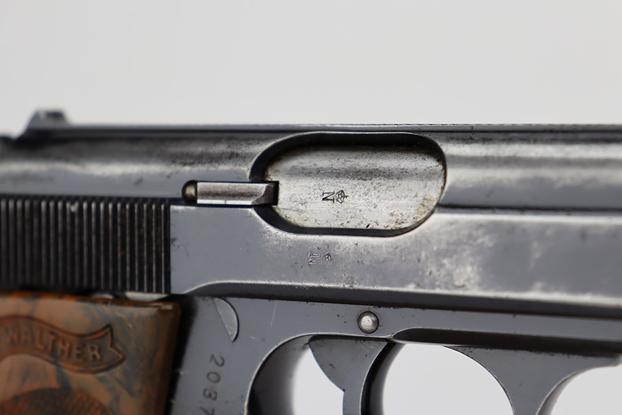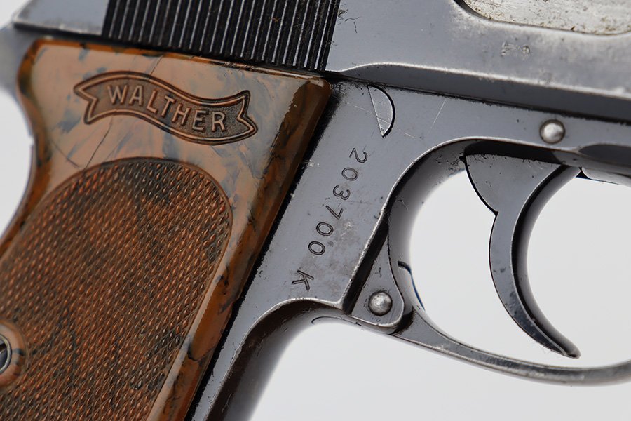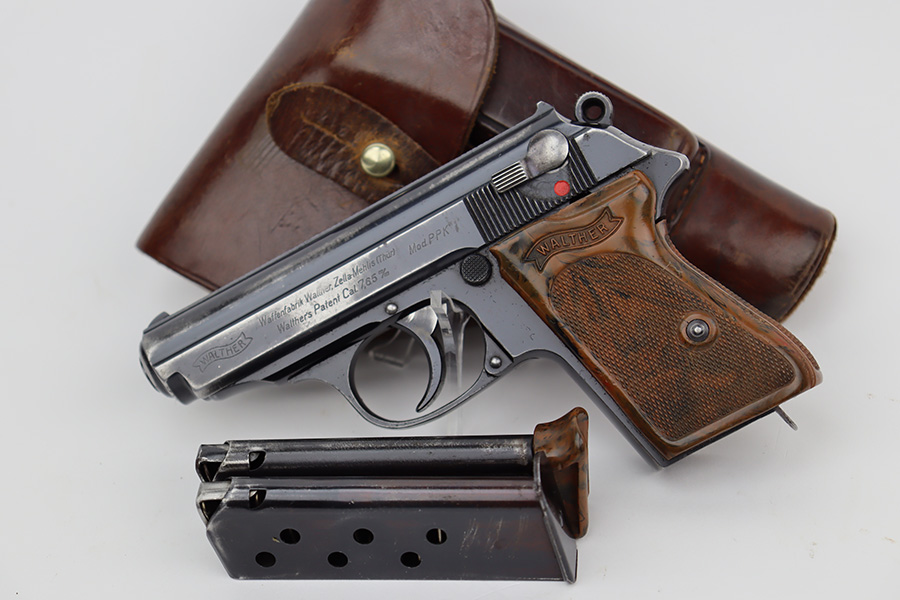 6/21/23 – This is a nice example of a Walther PPK sold in the commercial market in 1938. All matching with the proper “Crown N” commercial proofs. It comes as a rig with an early Akah holster, one period-correct finger extension magazine, and one post-war flat bottom magazine. The toe of the holster has been cut out. The gun itself has retained roughly 65-70% of its original high polish finish. There is obvious spotty wear along both sides of the slide and on the front strap. Fitted with a period-correct Walther grip – there are a couple of hairline cracks on the right side and a small crack in the spine. The bore has good rifling, but there is frosting in the grooves.