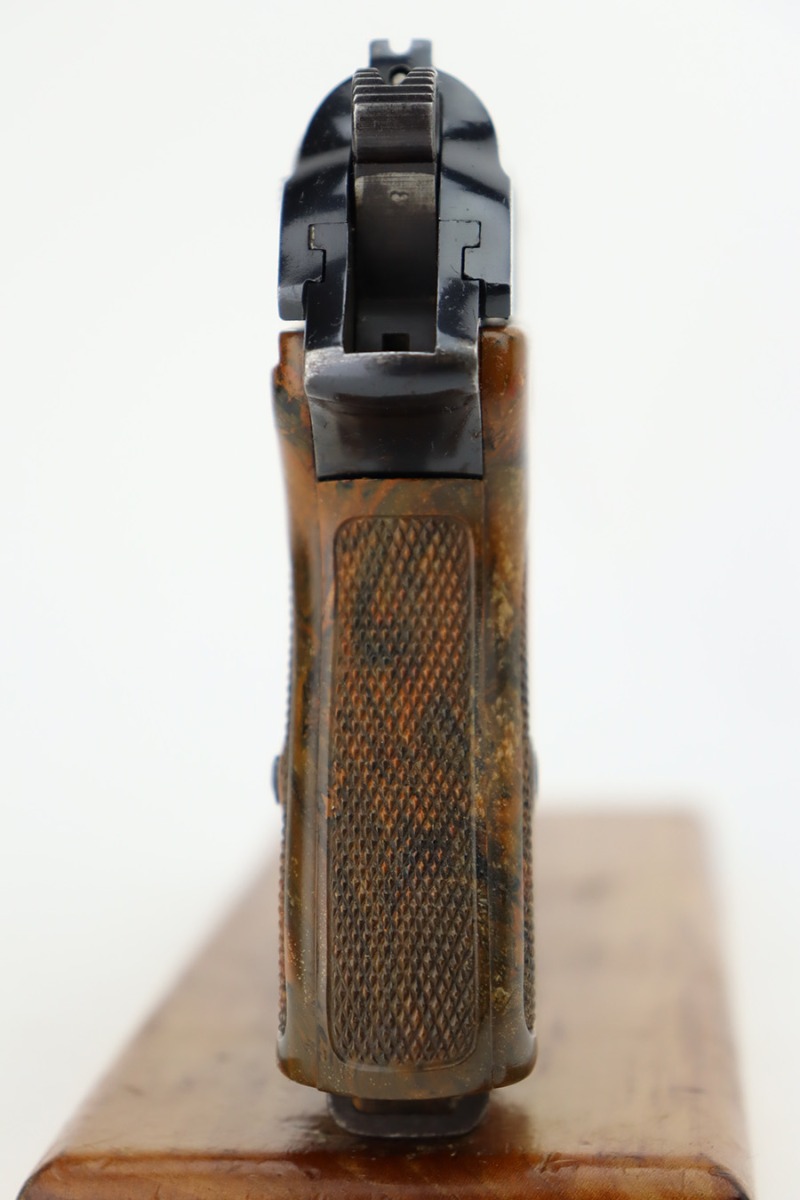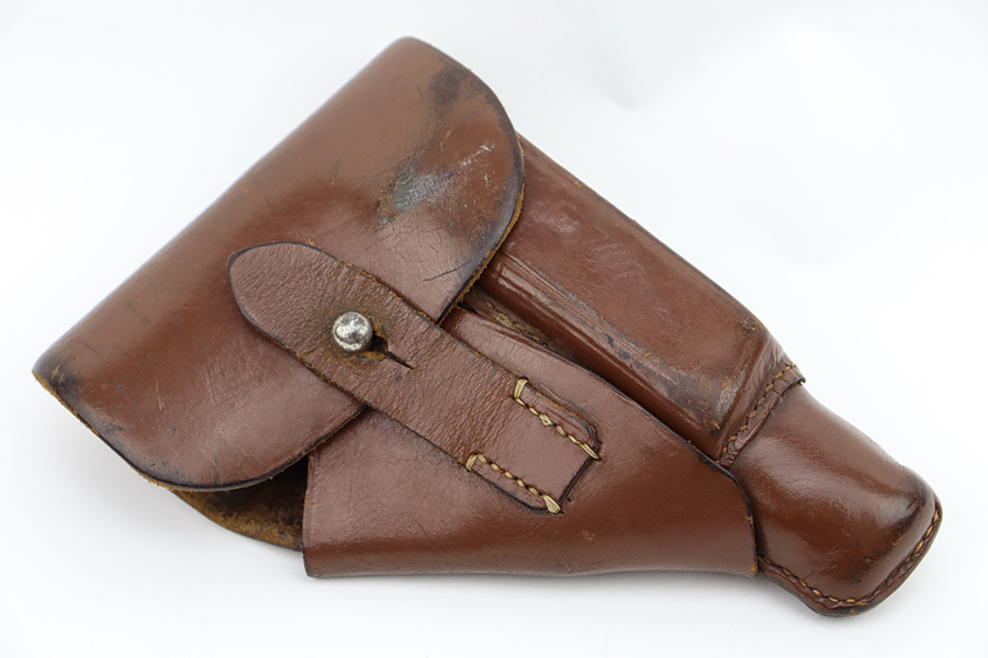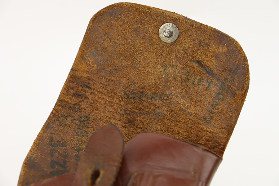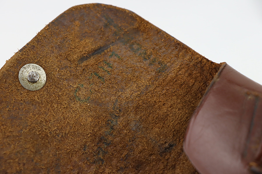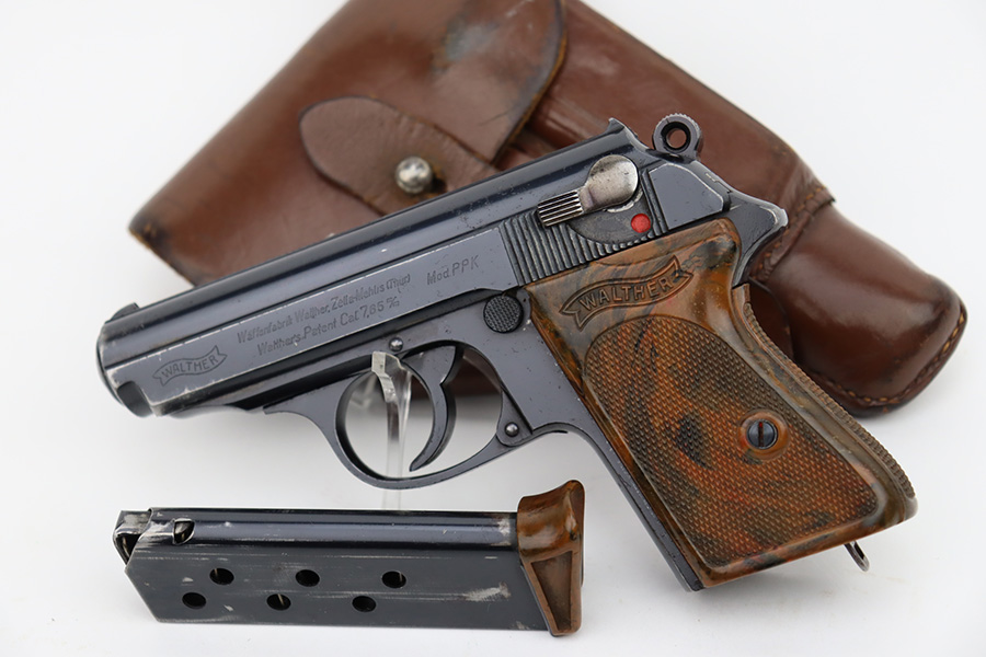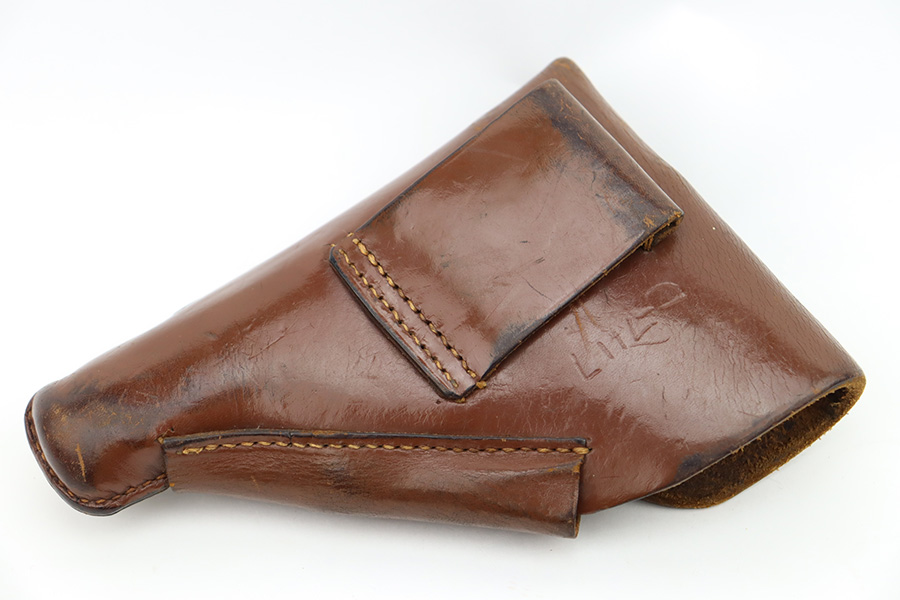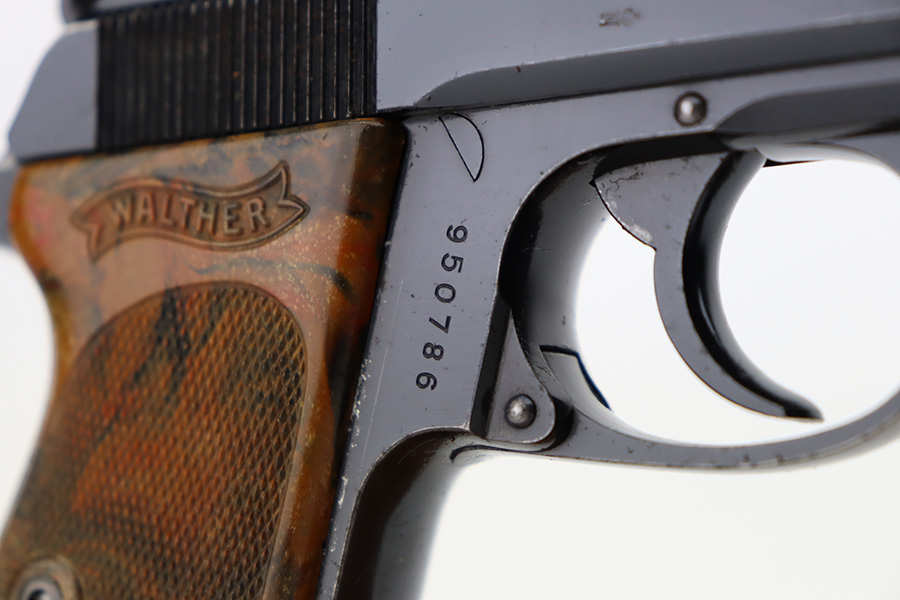1/12/24 – This is a very nice example of a Walther PPK sold in the commercial market in 1937. All matching and “Crown N” proofed. It comes as a rig with a finger extension magazine and a period-correct but painted holster – there is a GI name written on the inside. The original high polish finish rates about 93% with minor muzzle wear and some wear along the right side of the slide. Fitted with an excellent brown Walther grip with really nice color marbling. Minty bore.