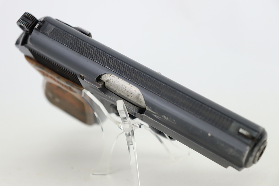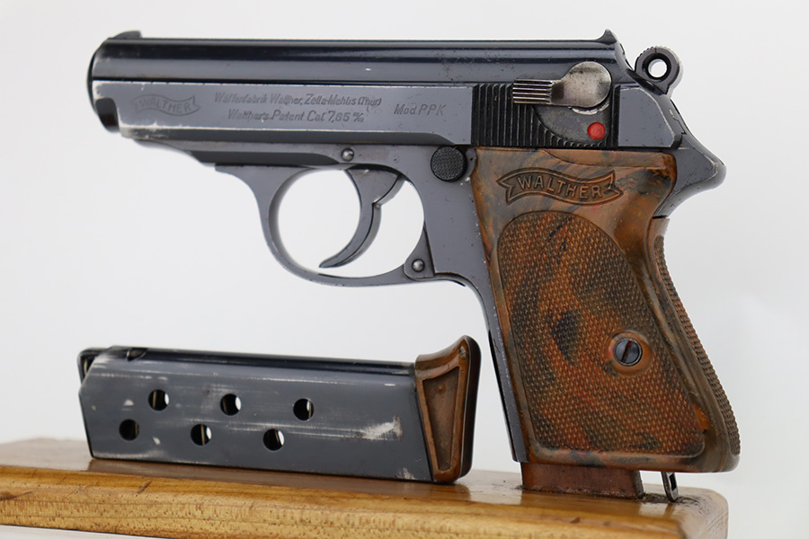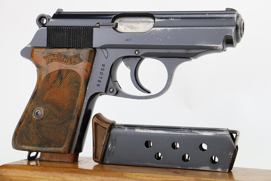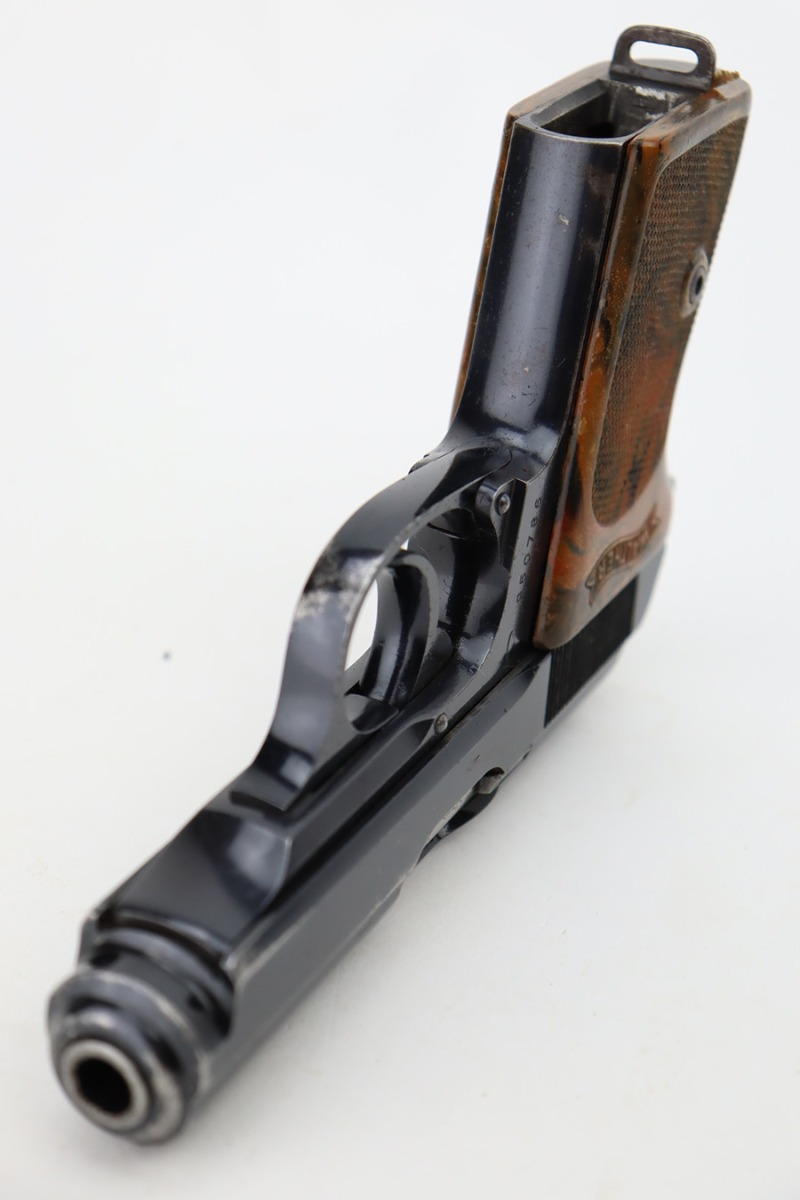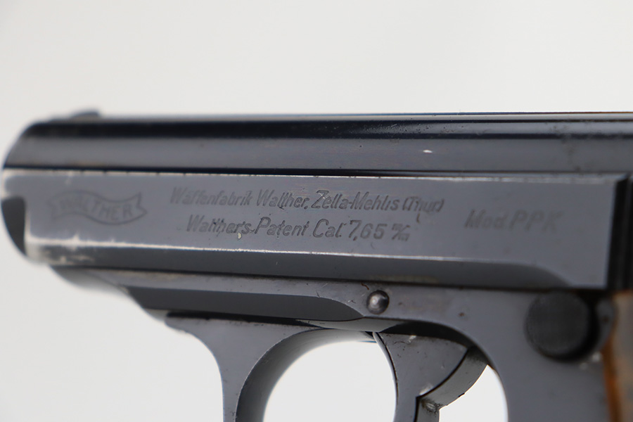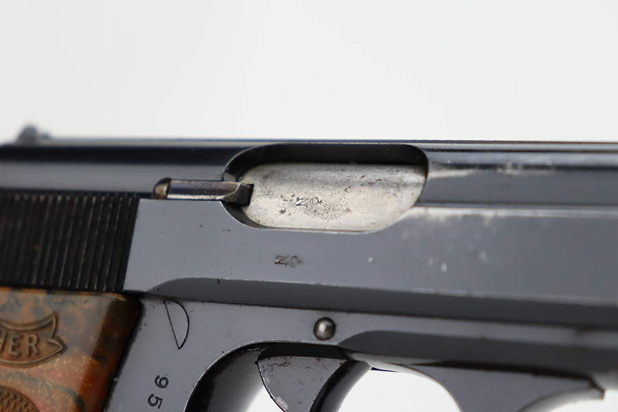 1/12/24 – This is a very nice example of a Walther PPK sold in the commercial market in 1937. All matching and “Crown N” proofed. It comes as a rig with a finger extension magazine and a period-correct but painted holster – there is a GI name written on the inside. The original high polish finish rates about 93% with minor muzzle wear and some wear along the right side of the slide. Fitted with an excellent brown Walther grip with really nice color marbling. Minty bore.