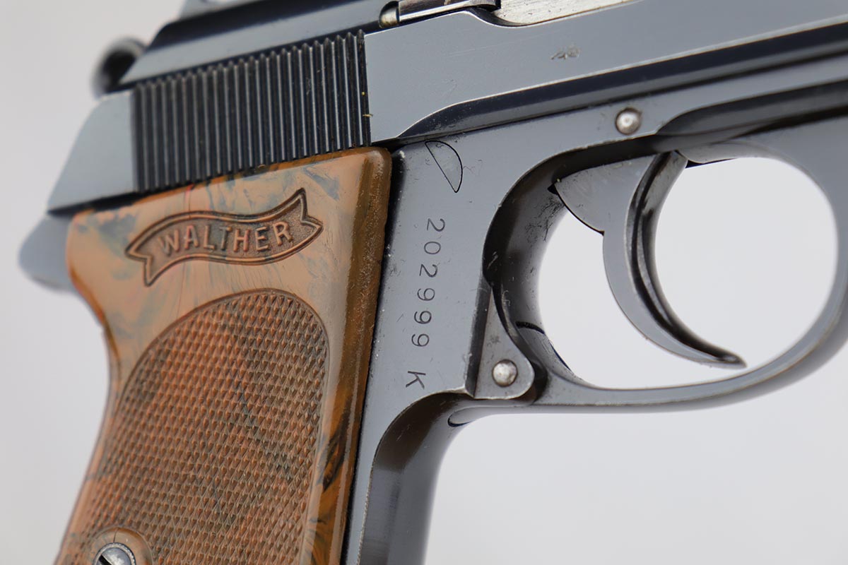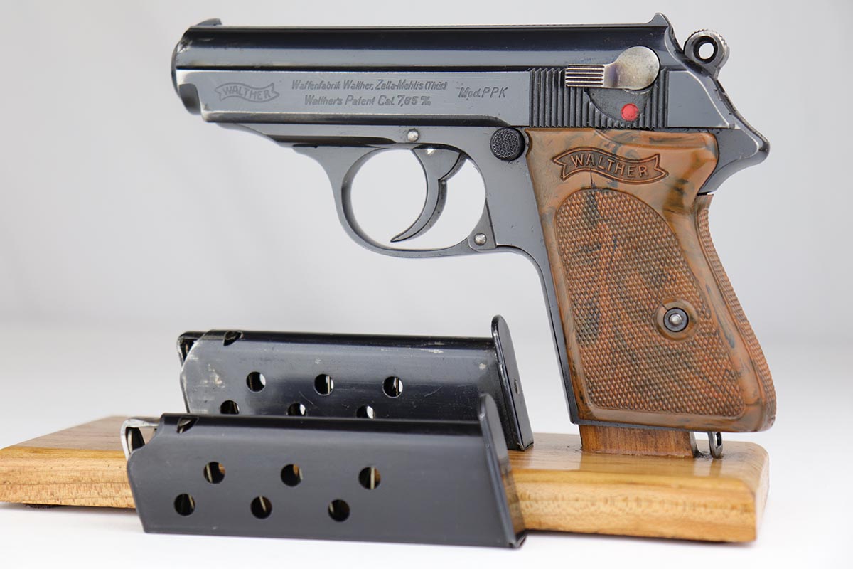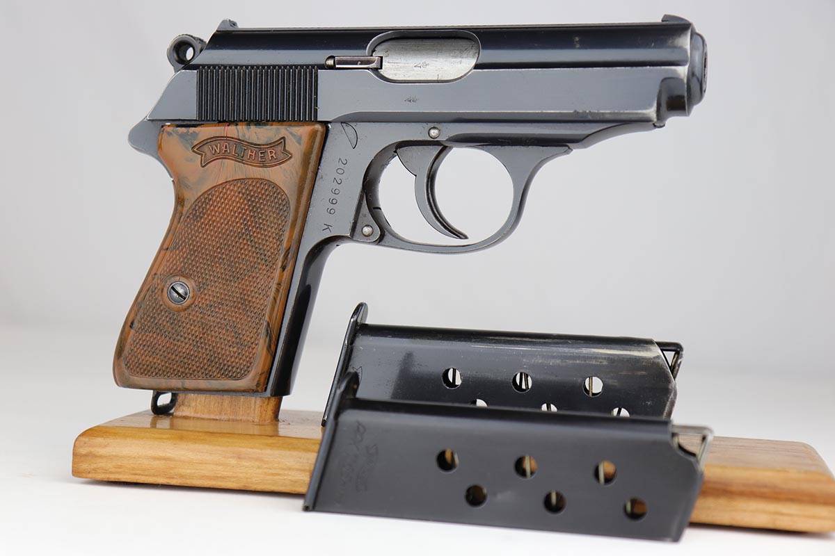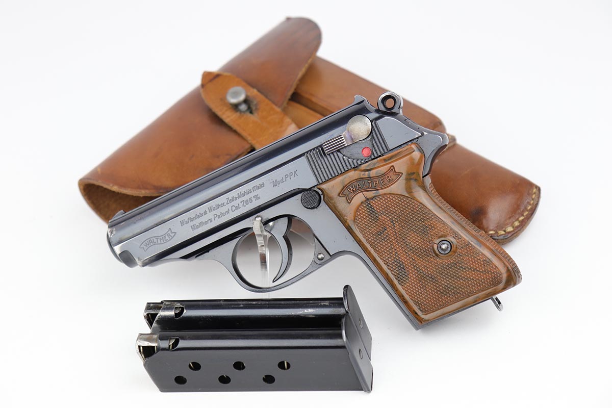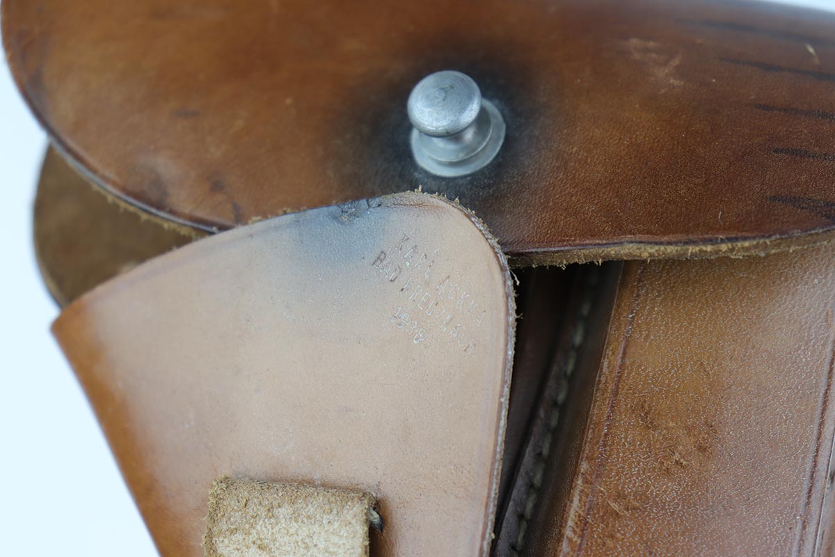 5/9/19 – This is a very nice example of a complete Walther PPK rig, made in 1939 for the German commercial market. The pistol retains 95-96% high-polish blue, with common muzzle wear on either side of the slide from being in the holster. Beautiful frame and excellent bore. Nice, original grip but it does have a few small surface cracks. Rig includes two total magazines, and a period original holster which is also dated to 1939 and has Karl Ackva maker mark. Just a very nice example of a Nazi era PPK rig, priced fairly.
