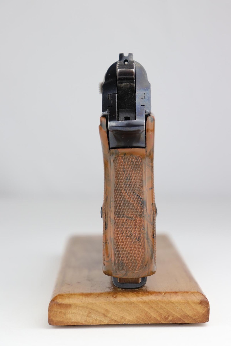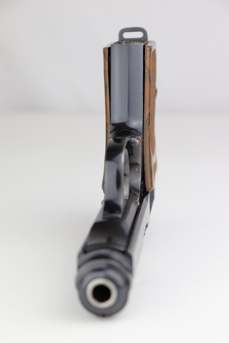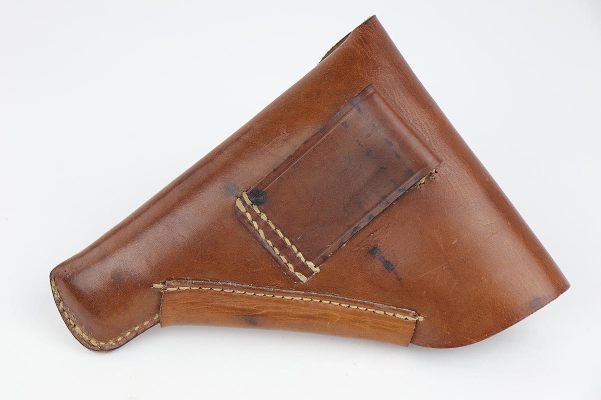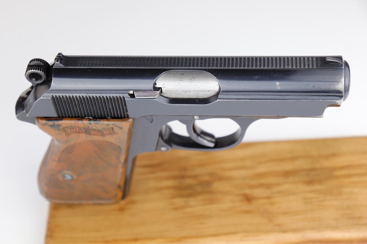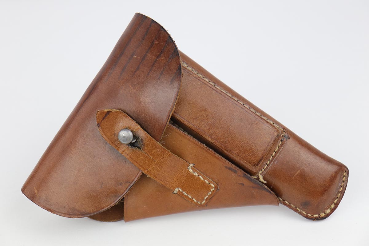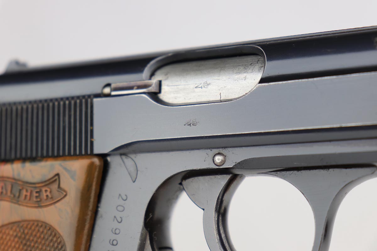 5/9/19 – This is a very nice example of a complete Walther PPK rig, made in 1939 for the German commercial market. The pistol retains 95-96% high-polish blue, with common muzzle wear on either side of the slide from being in the holster. Beautiful frame and excellent bore. Nice, original grip but it does have a few small surface cracks. Rig includes two total magazines, and a period original holster which is also dated to 1939 and has Karl Ackva maker mark. Just a very nice example of a Nazi era PPK rig, priced fairly.