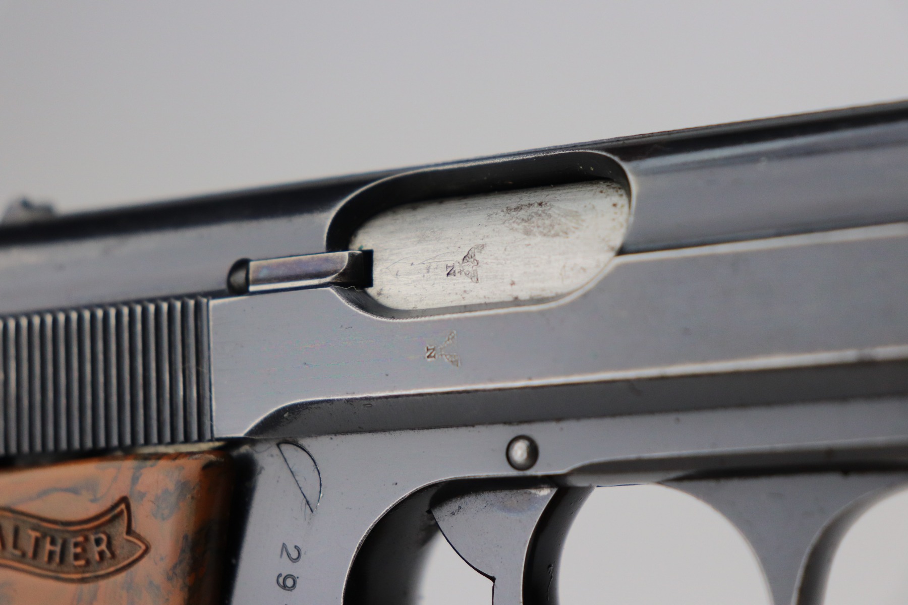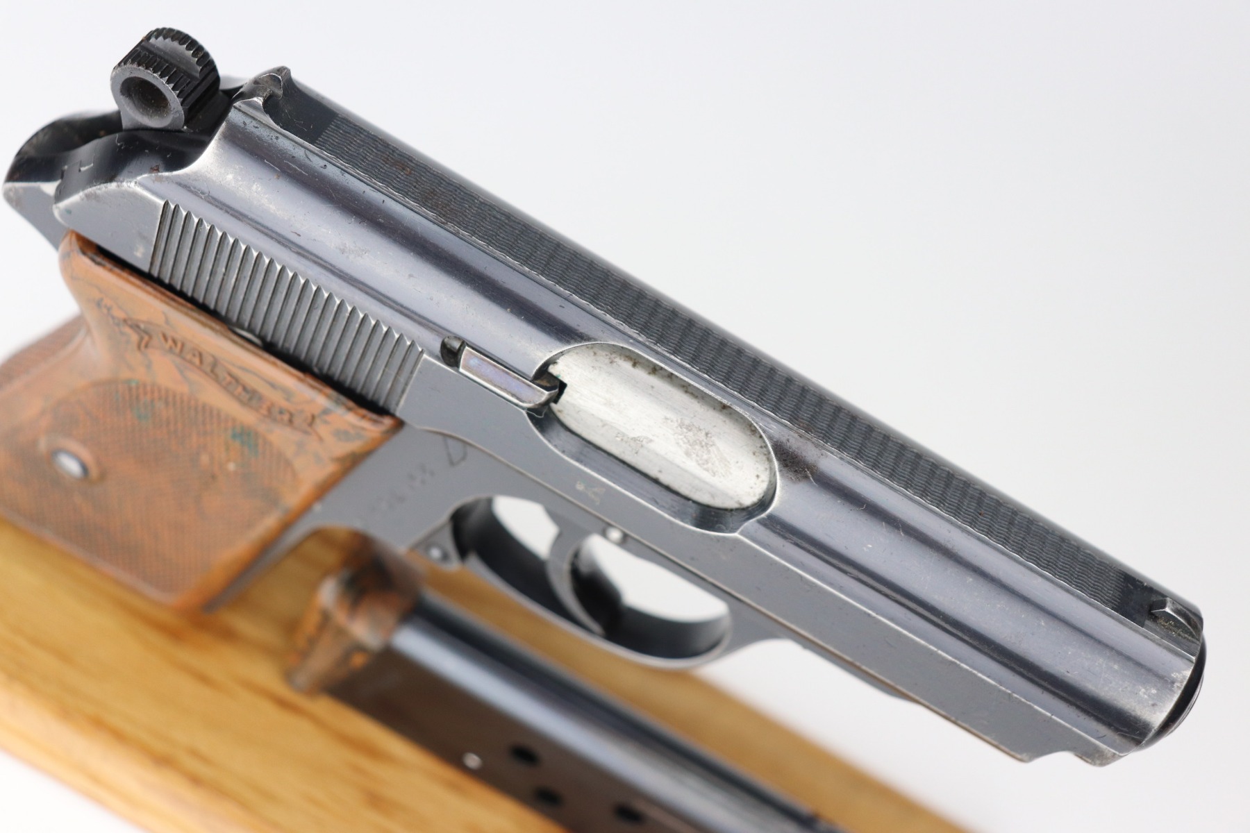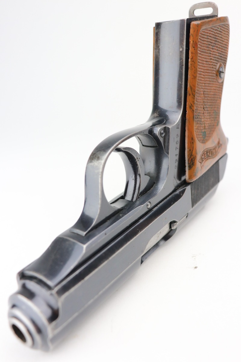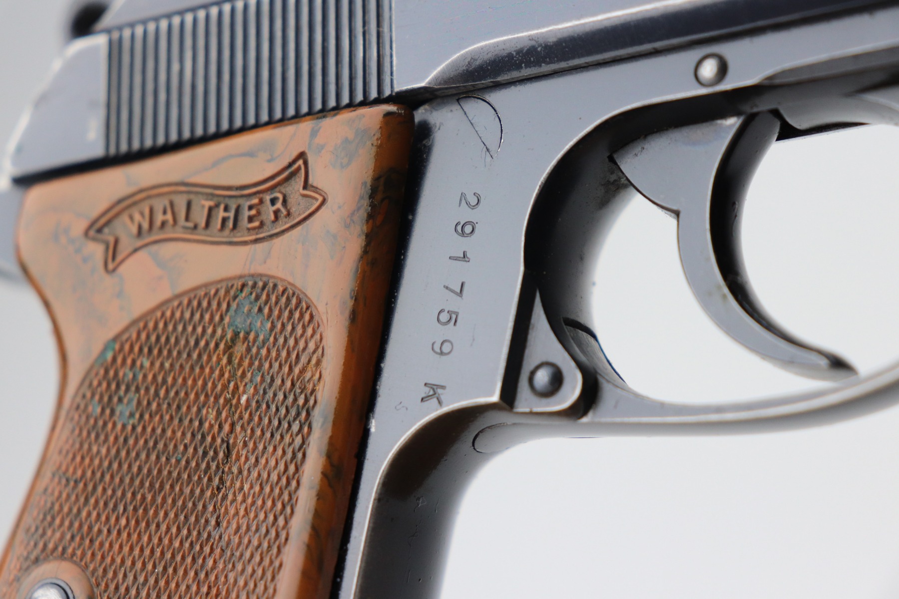 6/16/23 – This is a very nice example of a Walther PPK Rig sold in the commercial market in 1940. The gun is matching and has the proper “Eagle N” proofs. It comes with a fairly worn commercial holster, a banner-only finger extension magazine, and an un-marked flat bottom magazine. The gun has retained about 90-92% of its original bluing. There is minor wear around the muzzle and high edges. There is spotty wear on the front strap and left side of the slide. There are also small areas of pin-pricking around the muzzle. Comes with an excellent Walther grip. Excellent bore – shiny with strong rifling.