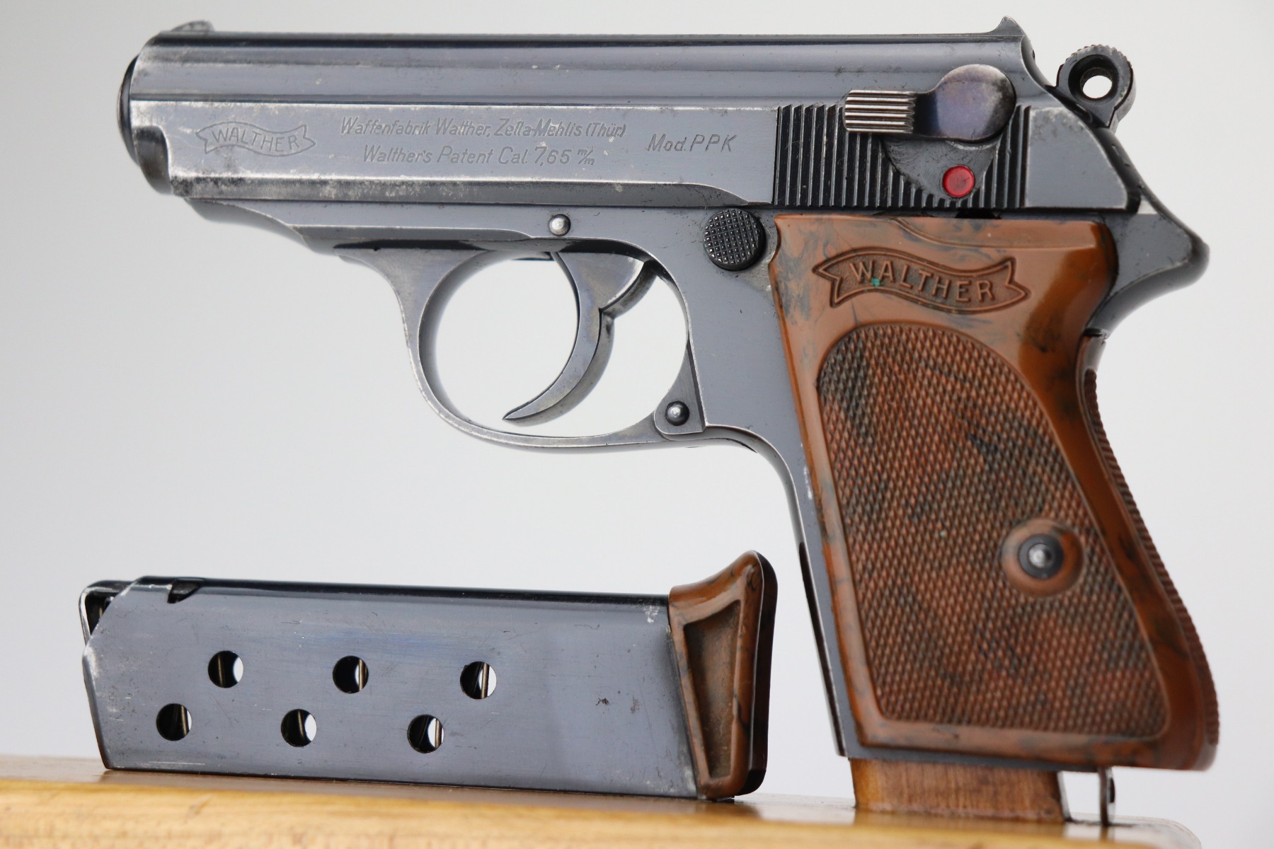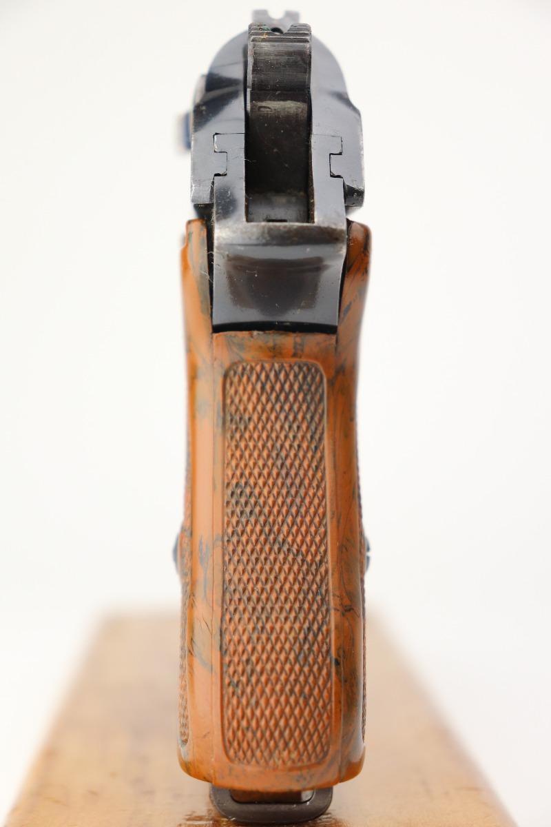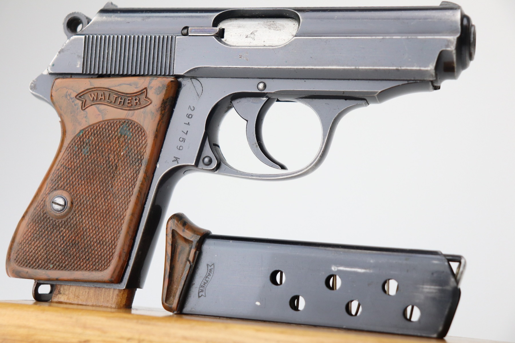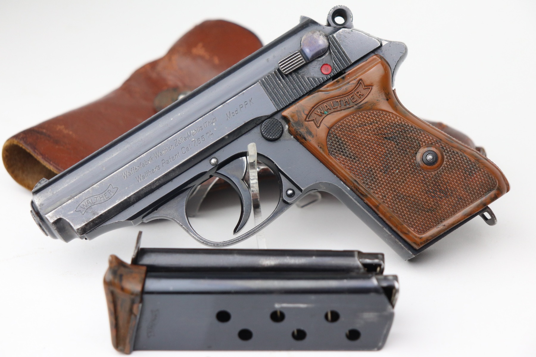 6/16/23 – This is a very nice example of a Walther PPK Rig sold in the commercial market in 1940. The gun is matching and has the proper “Eagle N” proofs. It comes with a fairly worn commercial holster, a banner-only finger extension magazine, and an un-marked flat bottom magazine. The gun has retained about 90-92% of its original bluing. There is minor wear around the muzzle and high edges. There is spotty wear on the front strap and left side of the slide. There are also small areas of pin-pricking around the muzzle. Comes with an excellent Walther grip. Excellent bore – shiny with strong rifling.