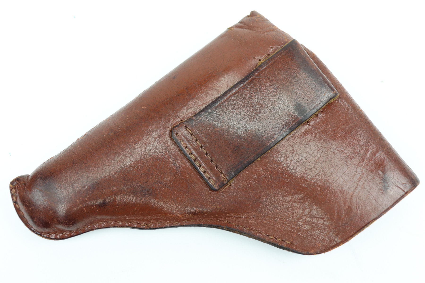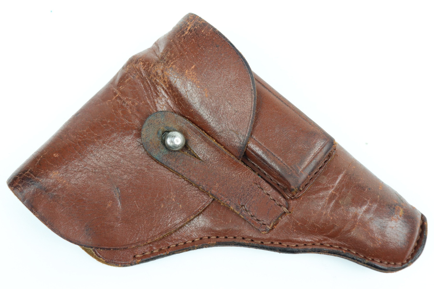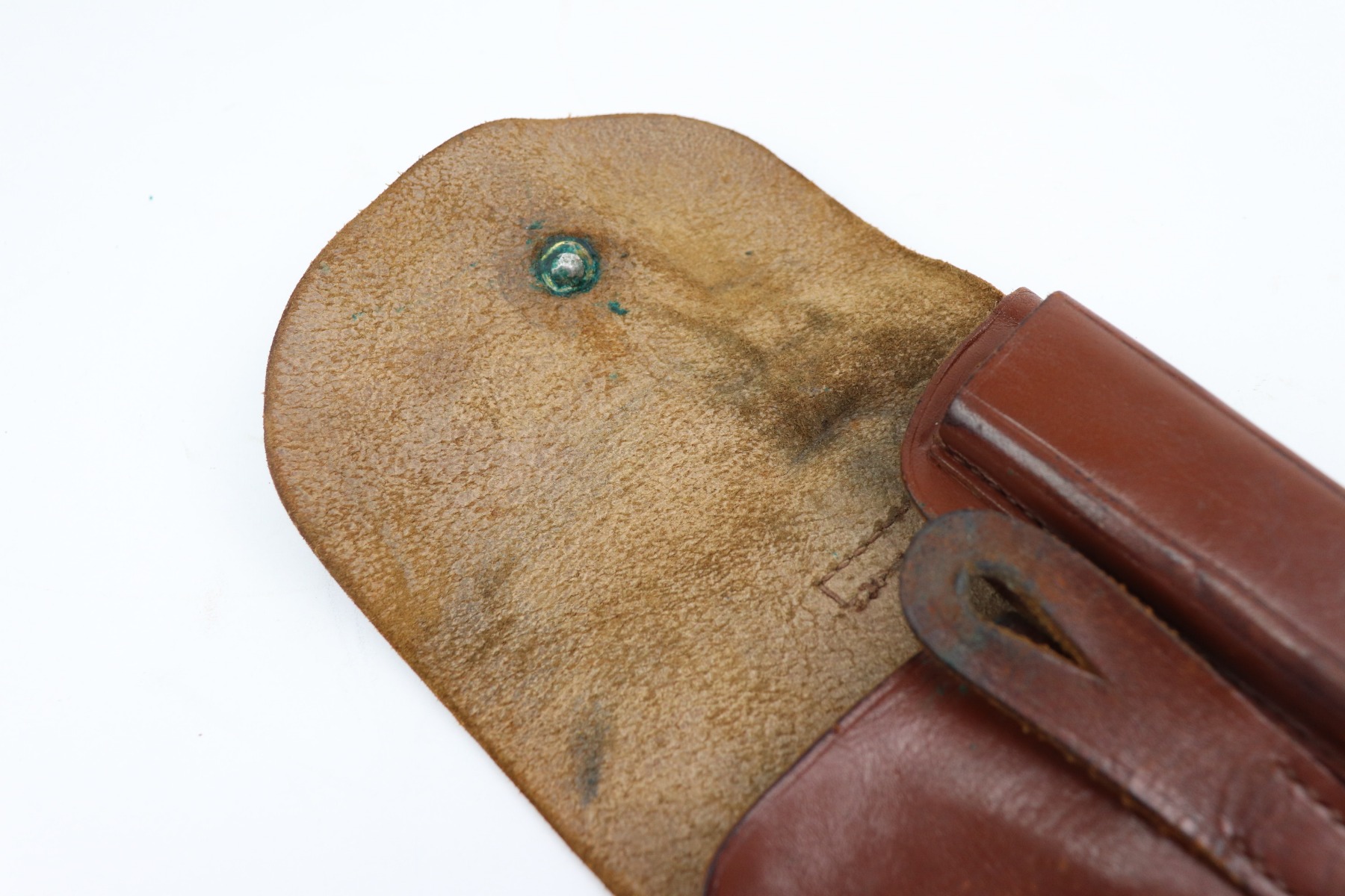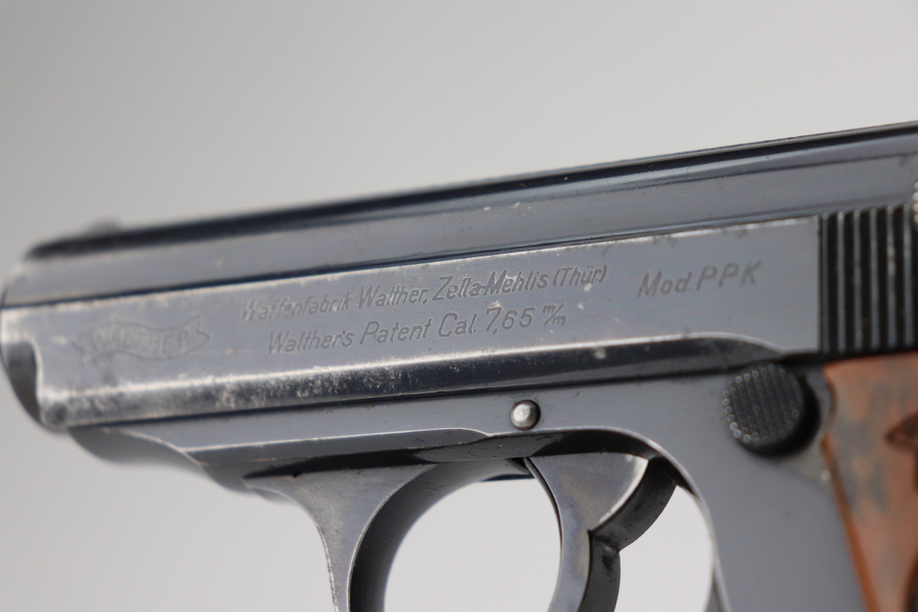 6/16/23 – This is a very nice example of a Walther PPK Rig sold in the commercial market in 1940. The gun is matching and has the proper “Eagle N” proofs. It comes with a fairly worn commercial holster, a banner-only finger extension magazine, and an un-marked flat bottom magazine. The gun has retained about 90-92% of its original bluing. There is minor wear around the muzzle and high edges. There is spotty wear on the front strap and left side of the slide. There are also small areas of pin-pricking around the muzzle. Comes with an excellent Walther grip. Excellent bore – shiny with strong rifling.