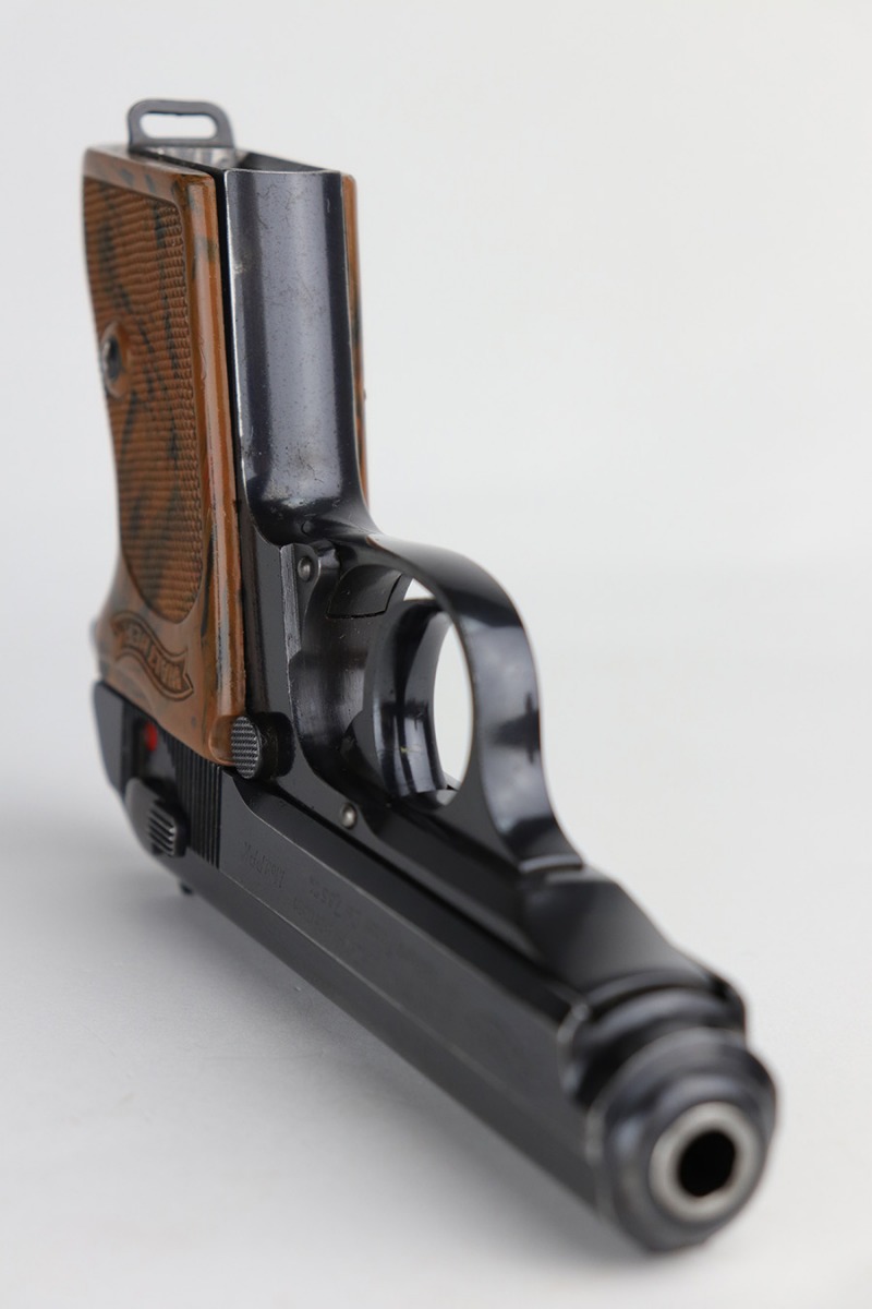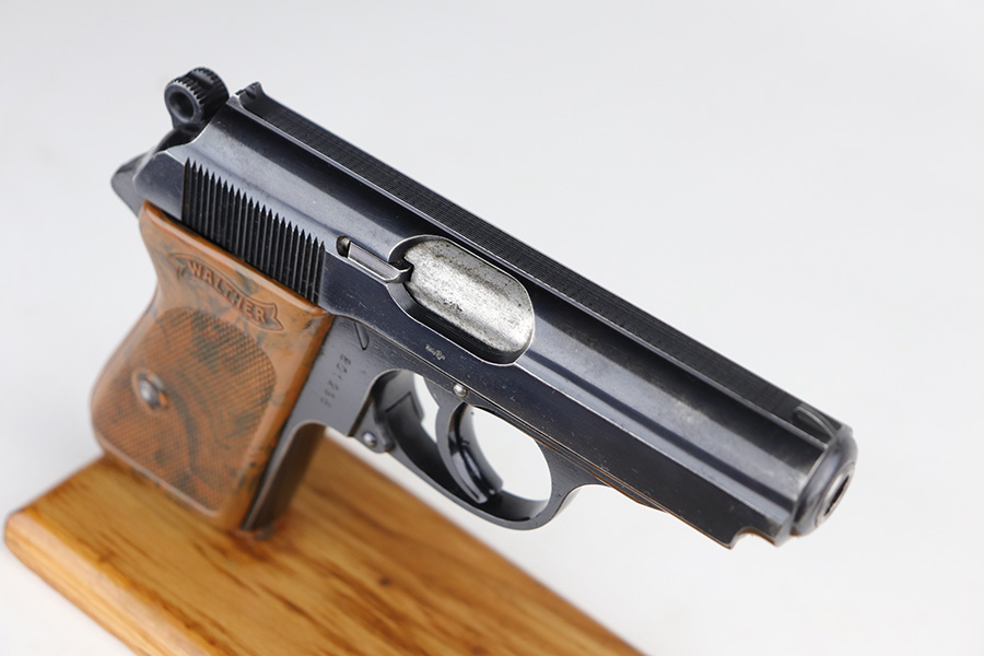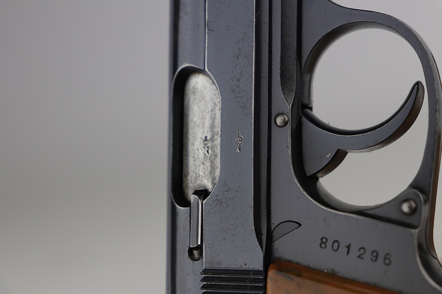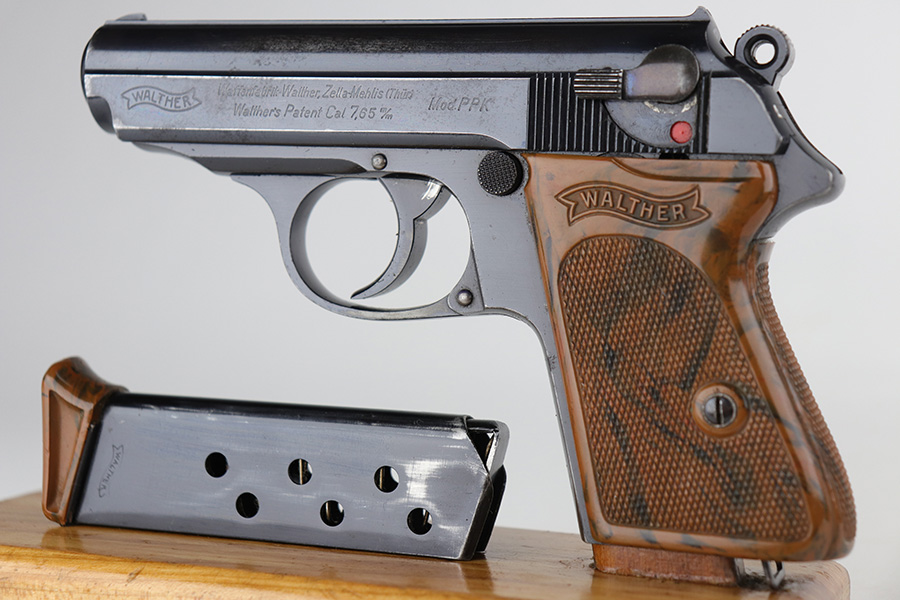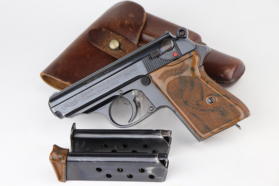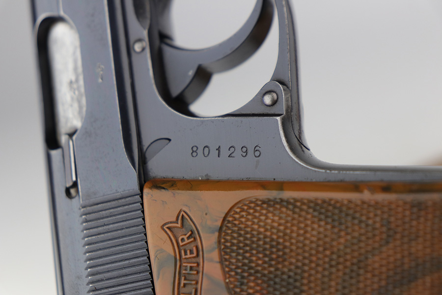 9/29/21 – This is a very nice example of a Walther PPK rig sold in the commercial market in 1934. It is all matching and has the proper “Crown N” commercial proofs. It comes with a nice period-correct Akah tan leather holster, a proper Walther banner-only finger extension magazine, and a proper banner-only flat bottom magazine. The gun has retained about 93% of its original finish. There is minor wear on the high edges of the slide and around the muzzle. Some minor wear on the round edges of both sides of the slide. Minor spotty wear on the front strap. Tiny dots of oxidation throughout, most noticeable on the left side of the slide. Comes with an excellent brown Walther grip – some small scratches around the escutcheon on the right side. The bore is mint.