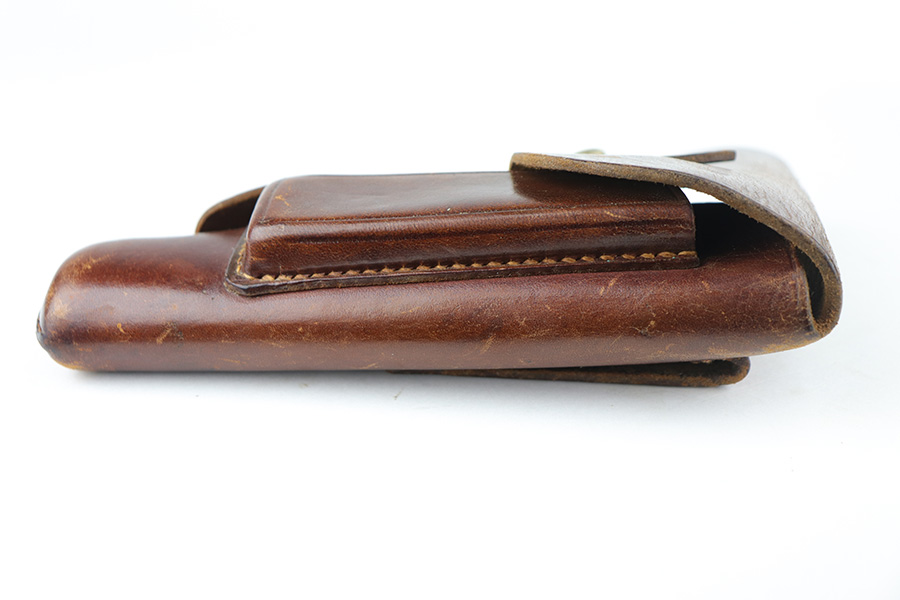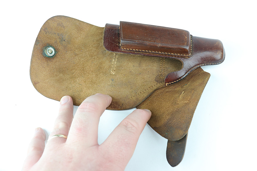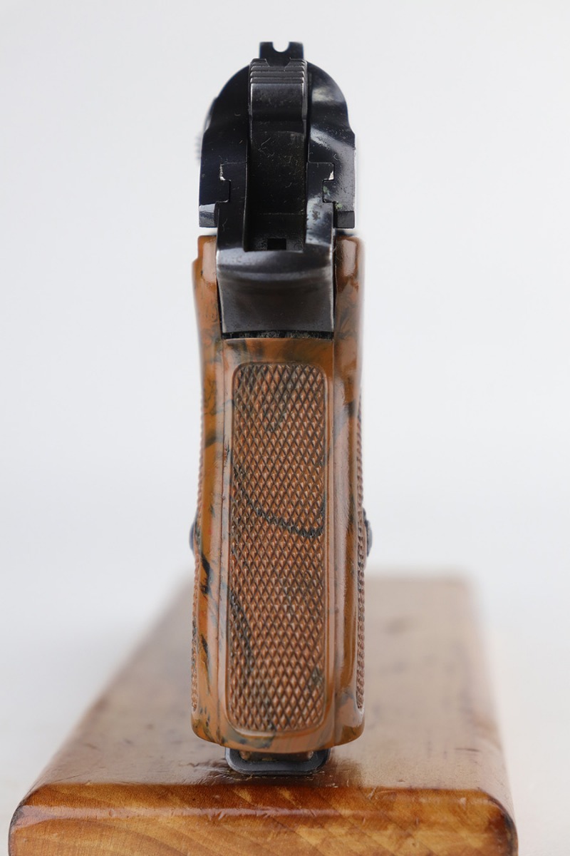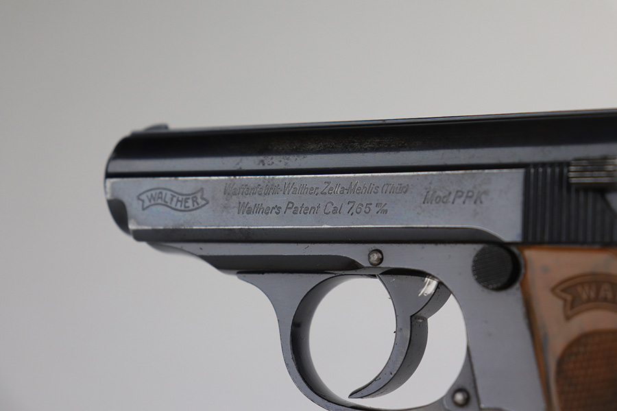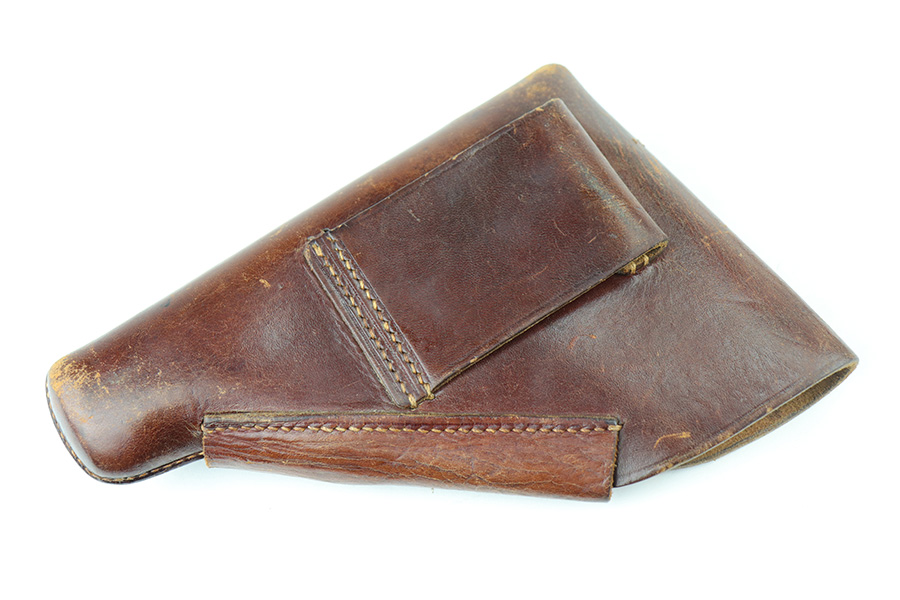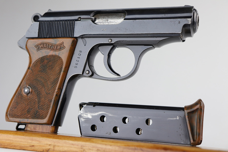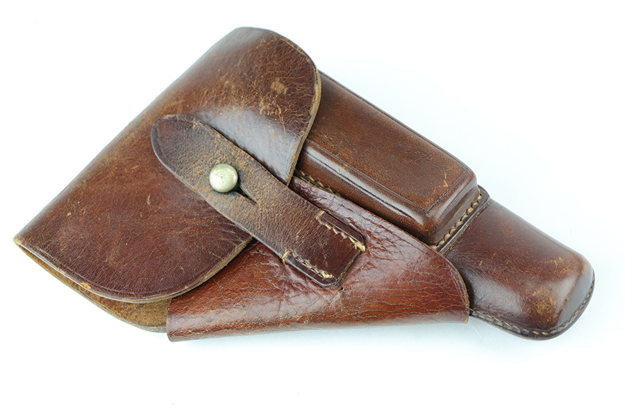 9/29/21 – This is a very nice example of a Walther PPK rig sold in the commercial market in 1934. It is all matching and has the proper “Crown N” commercial proofs. It comes with a nice period-correct Akah tan leather holster, a proper Walther banner-only finger extension magazine, and a proper banner-only flat bottom magazine. The gun has retained about 93% of its original finish. There is minor wear on the high edges of the slide and around the muzzle. Some minor wear on the round edges of both sides of the slide. Minor spotty wear on the front strap. Tiny dots of oxidation throughout, most noticeable on the left side of the slide. Comes with an excellent brown Walther grip – some small scratches around the escutcheon on the right side. The bore is mint.