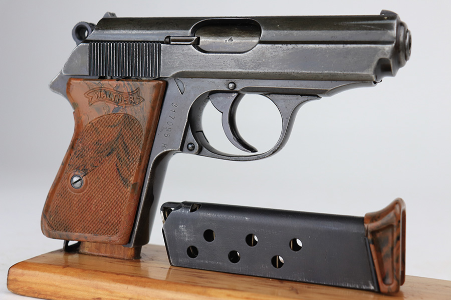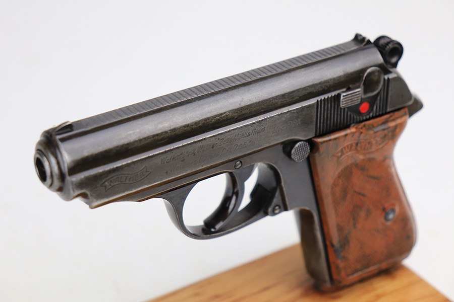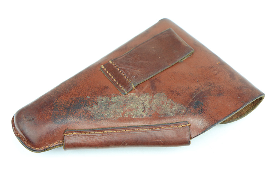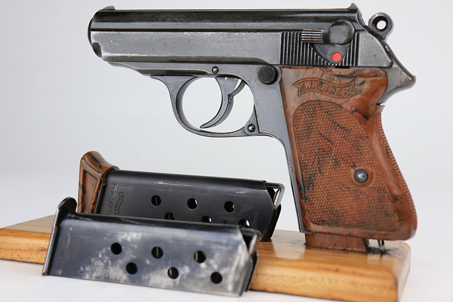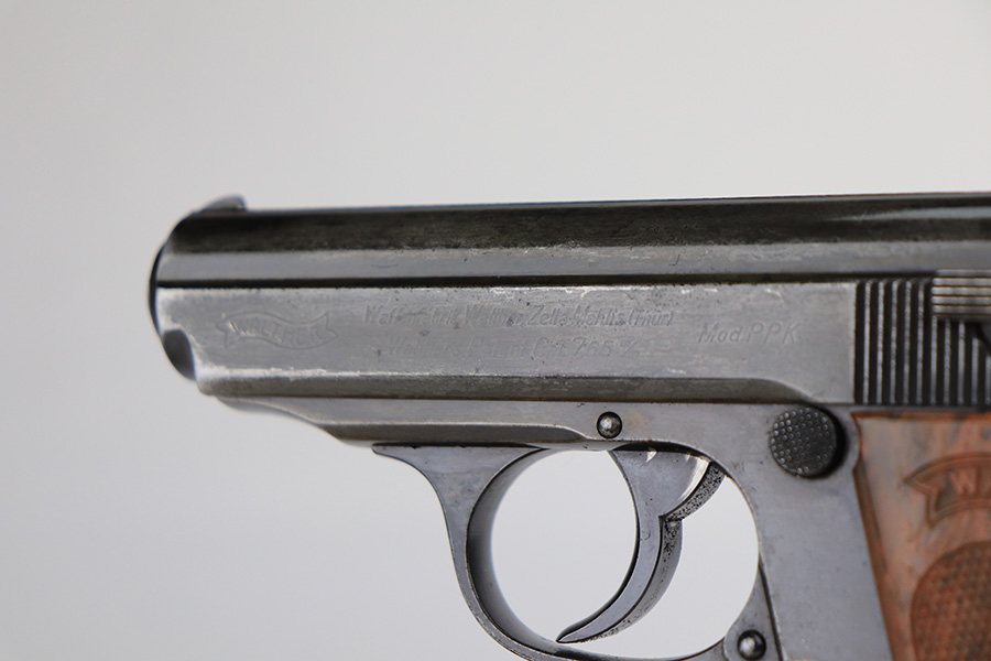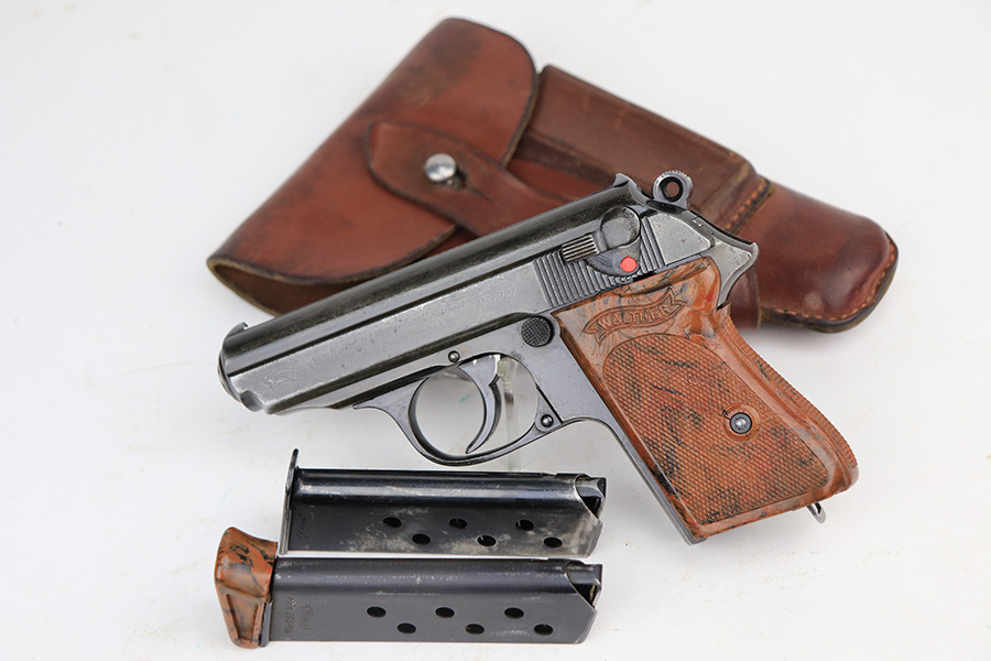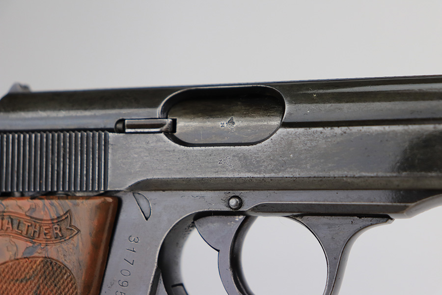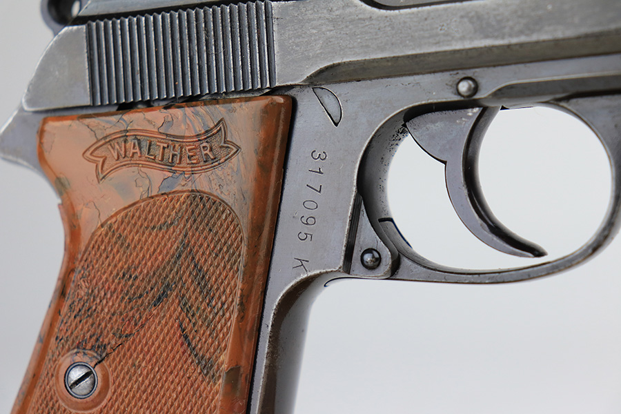 1/11/22 – This is a nice example of a Walther PPK sold in the commercial market in 1941. It is all matching and has the proper “Eagle N” commercial proofs. It comes with a nice un-marked generic WW2-era holster (some adhesive on the back from what looks like a strip of tape), a proper wartime finger extension magazine, and one Walther banner-only flat bottom magazine. The gun has retained roughly 65% of its original finish. There is noticeable wear throughout, most obvious on the whole slide and front strap. There are also some areas with tiny dots of pin-pricking on both sides of the slide and on the front strap. Comes with a nice period-correct brown grip. There is light “flaking” in the bakelite on both sides, a small crack in the spine, and a tiny crack around the left screw hole. The bore is near-mint.