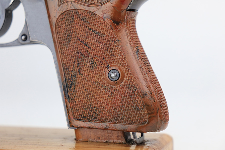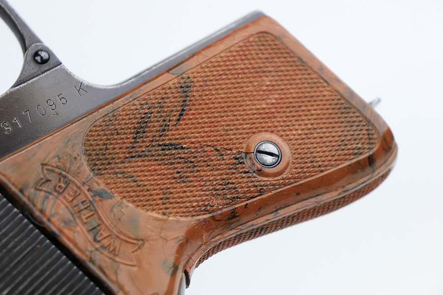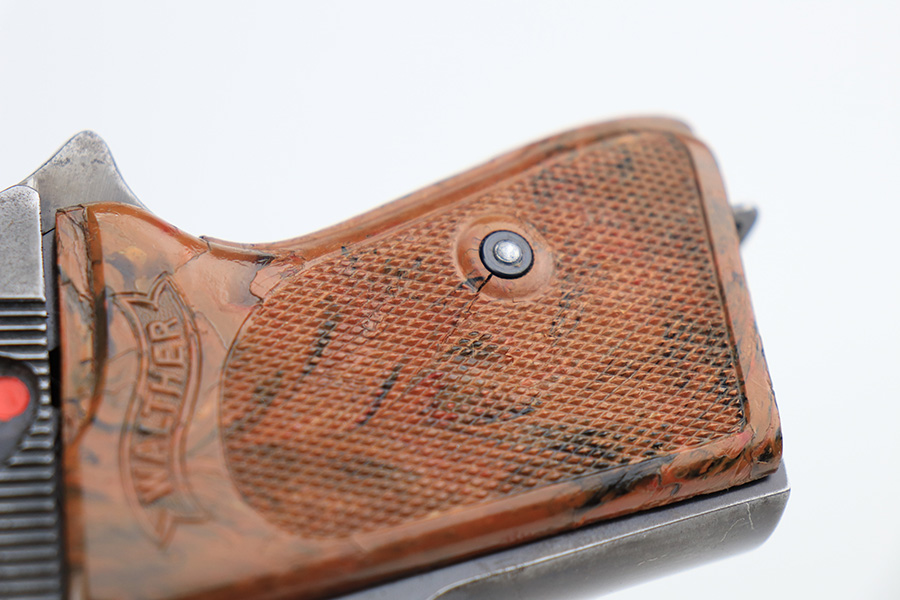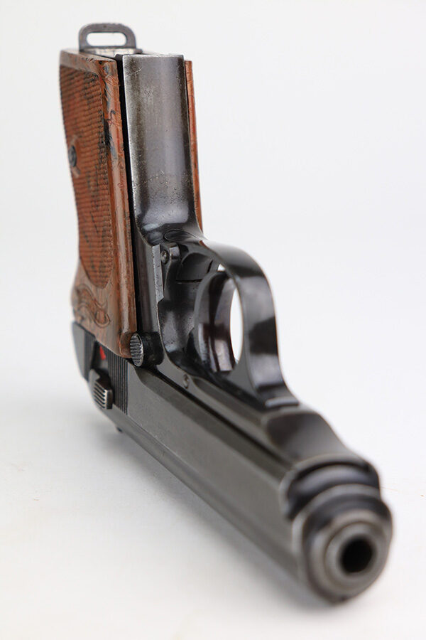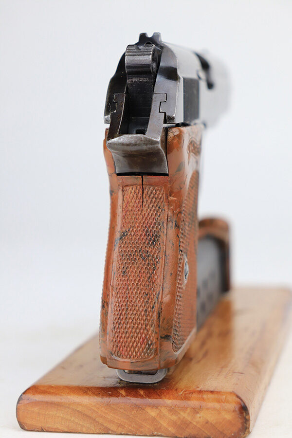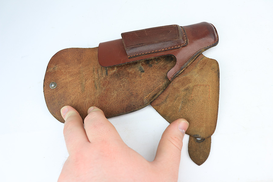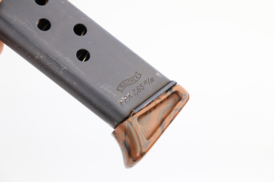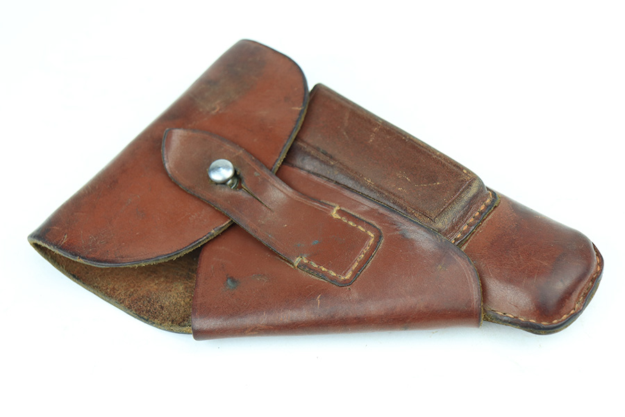 1/11/22 – This is a nice example of a Walther PPK sold in the commercial market in 1941. It is all matching and has the proper “Eagle N” commercial proofs. It comes with a nice un-marked generic WW2-era holster (some adhesive on the back from what looks like a strip of tape), a proper wartime finger extension magazine, and one Walther banner-only flat bottom magazine. The gun has retained roughly 65% of its original finish. There is noticeable wear throughout, most obvious on the whole slide and front strap. There are also some areas with tiny dots of pin-pricking on both sides of the slide and on the front strap. Comes with a nice period-correct brown grip. There is light “flaking” in the bakelite on both sides, a small crack in the spine, and a tiny crack around the left screw hole. The bore is near-mint.