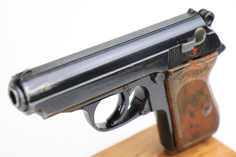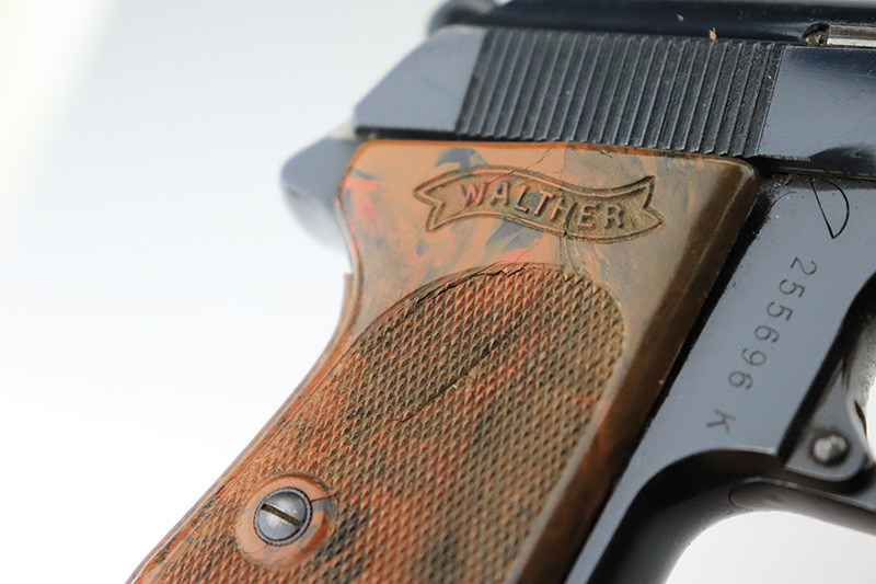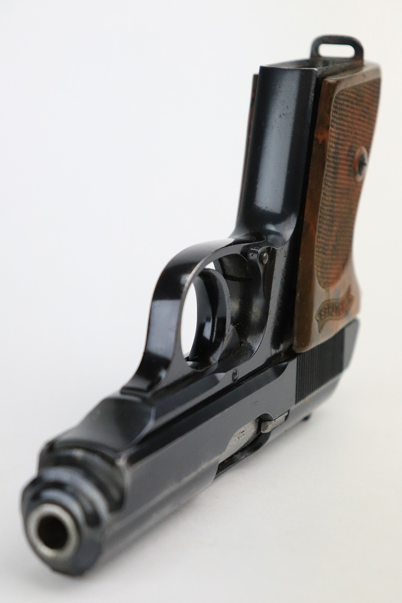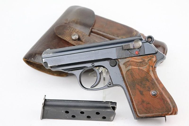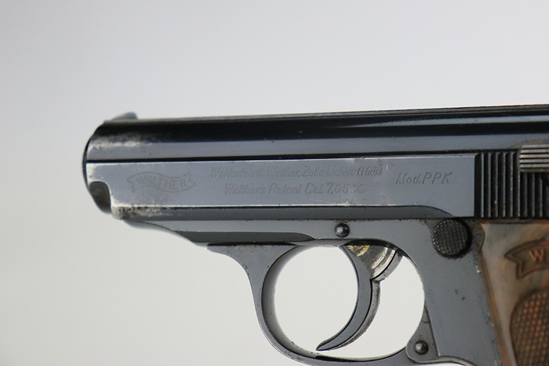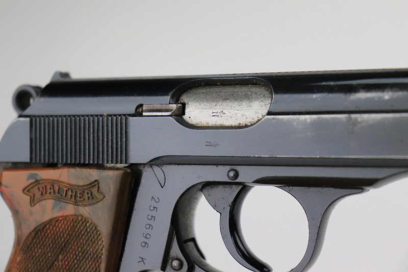 8/25/22 – This is a very nice example of a Walther PPK sold in the commercial market in 1939. The gun is all matching and has the proper “Crown N” proofs. It comes as a rig with one period-correct Walther banner-only magazine and a fairly worn period-correct generic holster. The gun itself has retained about 94% of its original high polish finish. There is wear around the muzzle, but the most noticeable sign of finish loss is spotty wear and a couple of small spots of oxidation along the right side of the slide. Comes with a period-correct brown Walther grip – a few hairline cracks on the right side. The bore is near-mint. The hold-open does not work properly unless applying pressure to the magazine bottom.