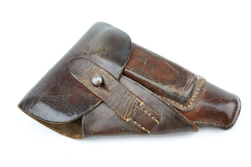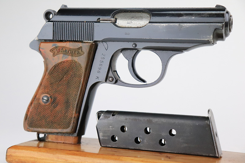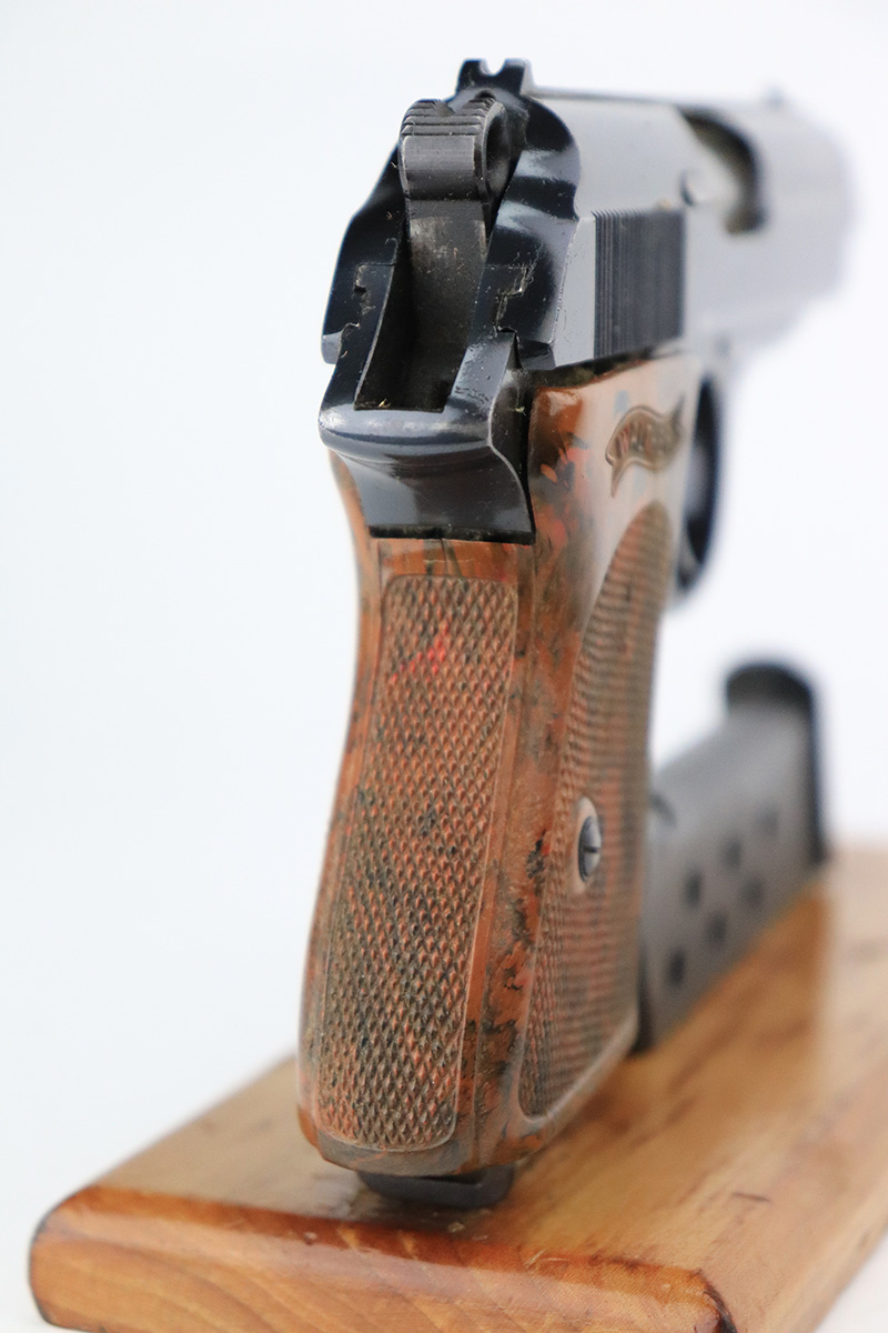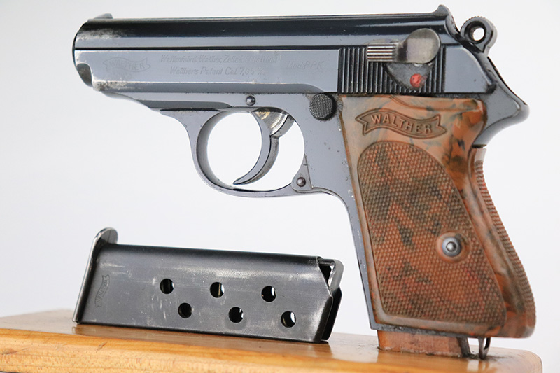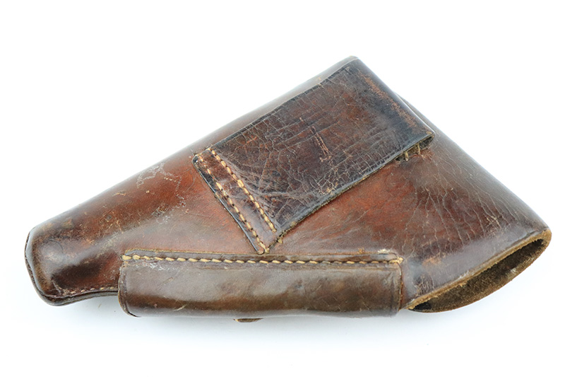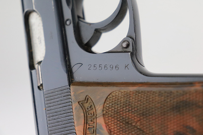 8/25/22 – This is a very nice example of a Walther PPK sold in the commercial market in 1939. The gun is all matching and has the proper “Crown N” proofs. It comes as a rig with one period-correct Walther banner-only magazine and a fairly worn period-correct generic holster. The gun itself has retained about 94% of its original high polish finish. There is wear around the muzzle, but the most noticeable sign of finish loss is spotty wear and a couple of small spots of oxidation along the right side of the slide. Comes with a period-correct brown Walther grip – a few hairline cracks on the right side. The bore is near-mint. The hold-open does not work properly unless applying pressure to the magazine bottom.