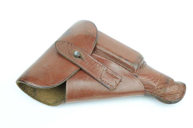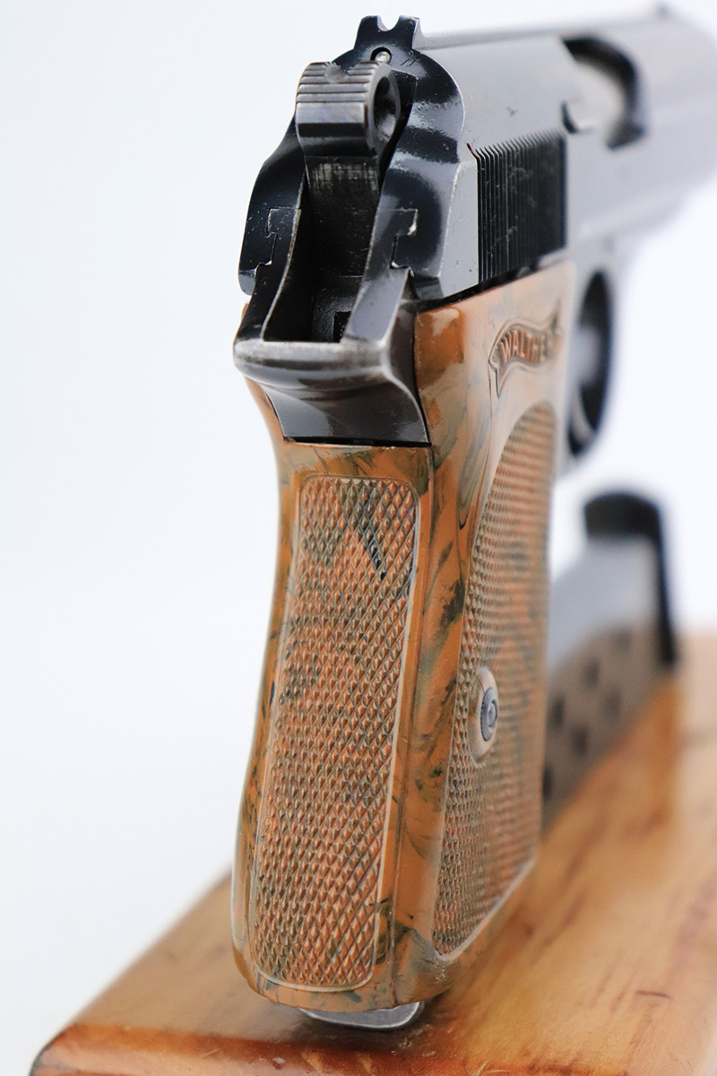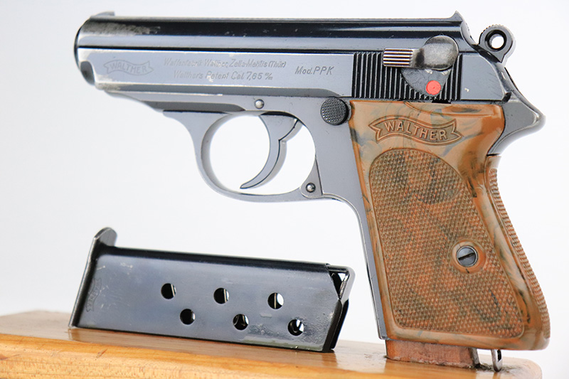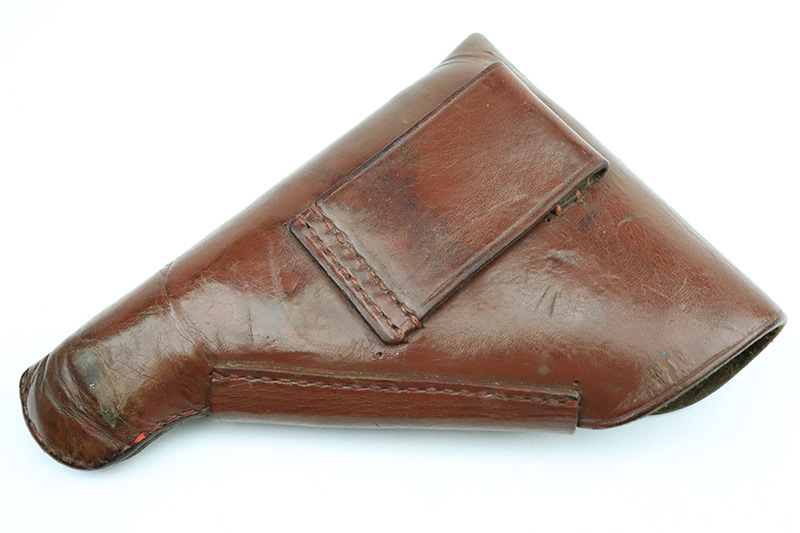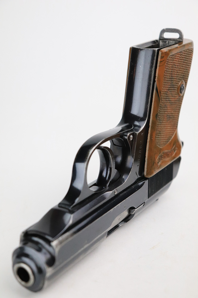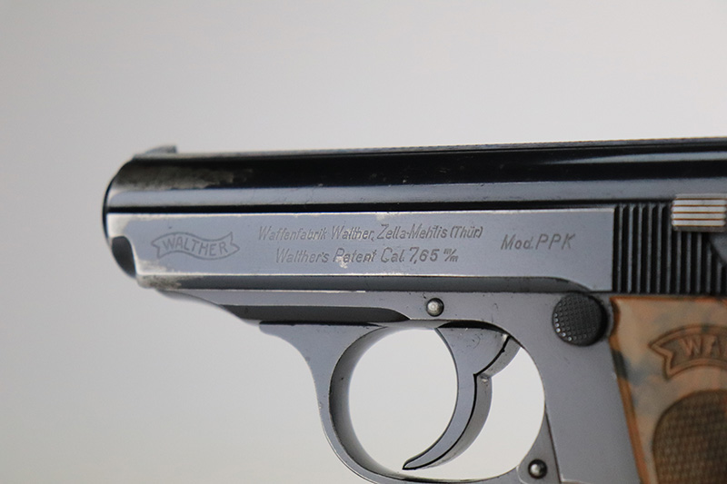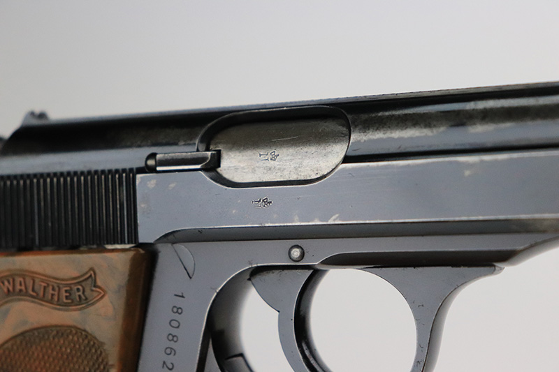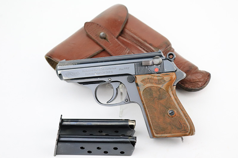 9/28/22 – This is a nice example of a Walther PPK sold in the commercial market in 1938. It is all matching and has the proper “Crown N” commercial proofs. It comes as a rig with a generic un-marked tan leather holster, one proper Walther banner-only magazine, and one post-war magazine. The gun has retained somewhere between 85-90% of its original high polish finish. There is obvious spotty wear along both sides of the slide, mostly around the muzzle end (areas of minor pin-pricking in the same areas). Some light spotty wear on the front strap. Comes with a very nice brown Walther grip (hairline crack on the right side). Mint bore.