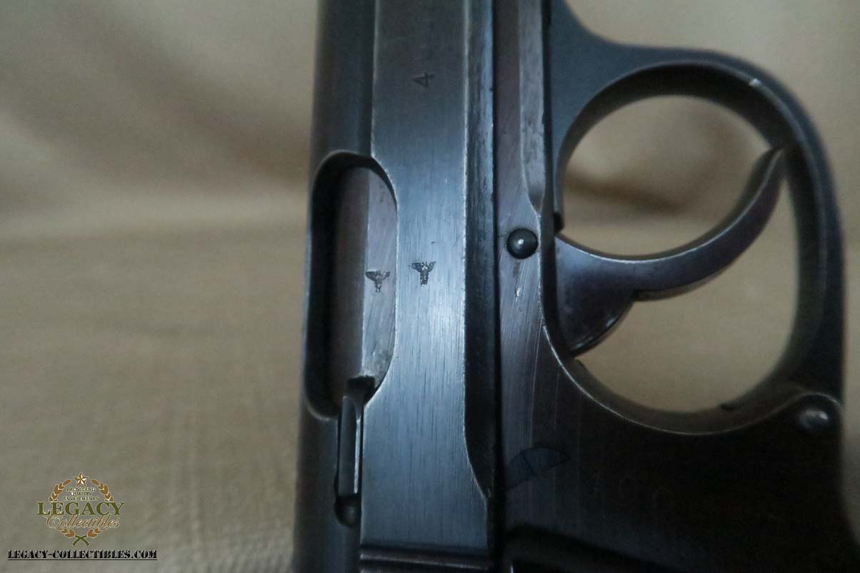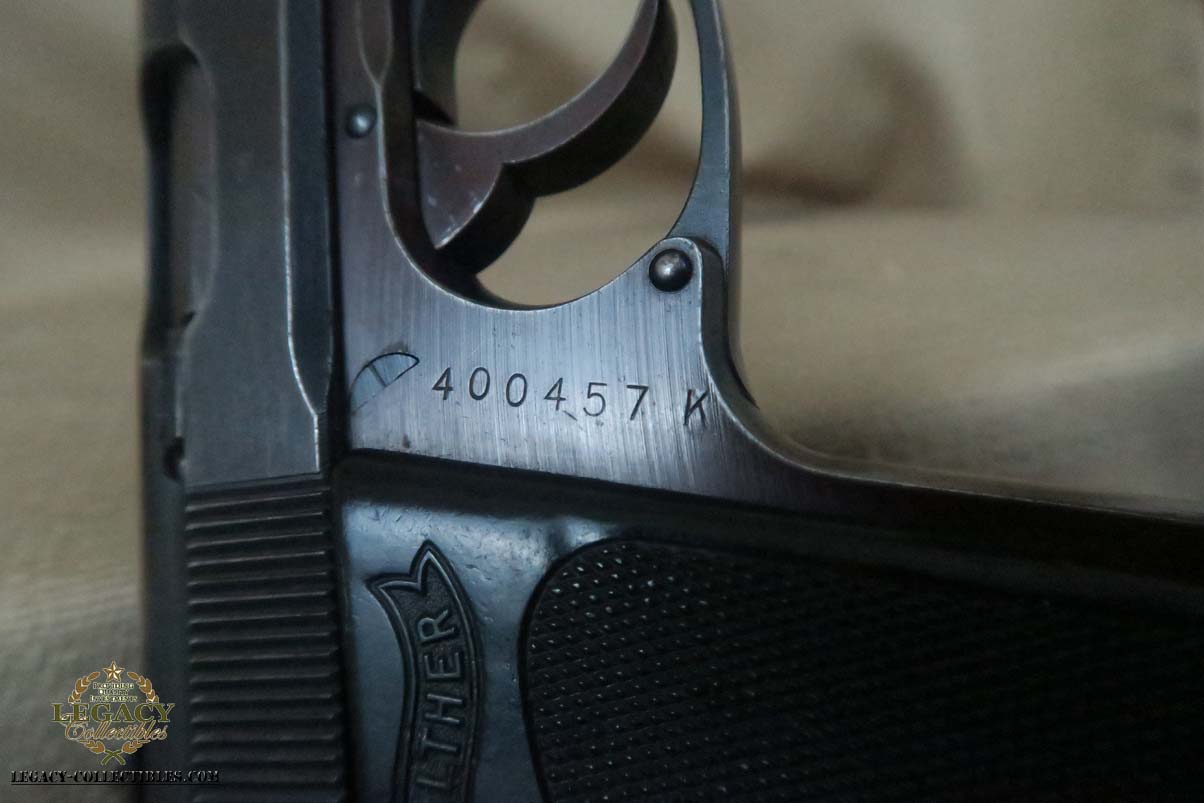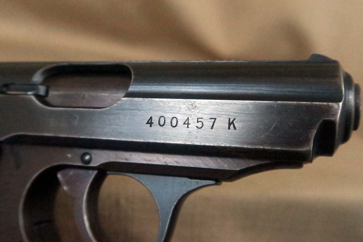 1/4/2017 – This is a nice Walther PPK from World War II. The serial number puts it in the SS range and it was most likely an SS contract pistol. It should have a numbered baseplate, but has the finger extension magazine. We are pricing this as a regular commercial PPK. It has a nice black grip and black finger extension magazine. All matching parts. Excellent bore. Very cool commercial PPK!