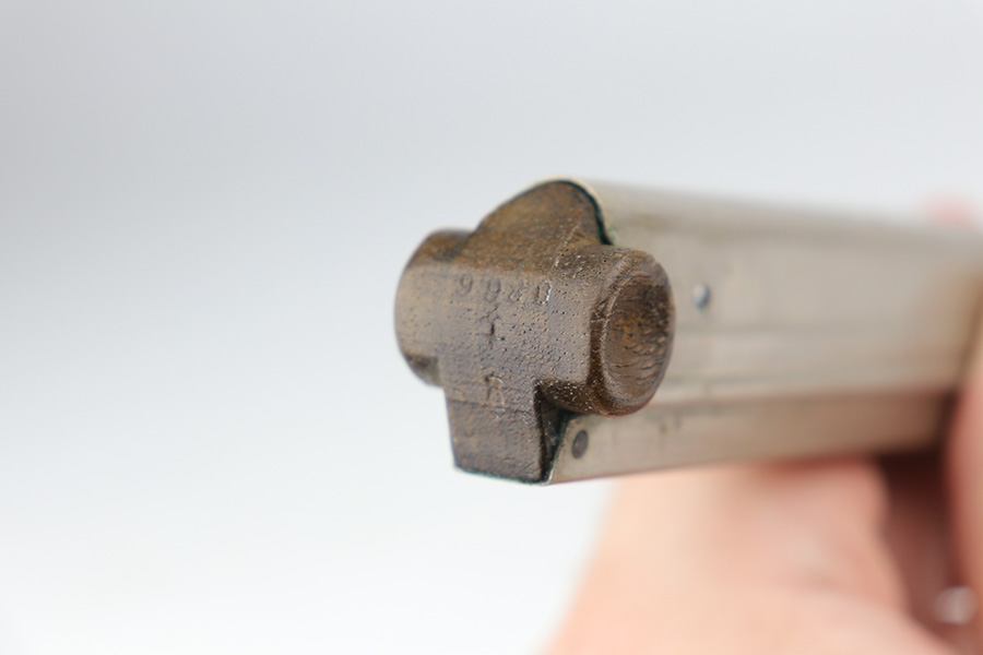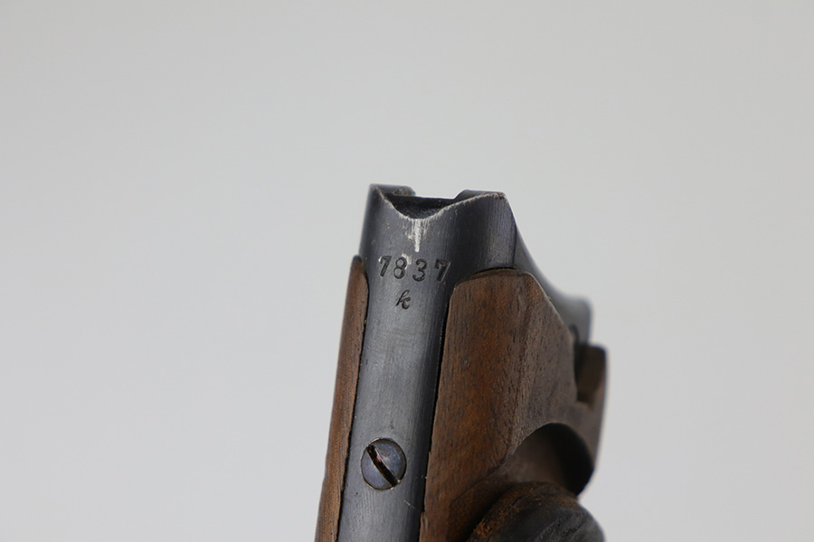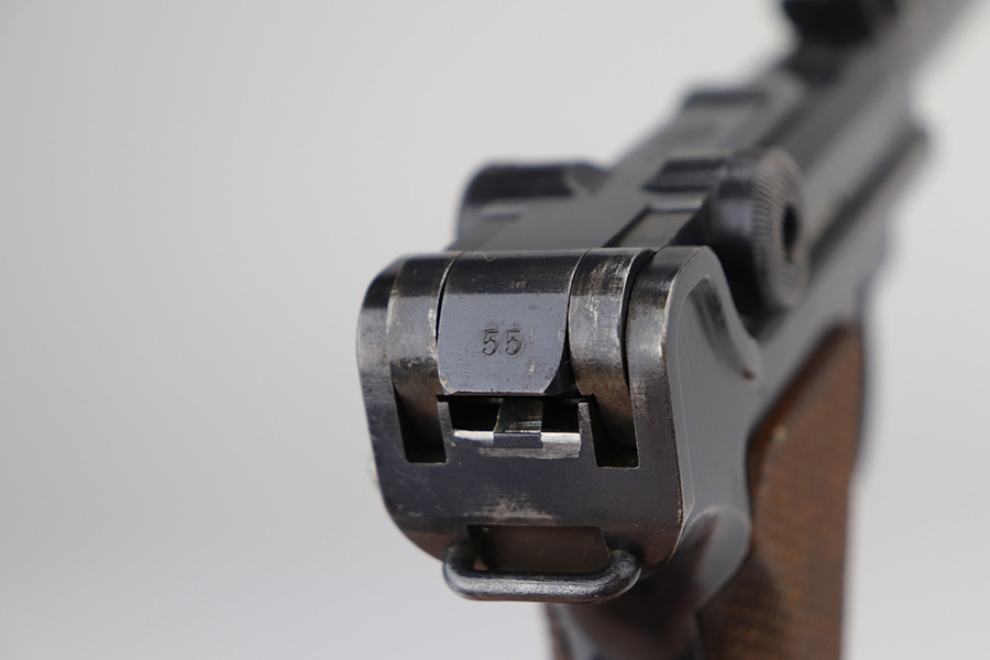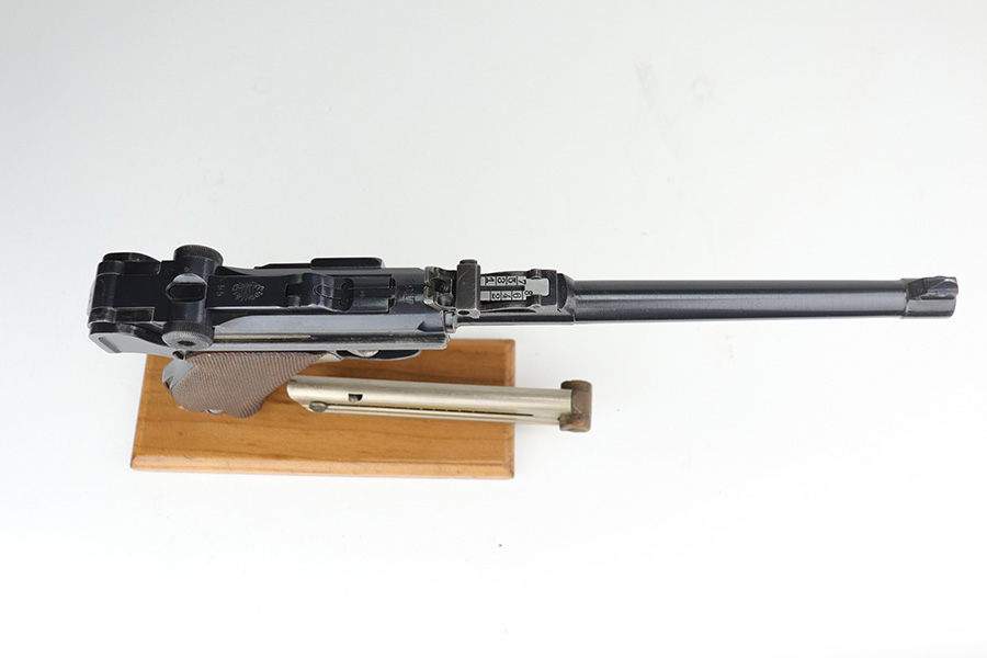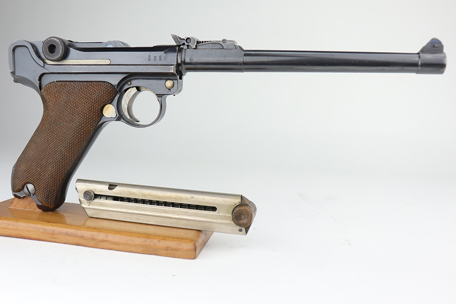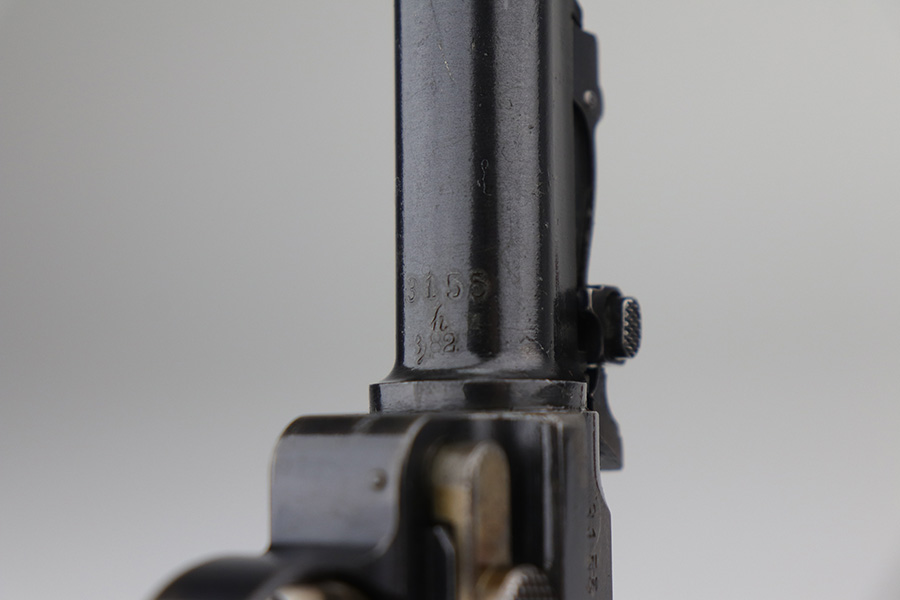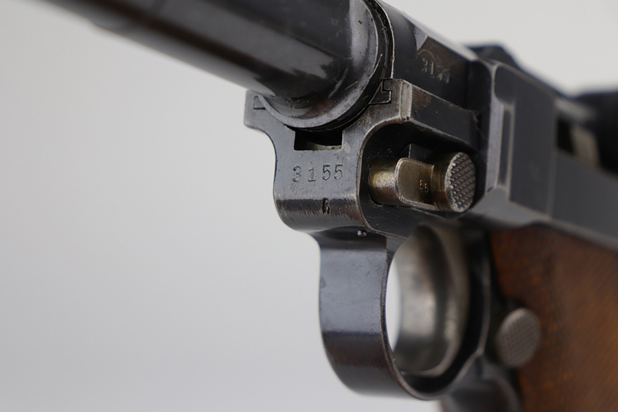 9/1/21 – This is a very nice example of a complete DWM Artillery Luger Rig issued to the Imperial German Army in 1917. The gun is all matching and has the proper Imperial proofs. The rig comes complete with a period-correct holster, shoulder stock (not matching), leather shoulder strap, magazine pouch, original cleaning rod, an Imperial marked Luger tool, and two magazines. One of the magazines is matching to the gun but has been re-numbered. The shoulder stock is Imperial proofed, but someone wrote their name on it, possibly the GI who captured it. The closure strap on the holster is a little weak. The gun has retained about 93-94% of its original finish. There are areas of minor wear around the muzzle, on the side plate, on the side rails, and at the base of the straps. Some minor handling marks on the straps. Comes with excellent matching grips. The bore has strong rifling with areas of minor freckling throughout.