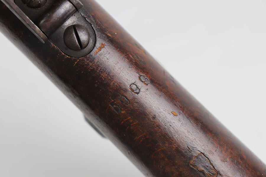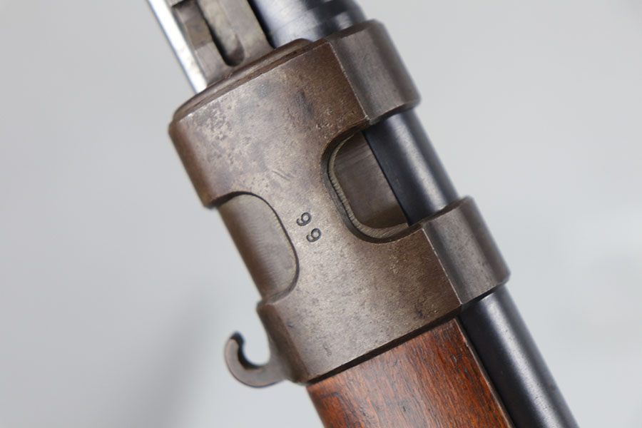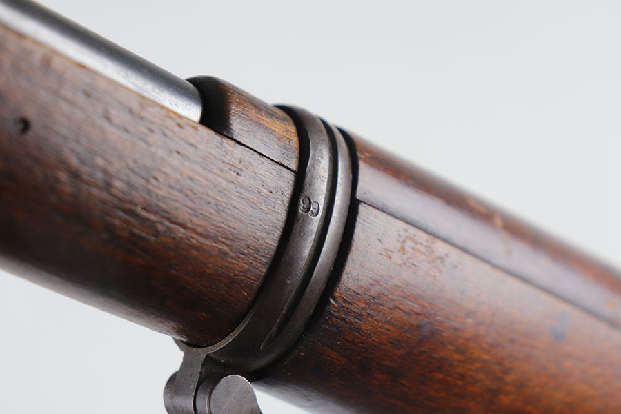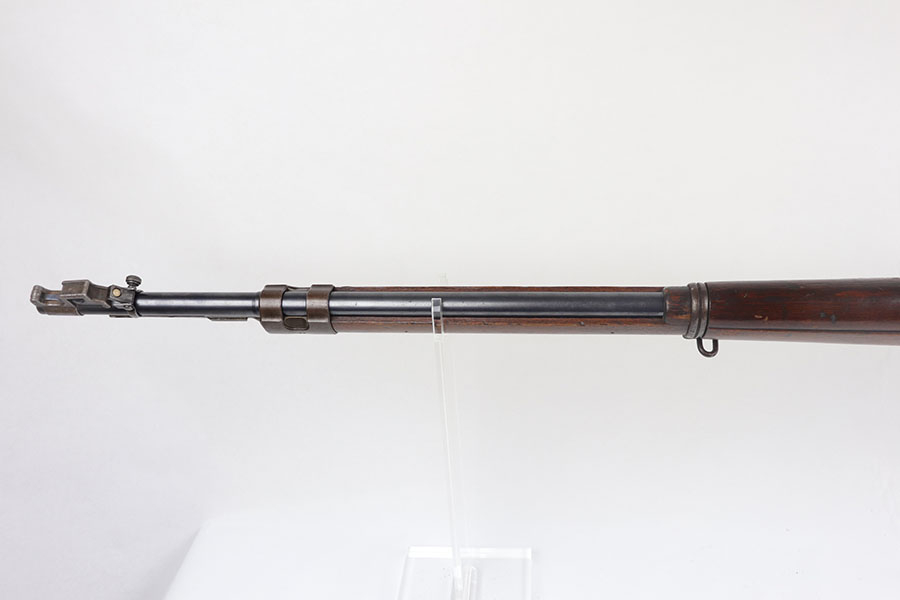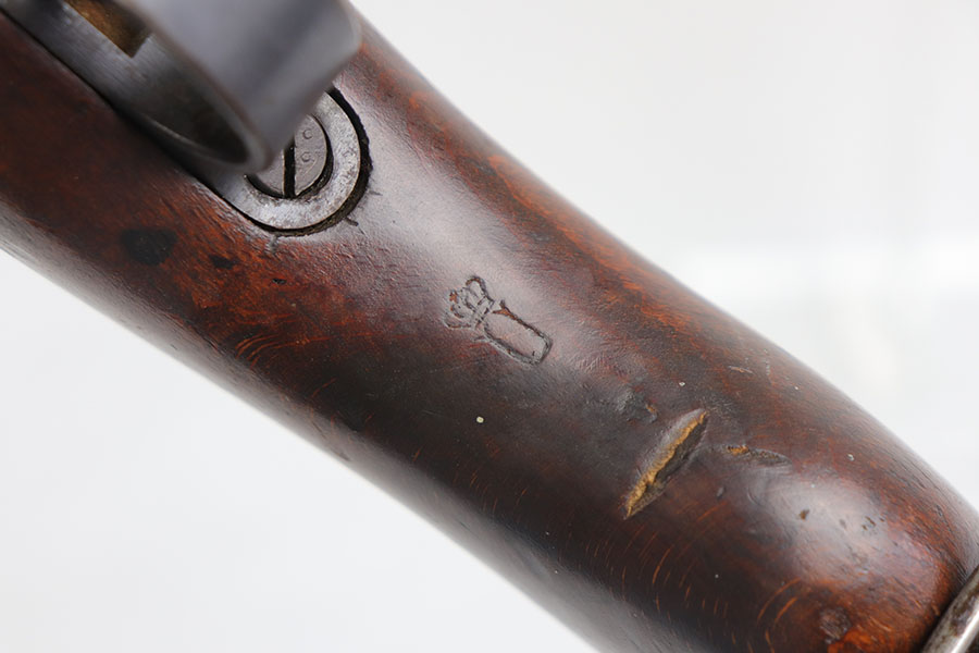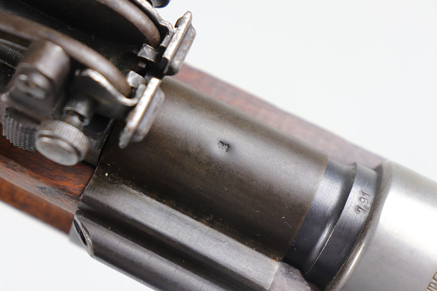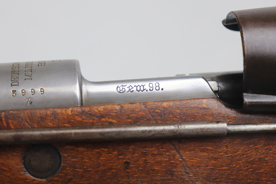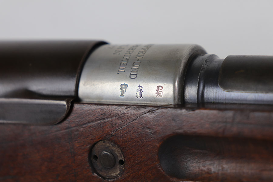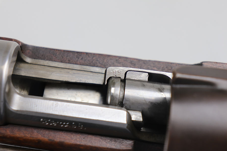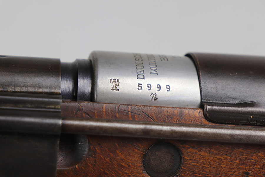 8/13/20 – This is an all matching and original DWM Gewehr 98 in uncommonly seen condition and configuration. This rifle has many especially cool features to it, so we’ll start with the basics. All numbered parts are matching, including the stock and all the way down to the cleaning rod. Secondly, this rifle has especially nice bluing remaining in all finished areas, with some patina on the bands and trigger group but minimal bluing loss overall. The birch wood stock is in very good condition with crisp imperial proofs in several areas. There are a few dings and nicks, most notably on the underside (towards the butt). The rare dust cover is also present, but what makes this an especially rare example is the night sight assembly that incorporates both the front and rear sight, and the unique dust cover assembly. The night sight assembly alone can sell for over $1500! Bore is shiny with strong rifling and minor sign of use.