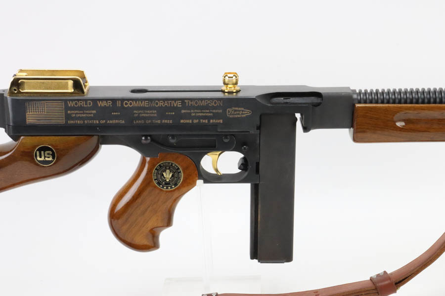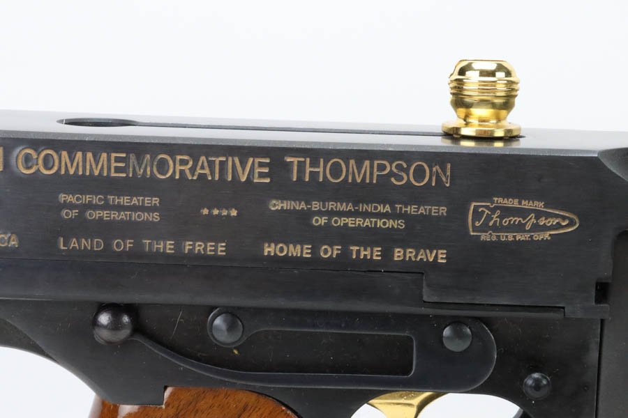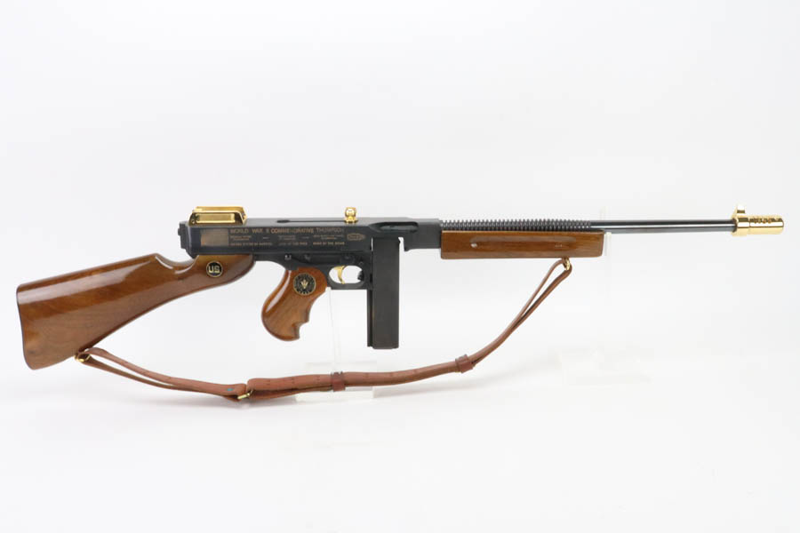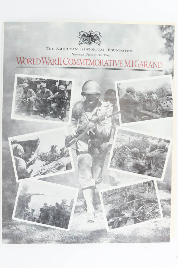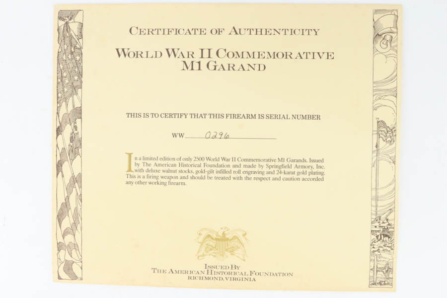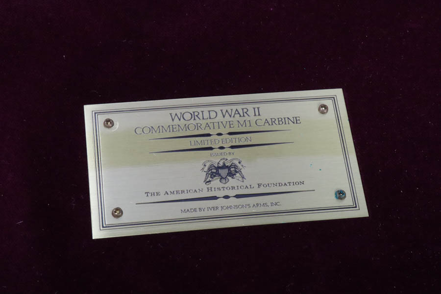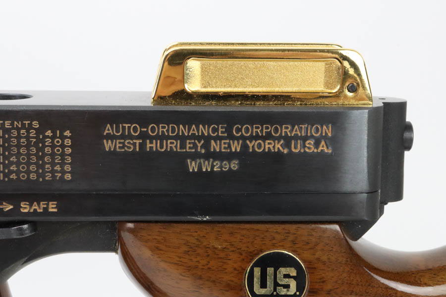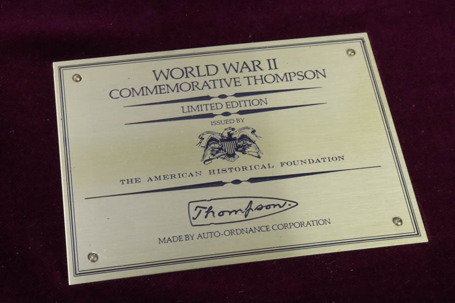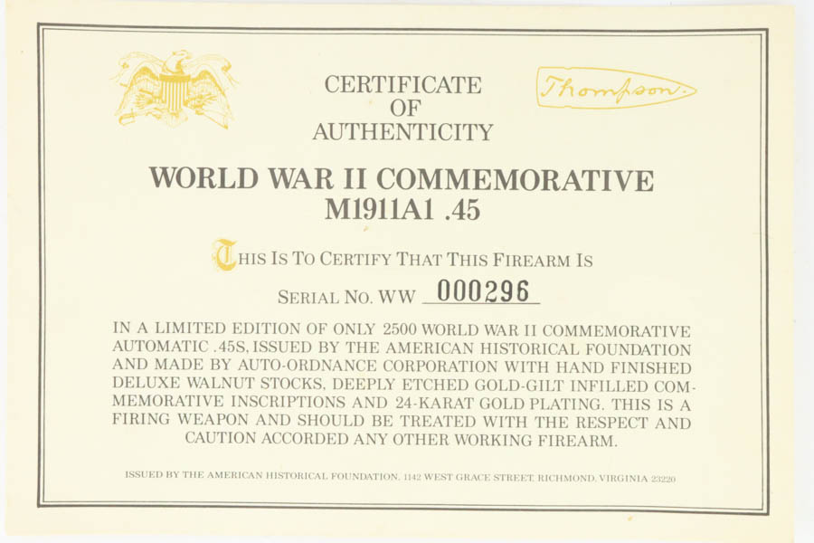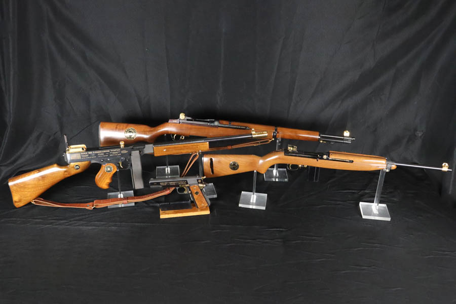 6/18/24 – This is a very cool, matching set of the Auto Ordnance WW2 Commemorative Firearms offering issued in conjunction with the American Historical Society. This four-gun set has matching serial numbers between each firearm, gun #296 in the set. This set was bought new by our consignor and he never fired any of them. They are all in mint condition, and come with all of the original display cases and paperwork/literature. The Garand is a Springfield production, Iver Johnson made the M1 carbine, and Auto Ordnance produced the 1911A1 and Thompson. It appears only 500 of these sets were made and it’s very difficult to find a matching set, especially in unfired condition.