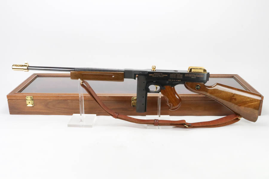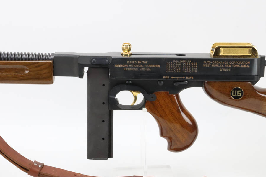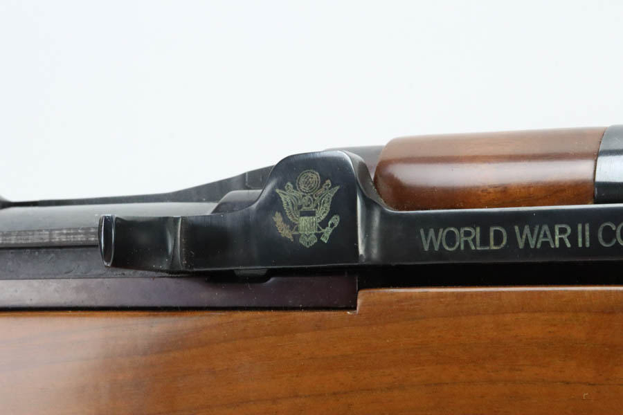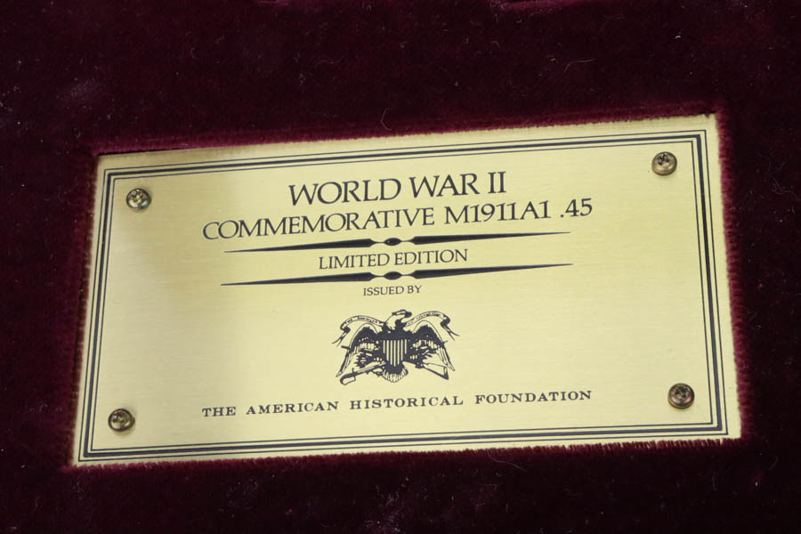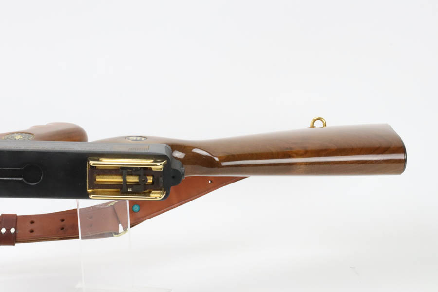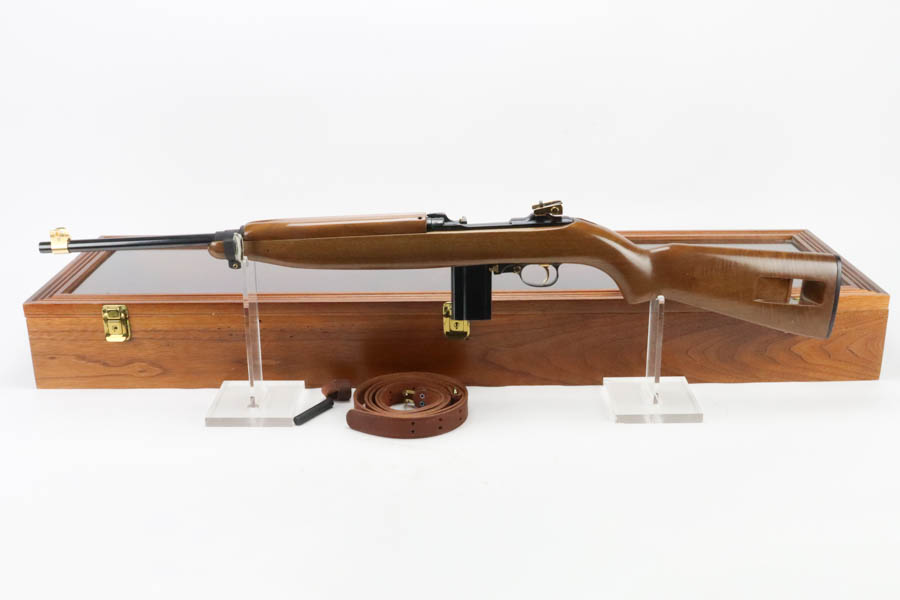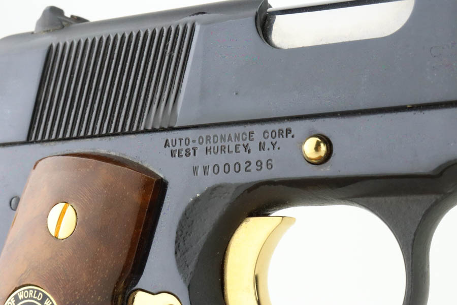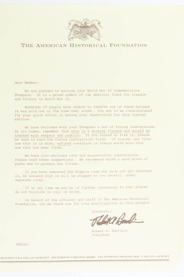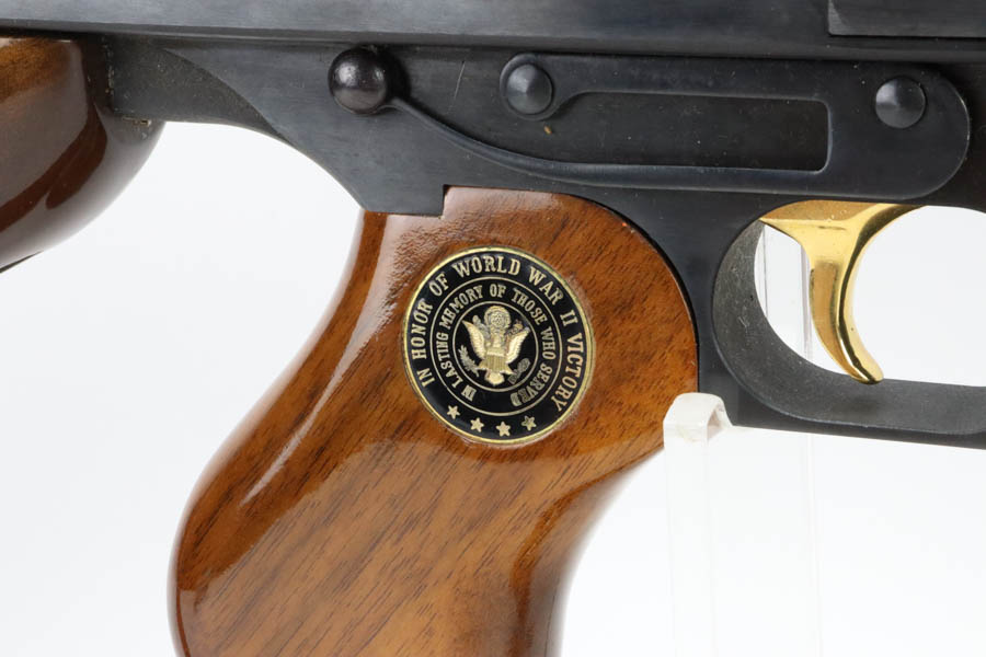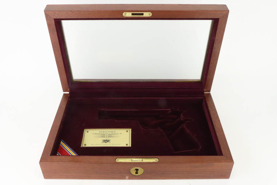 6/18/24 – This is a very cool, matching set of the Auto Ordnance WW2 Commemorative Firearms offering issued in conjunction with the American Historical Society. This four-gun set has matching serial numbers between each firearm, gun #296 in the set. This set was bought new by our consignor and he never fired any of them. They are all in mint condition, and come with all of the original display cases and paperwork/literature. The Garand is a Springfield production, Iver Johnson made the M1 carbine, and Auto Ordnance produced the 1911A1 and Thompson. It appears only 500 of these sets were made and it’s very difficult to find a matching set, especially in unfired condition.