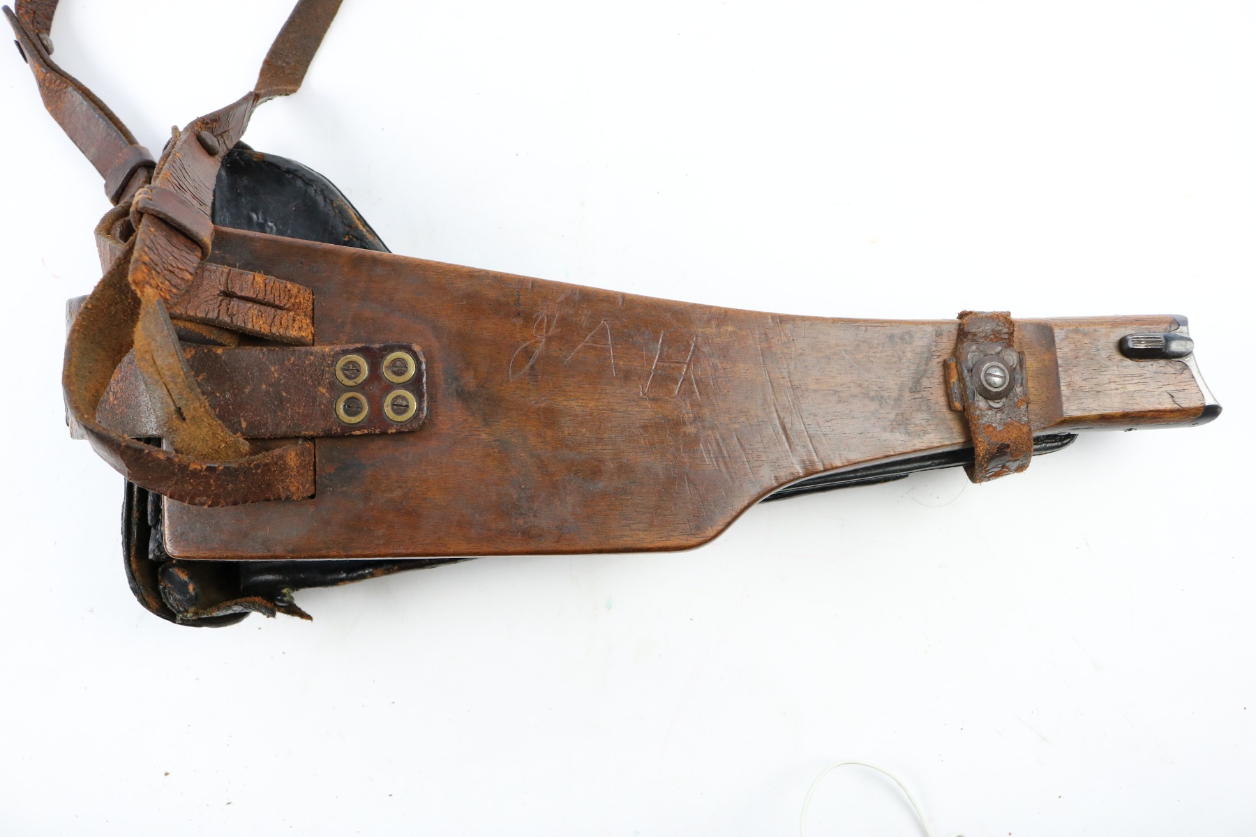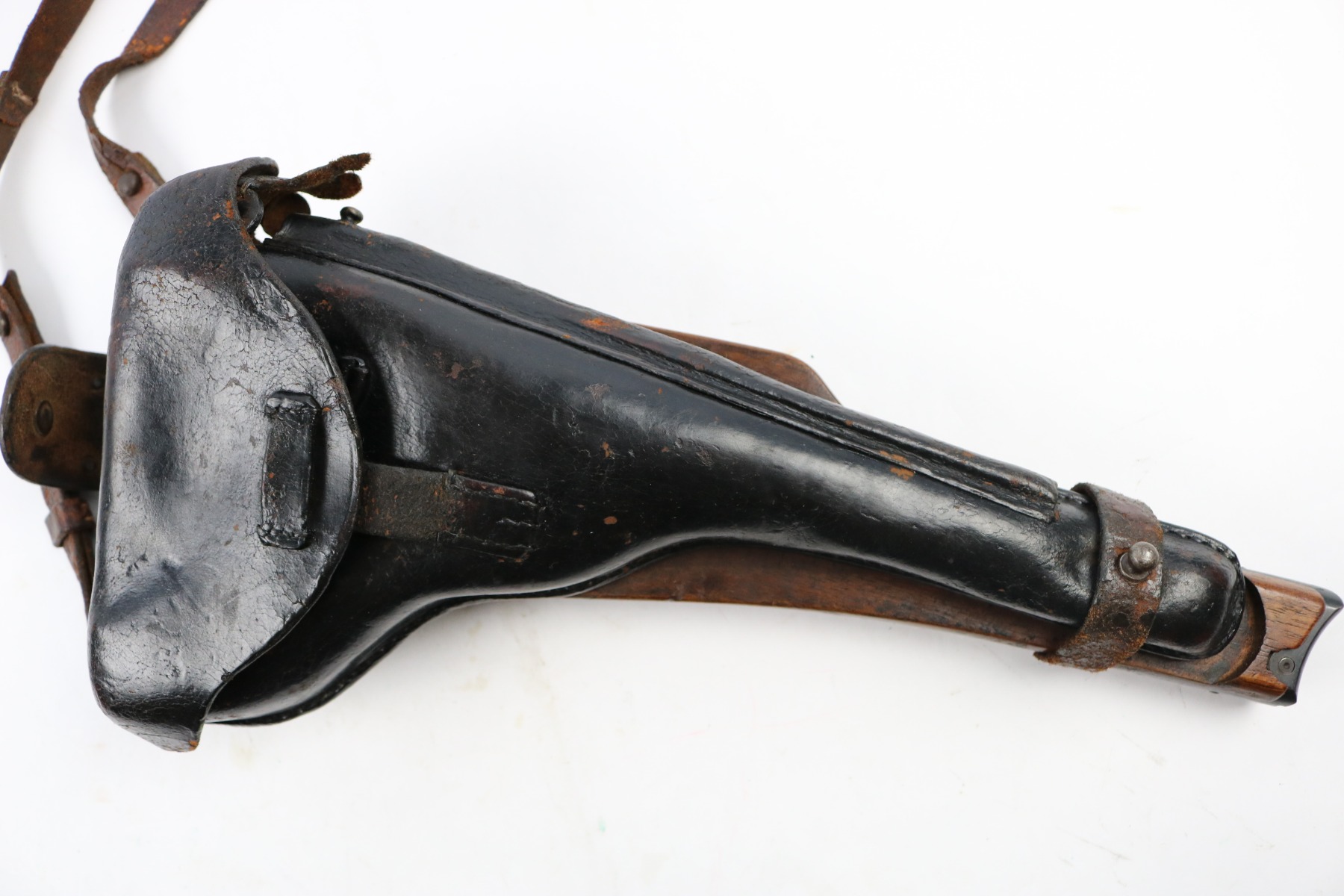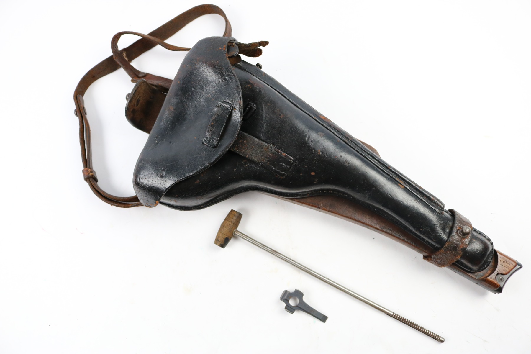 5/25/18 – This is a complete, all original artillery Luger rig. Included is everything shown in photos. There is an unmarked luger takedown tool, that although unmarked looks like an original WW2 production item. There’s some light bluing loss and some spots of rust on the front and back of the tool. There is also an original WW1 artillery cleaning rod. The rod has some speckling discoloration but is in great shape overall and guaranteed original. The holster is dated on the interior leather 1917, with a KOCH & BENNING maker stamp. The leather has exterior surface cracking and scuff marks. Overalll in good condition though. The toe and body is surprisingly firm, while the lid is soft and pliable. The stiching is all original and in tact. The lid is ripped on the right corner that extends about 3 inches from the edge. Usually the straps are missing or replacement but this rig has the original shoulder straps. Although they’re cracked and worn, they’re in tact and original. The wood shoulder stock is excellent and has a faint imperial proof stamp. All guaranteed original and authentic.