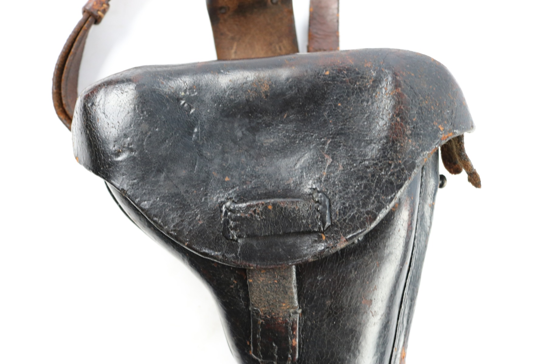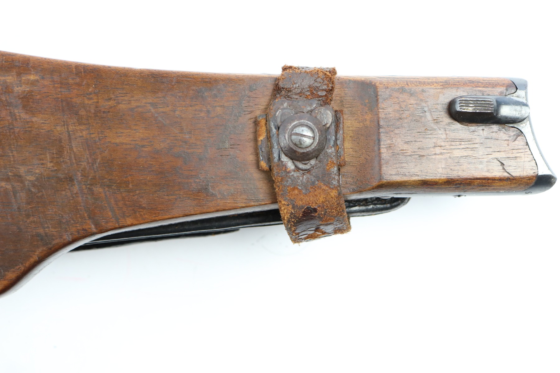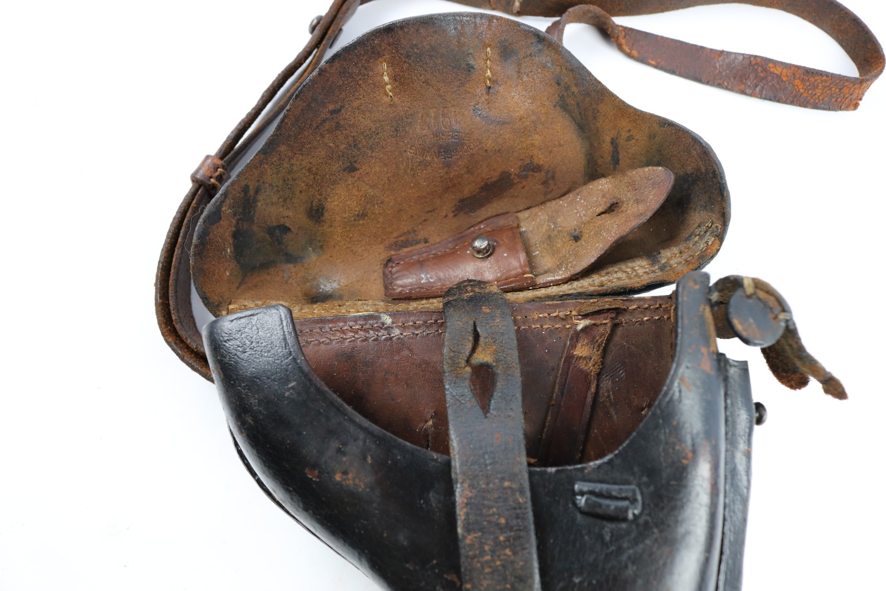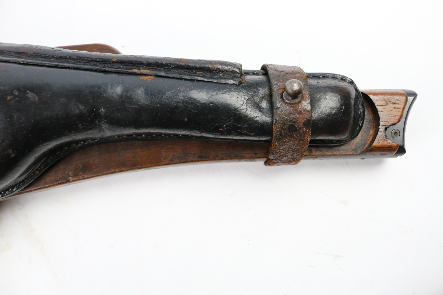 5/25/18 – This is a complete, all original artillery Luger rig. Included is everything shown in photos. There is an unmarked luger takedown tool, that although unmarked looks like an original WW2 production item. There’s some light bluing loss and some spots of rust on the front and back of the tool. There is also an original WW1 artillery cleaning rod. The rod has some speckling discoloration but is in great shape overall and guaranteed original. The holster is dated on the interior leather 1917, with a KOCH & BENNING maker stamp. The leather has exterior surface cracking and scuff marks. Overalll in good condition though. The toe and body is surprisingly firm, while the lid is soft and pliable. The stiching is all original and in tact. The lid is ripped on the right corner that extends about 3 inches from the edge. Usually the straps are missing or replacement but this rig has the original shoulder straps. Although they’re cracked and worn, they’re in tact and original. The wood shoulder stock is excellent and has a faint imperial proof stamp. All guaranteed original and authentic.