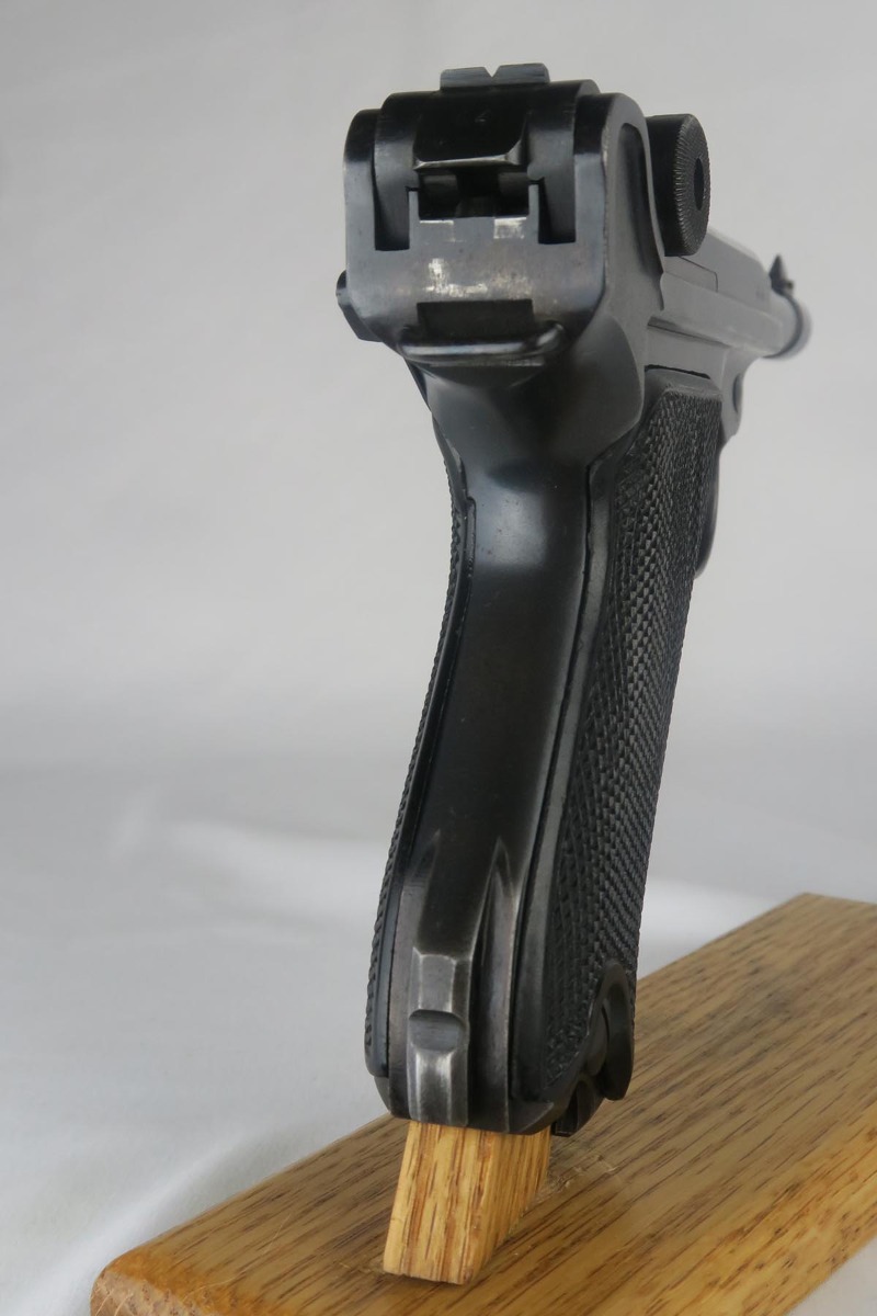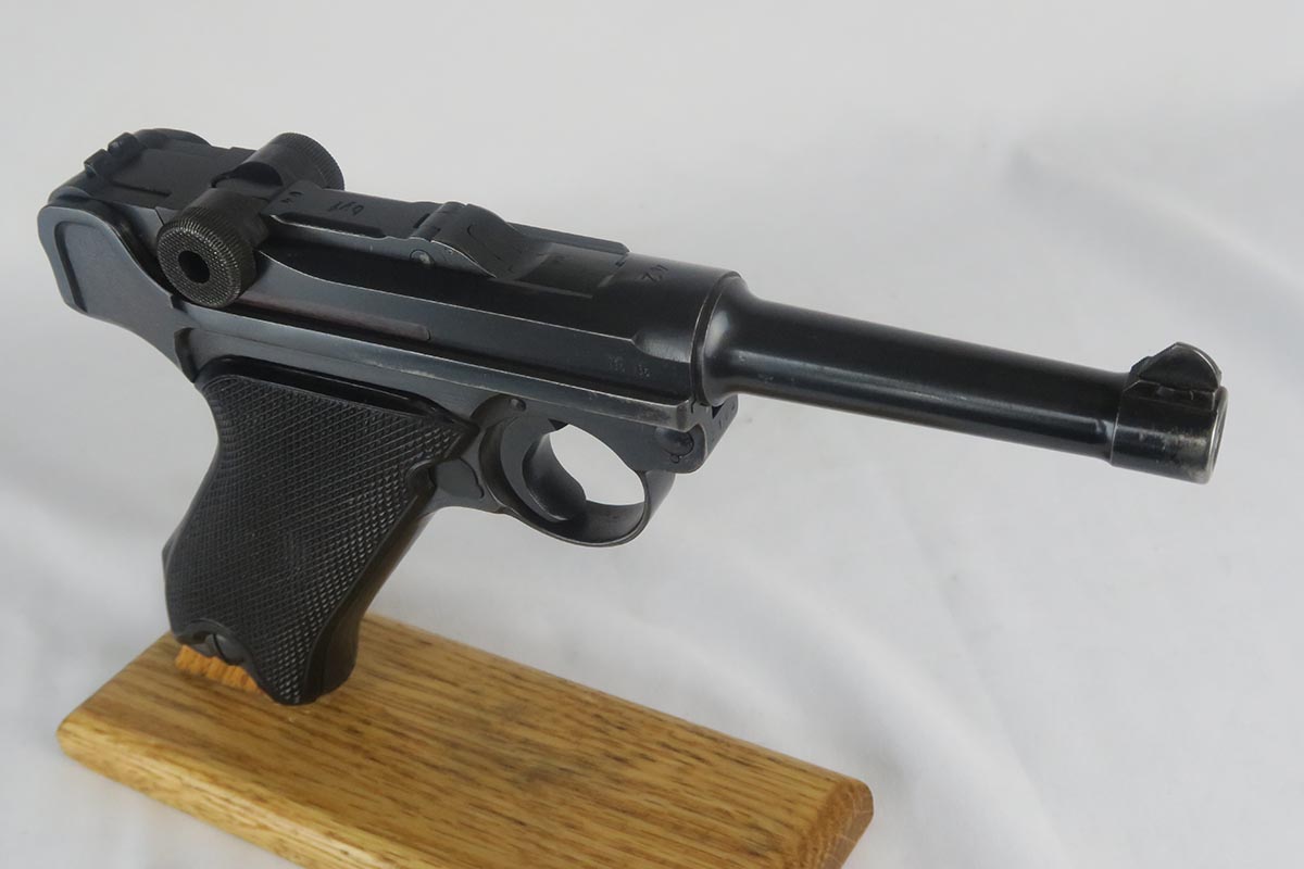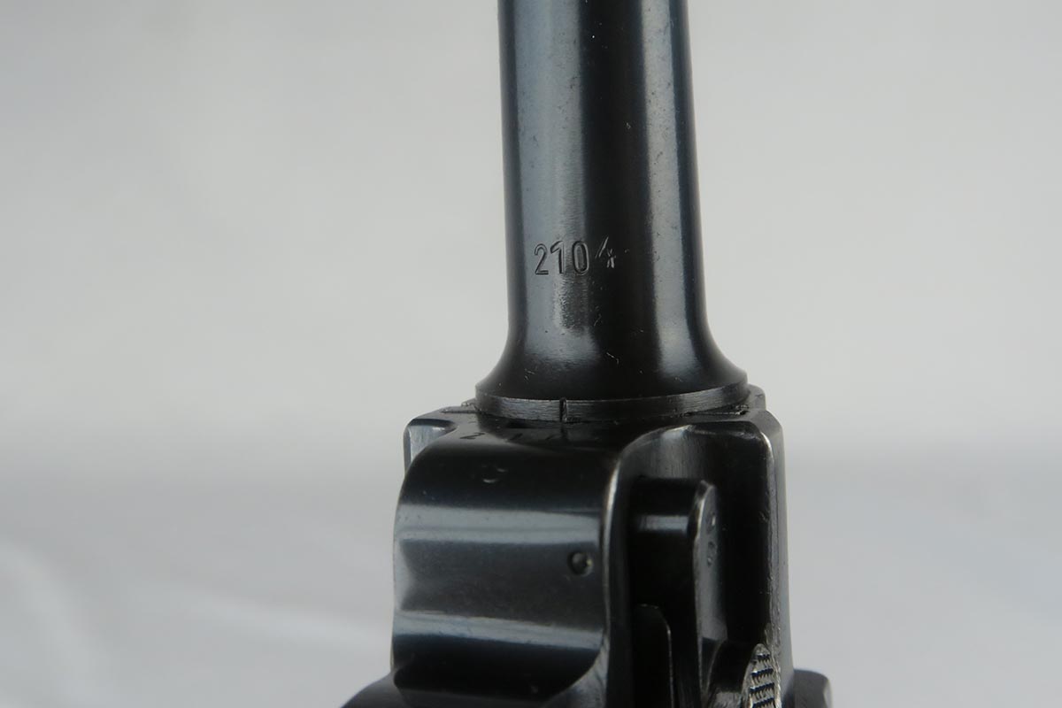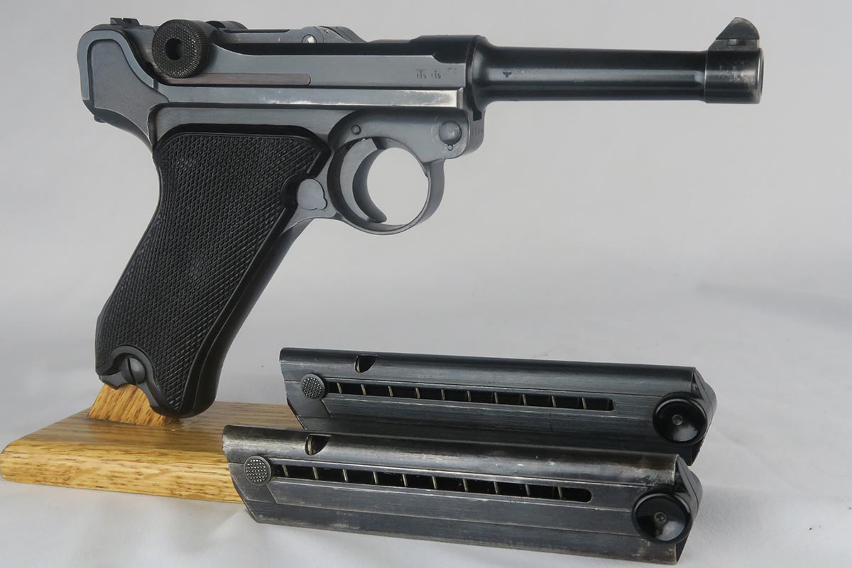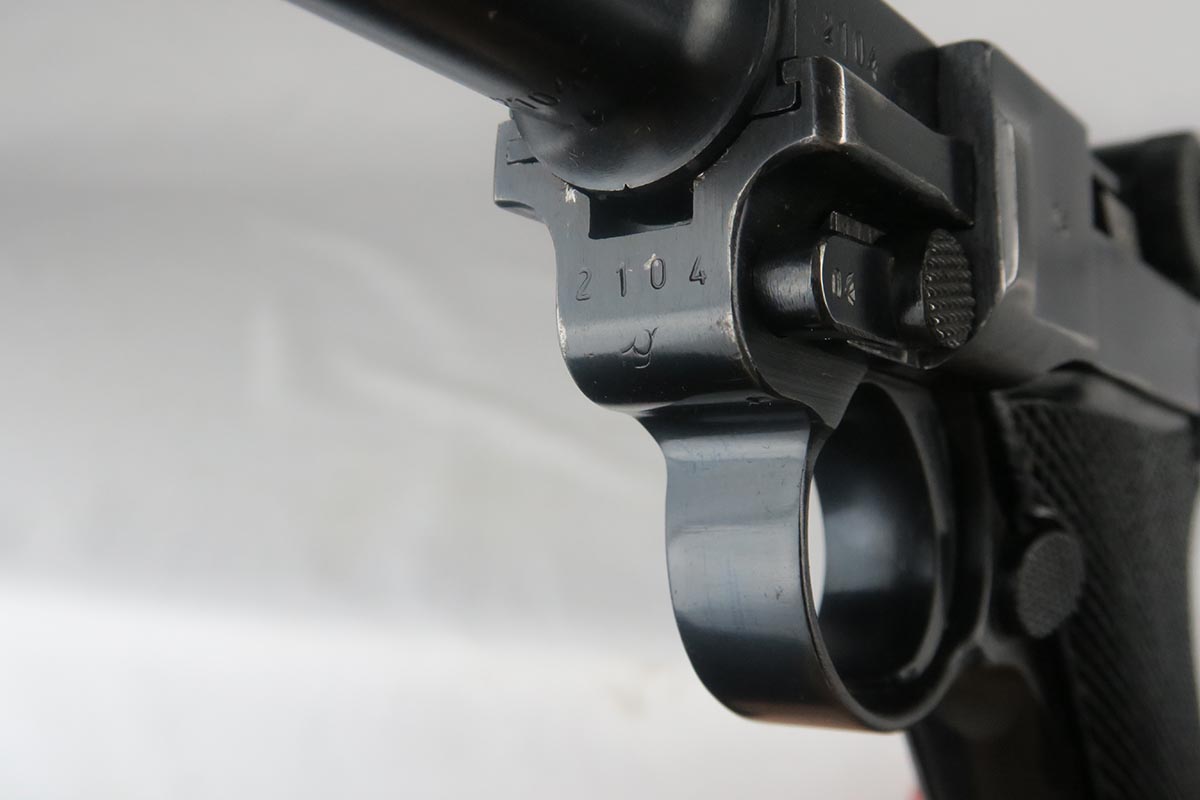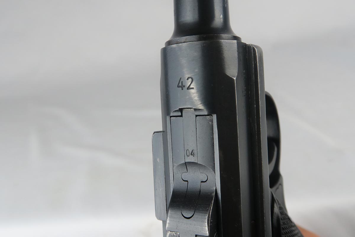 12/4/18 – This is a Mauser Black Widow luger rig in all original configuration, with spare magazine, Eagle/655 tool and ’42 dated holster. The pistol is all matching with 93-94% blue remaining. There is finish loss on all the high edges from the holster. Nice, original grips and two correct Black Widow magazines. The holster is in good condition with honest wear and age. It is maker marked and waffen proofed on the back. Pistol bore is very good with minor frosting.