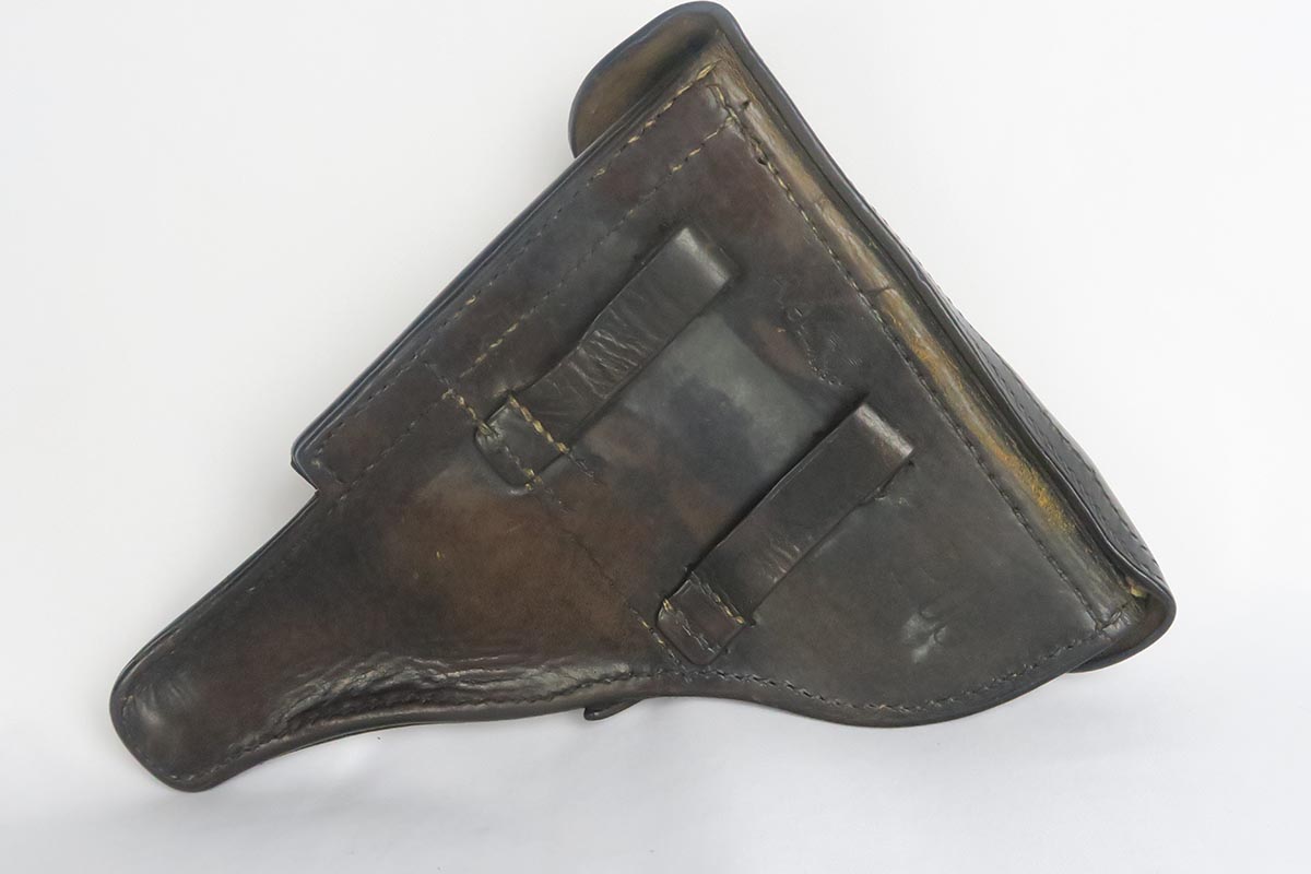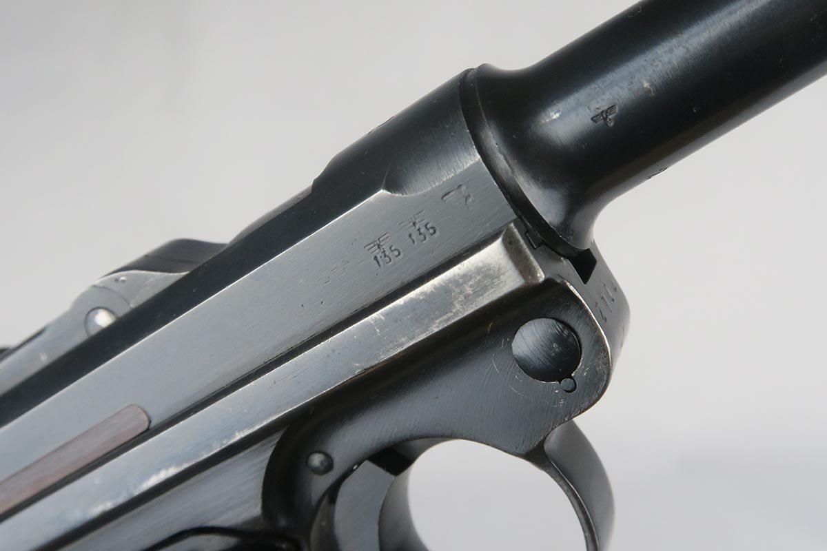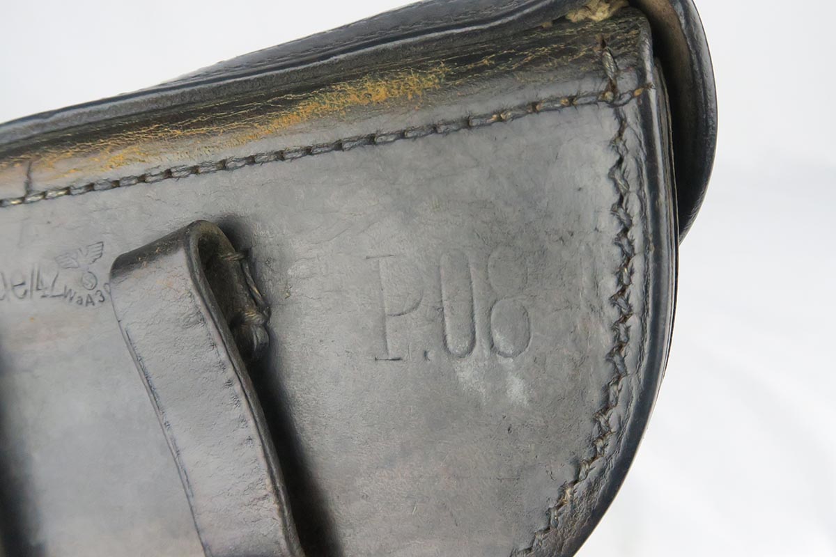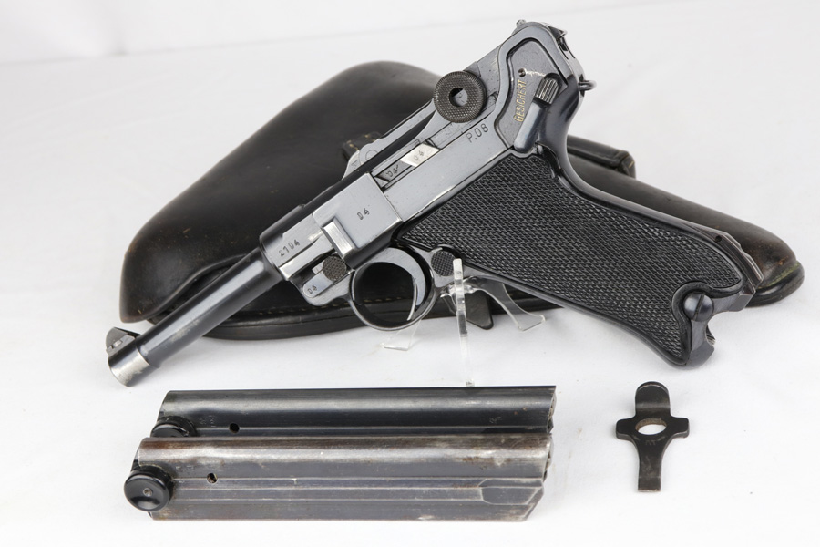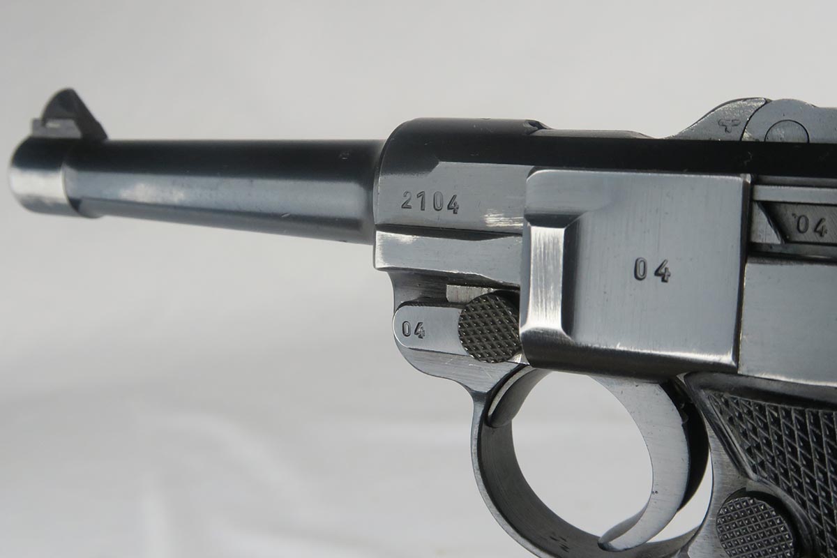 12/4/18 – This is a Mauser Black Widow luger rig in all original configuration, with spare magazine, Eagle/655 tool and ’42 dated holster. The pistol is all matching with 93-94% blue remaining. There is finish loss on all the high edges from the holster. Nice, original grips and two correct Black Widow magazines. The holster is in good condition with honest wear and age. It is maker marked and waffen proofed on the back. Pistol bore is very good with minor frosting.