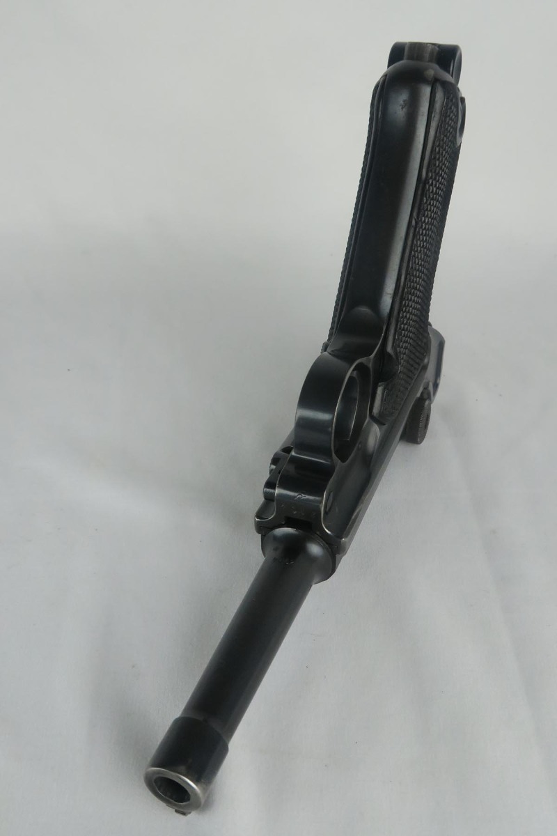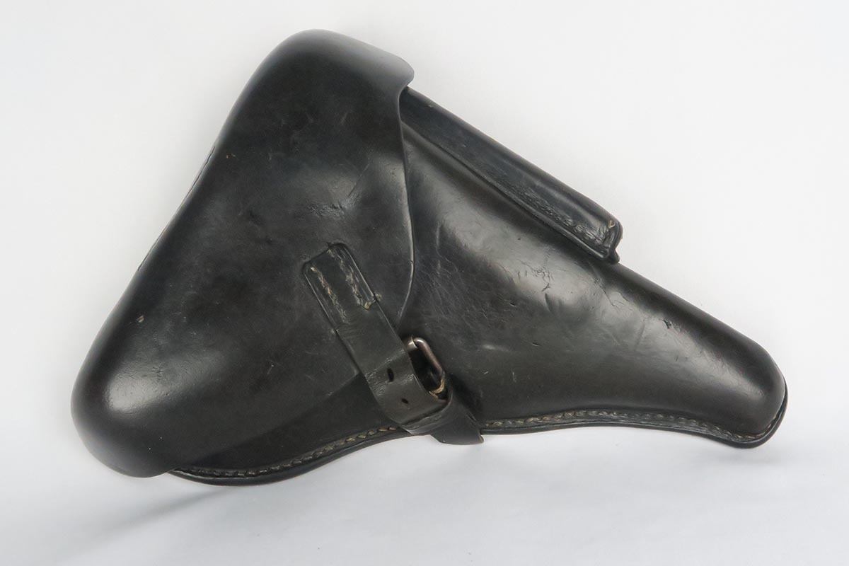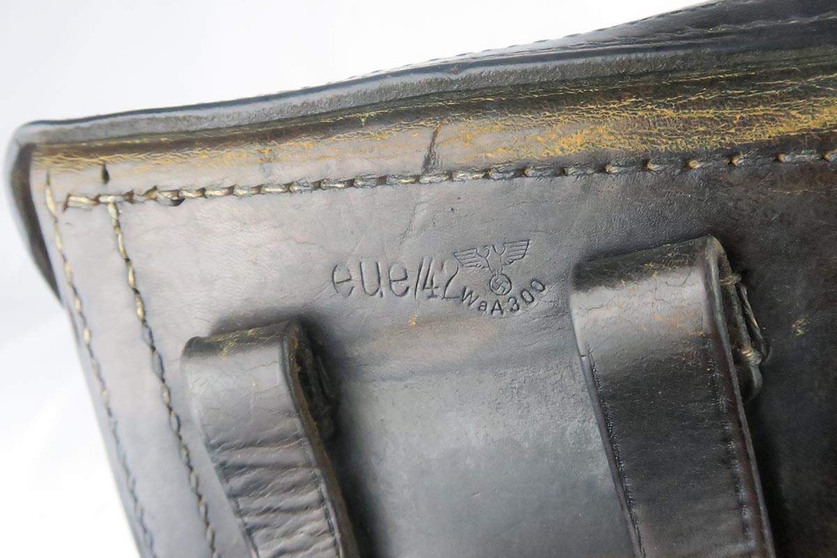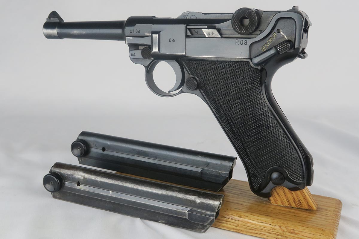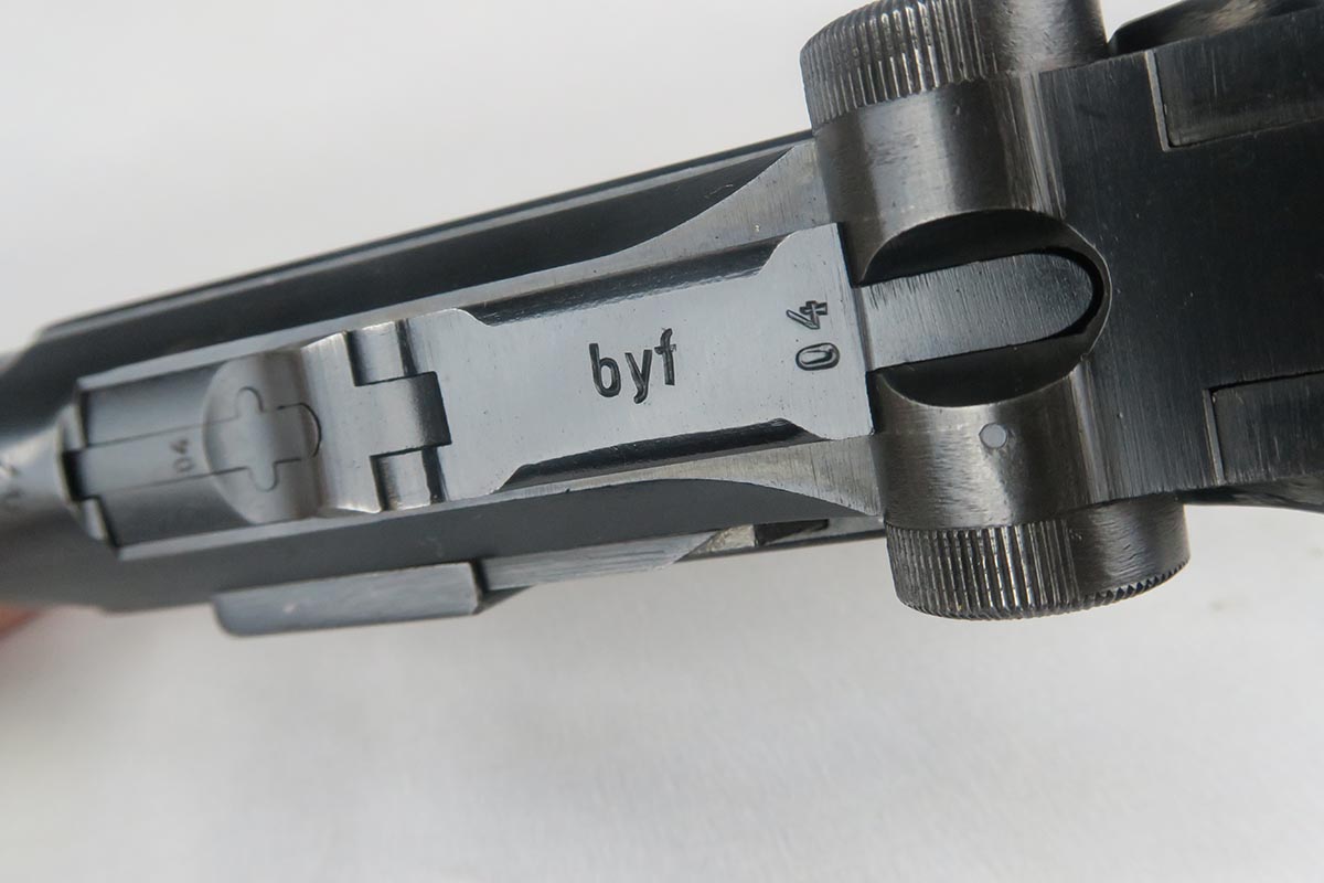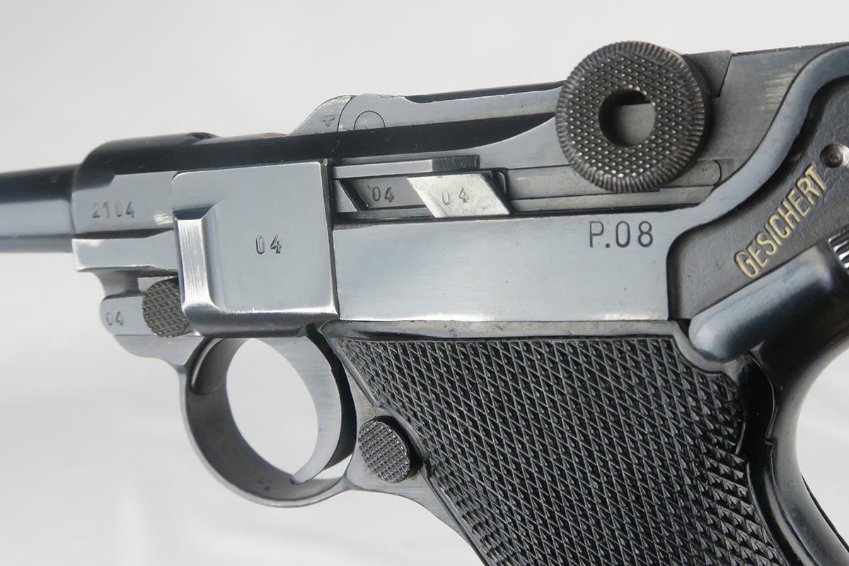 12/4/18 – This is a Mauser Black Widow luger rig in all original configuration, with spare magazine, Eagle/655 tool and ’42 dated holster. The pistol is all matching with 93-94% blue remaining. There is finish loss on all the high edges from the holster. Nice, original grips and two correct Black Widow magazines. The holster is in good condition with honest wear and age. It is maker marked and waffen proofed on the back. Pistol bore is very good with minor frosting.