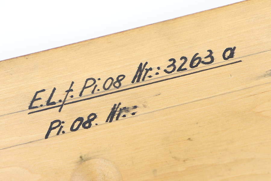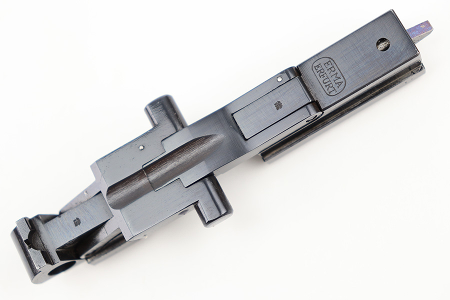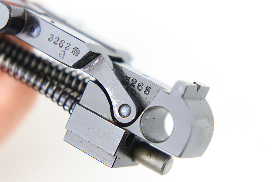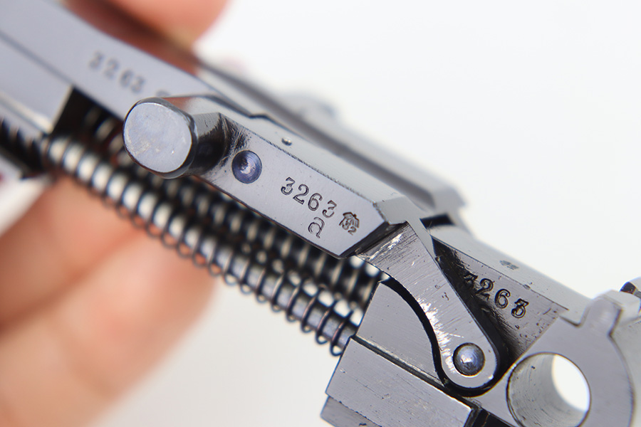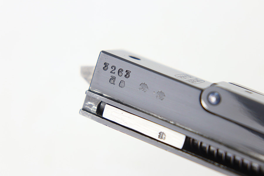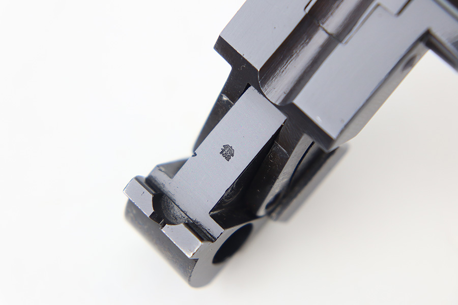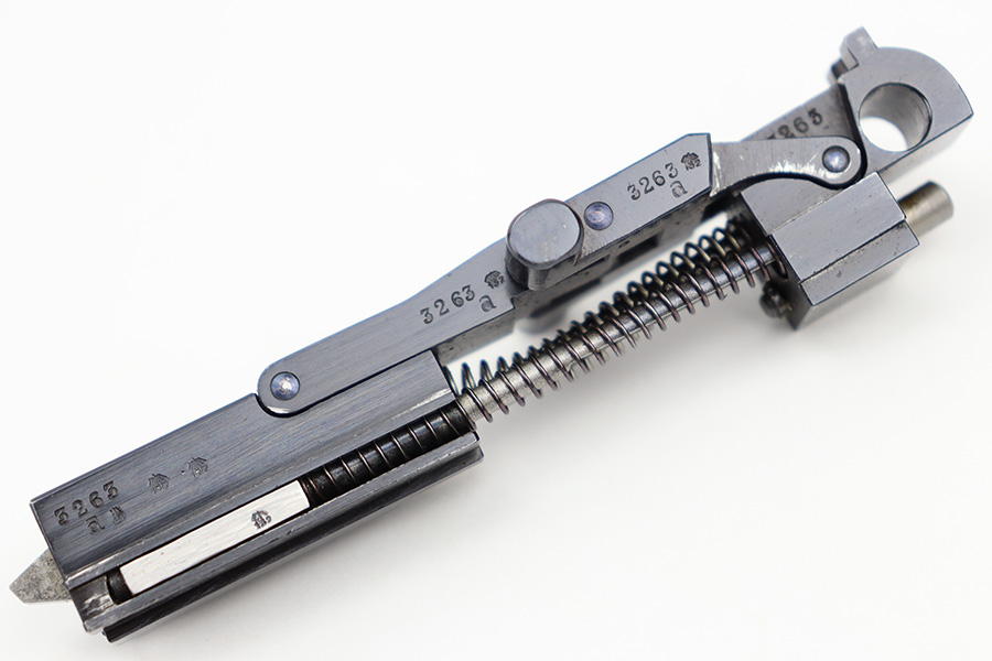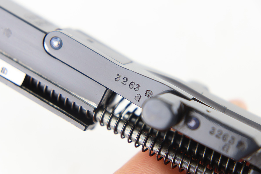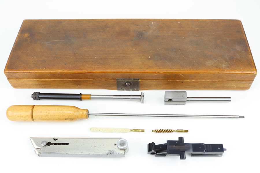 12/29/23 – This is an original WW2 era production German .22 Conversion kit. The kit is complete with an original wooden case that’s labeled and numbered by hand on the interior lid. The serial number on the case (3263a) is matching to the number on the barrel and toggle assembly. The magazine is numbered 1695a (mismatching), but still has the proper/correct waffen eagle proof stamps. The cleaning rod and block piece are eagle proof stamped and not numbered. The kit is in great condition overall with excellent original finish on the toggle assembly. The springs are tight and smooth with no functionality issues. The barrel is excellent with a minty bore that we rate 10/10 overall. The magazine has some light surface flaking of the nickel tube, as well as some speckling patina, but no major flaws and no functional issues.