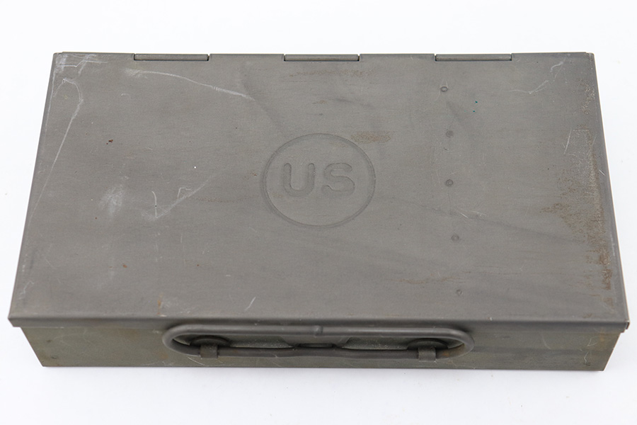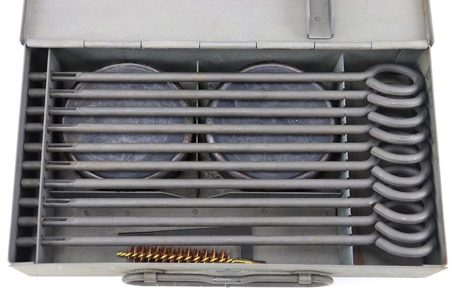 8/11/23 – This is an original WW2 era M1911A1 Squad Cleaning Kit. The kit is complete with the original metal case, cleaning rods, oilers, brush, and tool. Excellent overall condition with a parkerized finish and minimal finish loss.