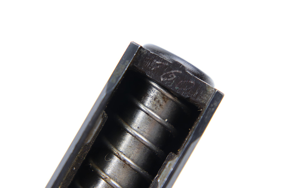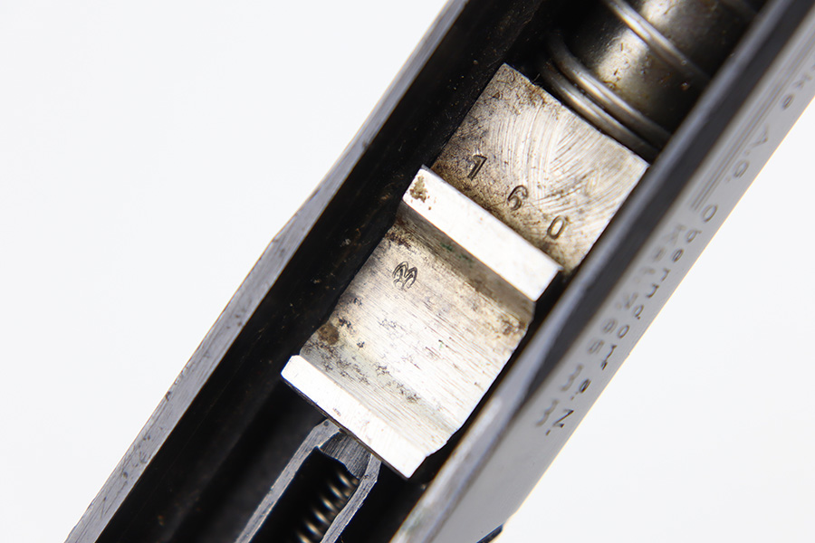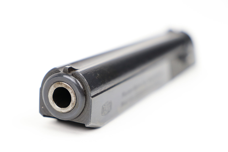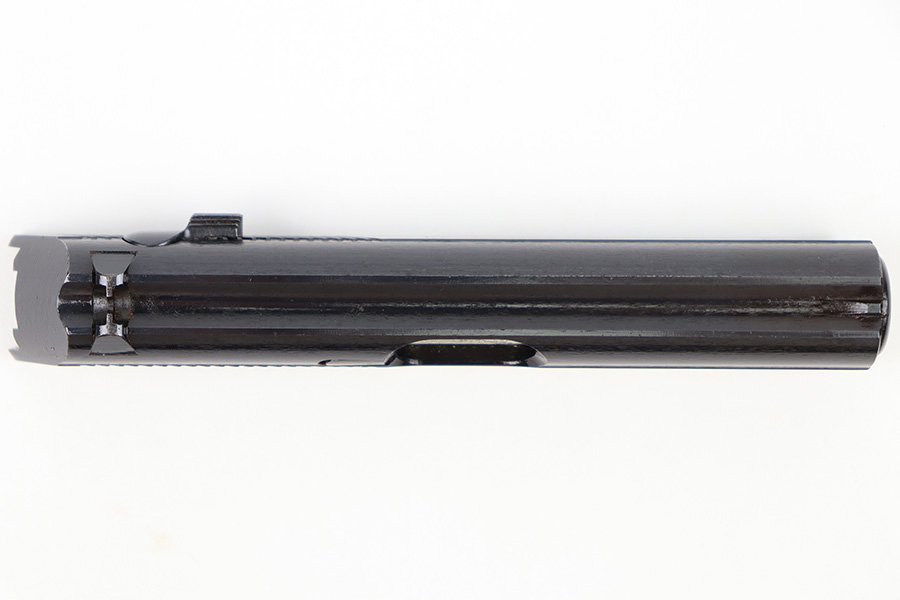 10/23/23 – This is an original Mauser HSC pistol slide, complete with all necessary internals including: recoil spring, barrel, firing pin, safety lever, and ejector. Everything shown in photos is included. The finish on the slide is excellent, with original blued finish and very minimal surface wear. The underside of the slide is serial numbered 160 which is electro penciled as shown. The barrel is matching numbered. The bore is excellent and clean with strong rifling, we rate 9/10 overall. All parts functional and excellent condition.