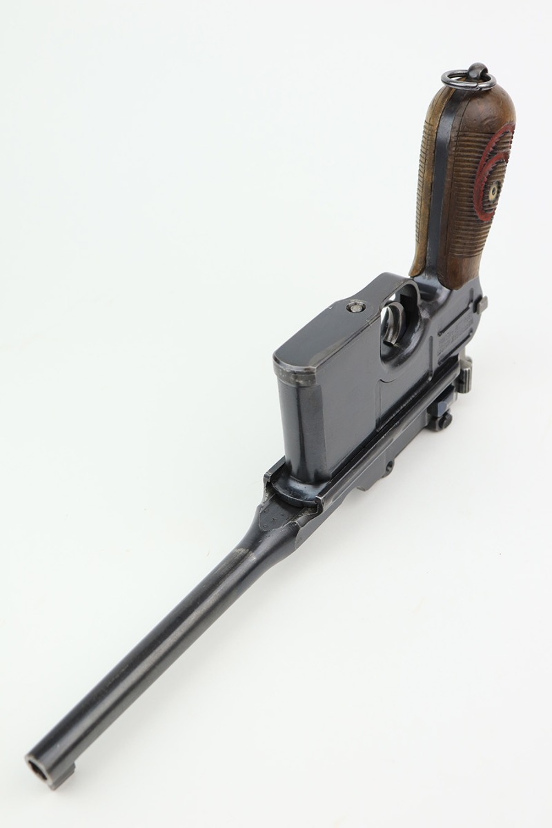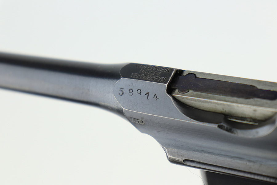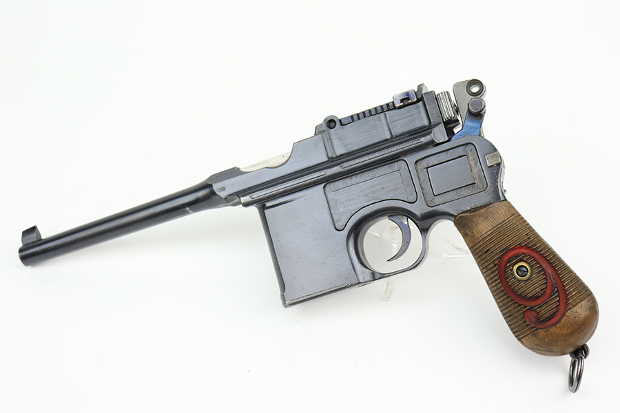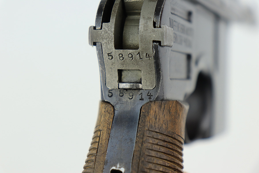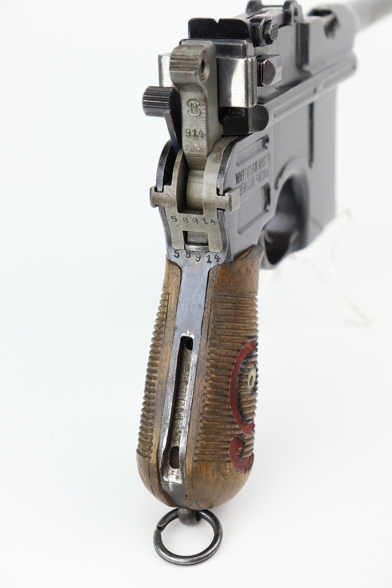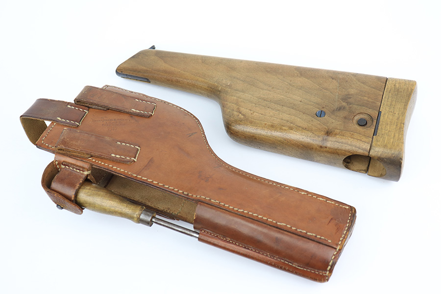 4/15/22 – This is a complete, all matching example of a Mauser “Red 9” broomhandle pistol made during WWI as part of the Imperial German Army contract. Unlike its commercial counterparts, “red 9” broomhandles were chambered in more common 9mm Para caliber, which was used by the german army and were marked with a large 9 on the grips which was then filled with red or orange paint to help German soldiers differentiate its caliber from the standard .30 mauser cartridge. Only about 130,000 of these very collectible guns were made, with only about 100,000 being accepted by the army and issued to the troops. Considered to be a substitute for a light carbine, they became very popular in trench warfare and were used by some of the Germany’s elite crack troops. This gun retains around 98% of its original blue, with hints of wear on the high edges and a few light streaks of wear on the underside of the barrel. Grips and bore are in excellent condition. All the numbers match, including the grips. This is a complete rig with its original minty matching shoulder stock, leather harness (dated 1916), cleaning rod, and spare magazine spring.