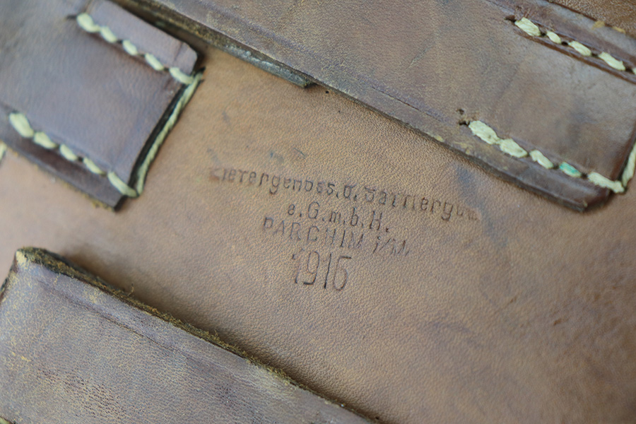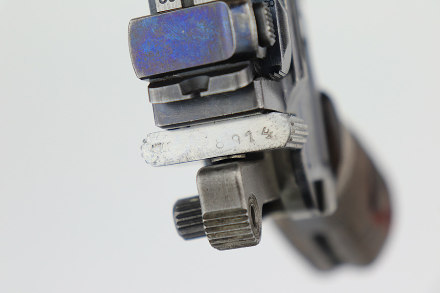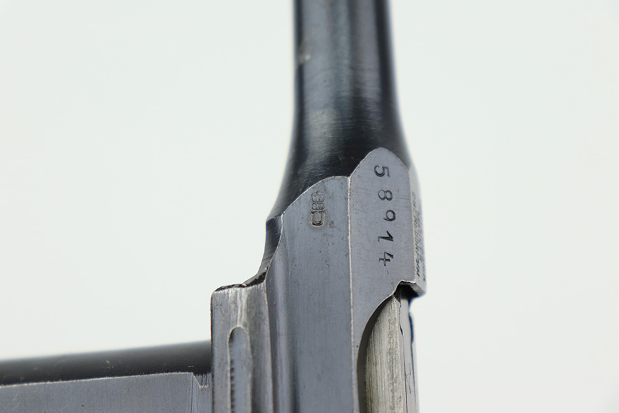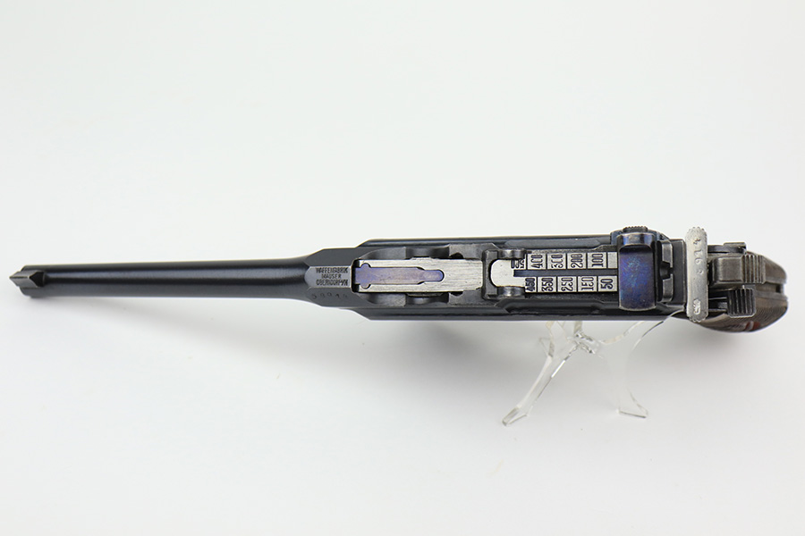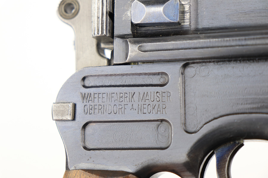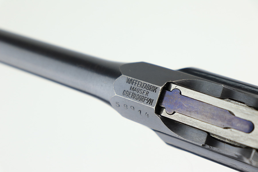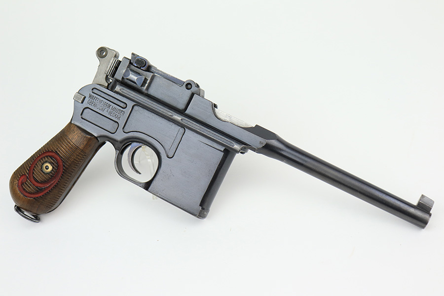 4/15/22 – This is a complete, all matching example of a Mauser “Red 9” broomhandle pistol made during WWI as part of the Imperial German Army contract. Unlike its commercial counterparts, “red 9” broomhandles were chambered in more common 9mm Para caliber, which was used by the german army and were marked with a large 9 on the grips which was then filled with red or orange paint to help German soldiers differentiate its caliber from the standard .30 mauser cartridge. Only about 130,000 of these very collectible guns were made, with only about 100,000 being accepted by the army and issued to the troops. Considered to be a substitute for a light carbine, they became very popular in trench warfare and were used by some of the Germany’s elite crack troops. This gun retains around 98% of its original blue, with hints of wear on the high edges and a few light streaks of wear on the underside of the barrel. Grips and bore are in excellent condition. All the numbers match, including the grips. This is a complete rig with its original minty matching shoulder stock, leather harness (dated 1916), cleaning rod, and spare magazine spring.
