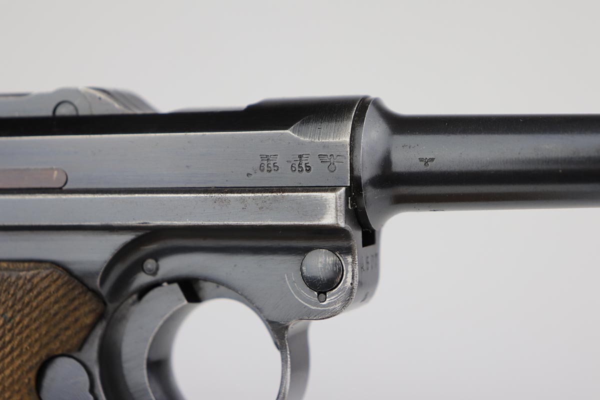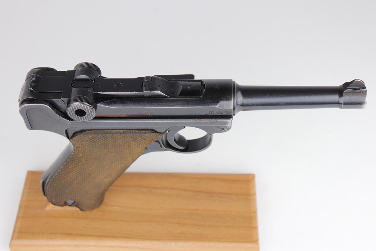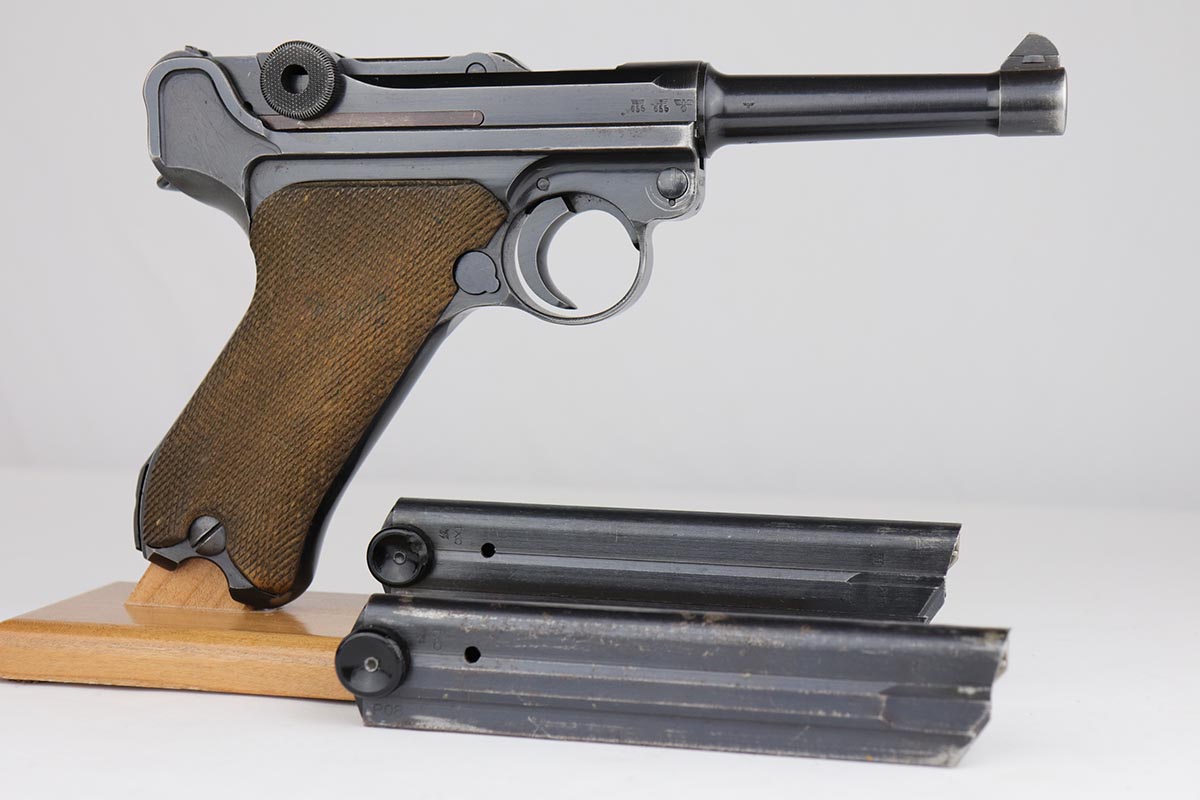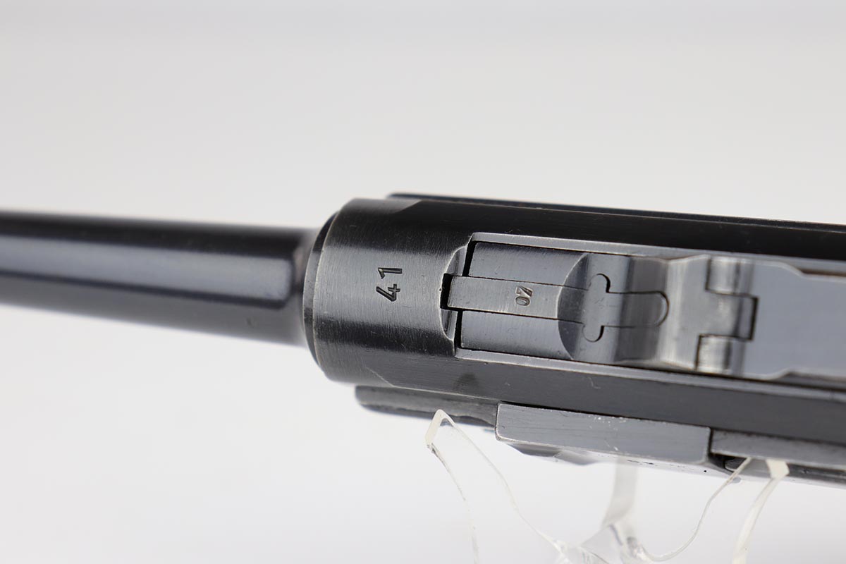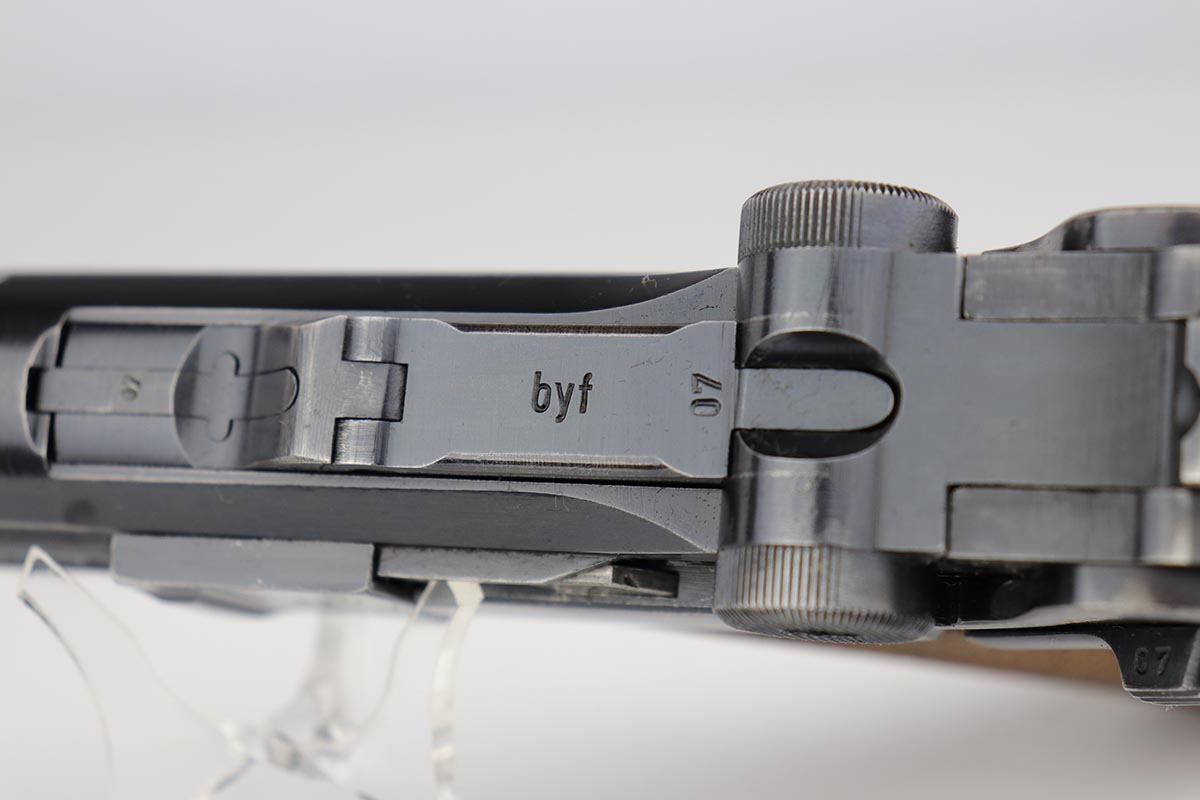 5/23/19 – This is a complete Nazi Mauser Luger rig as it would’ve been issued in the year it was made, 1941. The pistol is ‘byf 41’ marked, with all matching numbered small parts. The bluing rates at about 95%, with standard holster wear on the muzzle, sideplate, high edges and bottom of the front strap. The grips are E/655 proofed and not numbered. The rig includes a total of two black widow style magazines. E/655 proofed takedown tool is present. The rig is completed by an excellent 1941 dated holster, with sharp waffenamt and Jean Weipert Offenbach maker mark. Pistol bore does have some freckling and frost throughout.