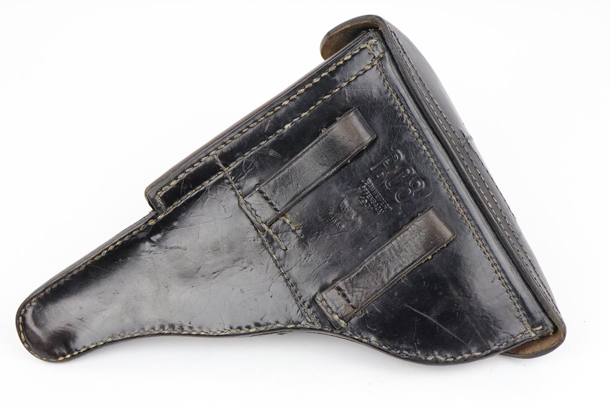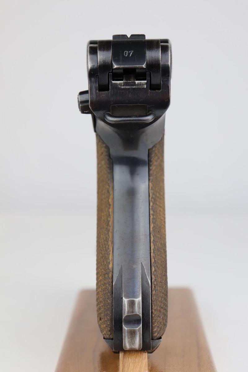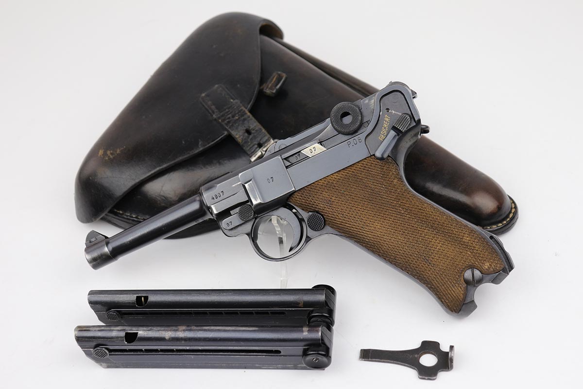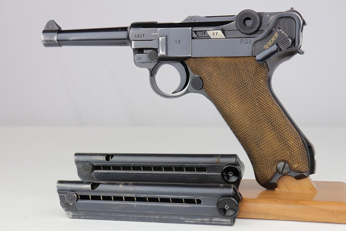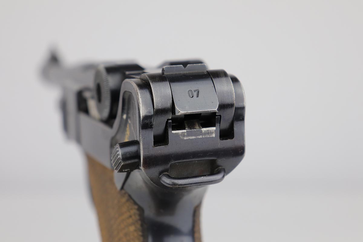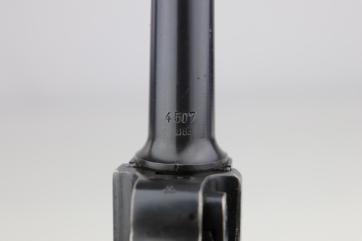 5/23/19 – This is a complete Nazi Mauser Luger rig as it would’ve been issued in the year it was made, 1941. The pistol is ‘byf 41’ marked, with all matching numbered small parts. The bluing rates at about 95%, with standard holster wear on the muzzle, sideplate, high edges and bottom of the front strap. The grips are E/655 proofed and not numbered. The rig includes a total of two black widow style magazines. E/655 proofed takedown tool is present. The rig is completed by an excellent 1941 dated holster, with sharp waffenamt and Jean Weipert Offenbach maker mark. Pistol bore does have some freckling and frost throughout.