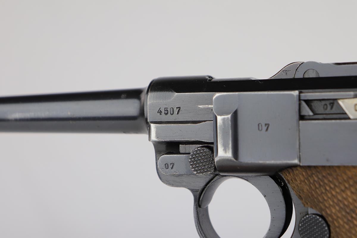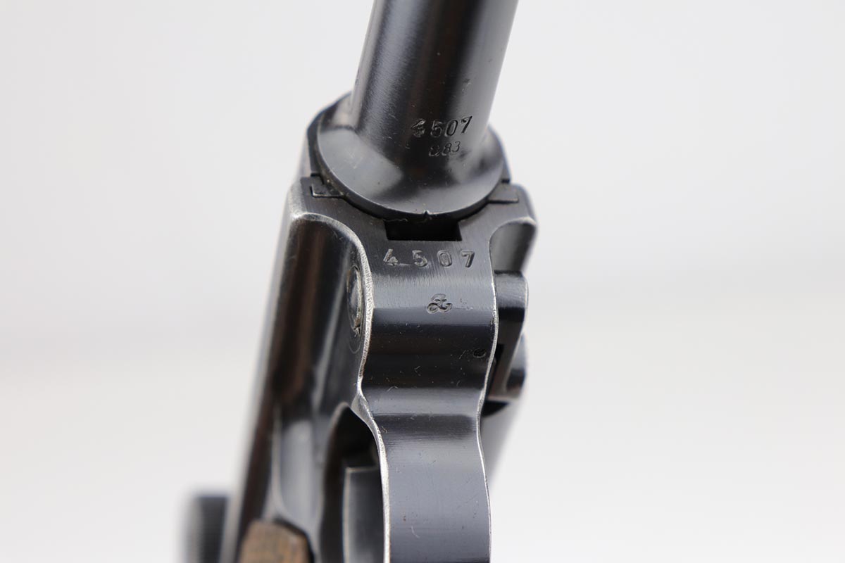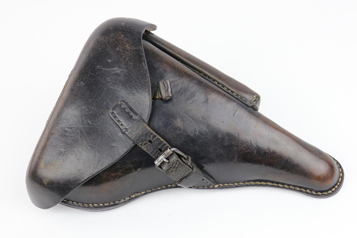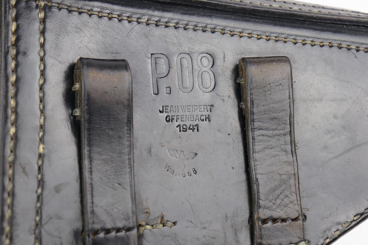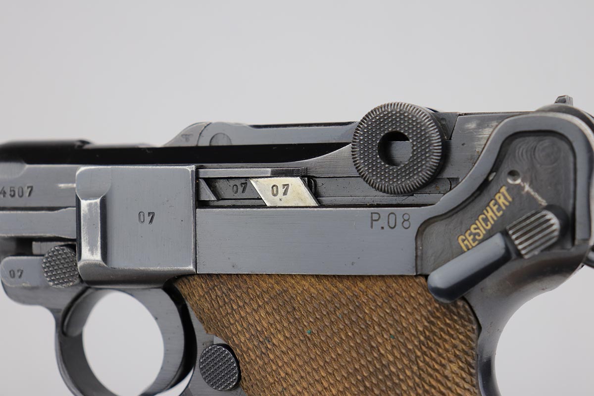 5/23/19 – This is a complete Nazi Mauser Luger rig as it would’ve been issued in the year it was made, 1941. The pistol is ‘byf 41’ marked, with all matching numbered small parts. The bluing rates at about 95%, with standard holster wear on the muzzle, sideplate, high edges and bottom of the front strap. The grips are E/655 proofed and not numbered. The rig includes a total of two black widow style magazines. E/655 proofed takedown tool is present. The rig is completed by an excellent 1941 dated holster, with sharp waffenamt and Jean Weipert Offenbach maker mark. Pistol bore does have some freckling and frost throughout.