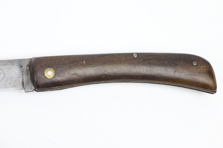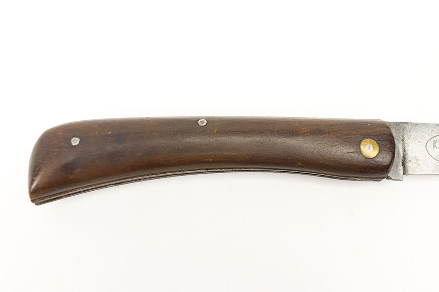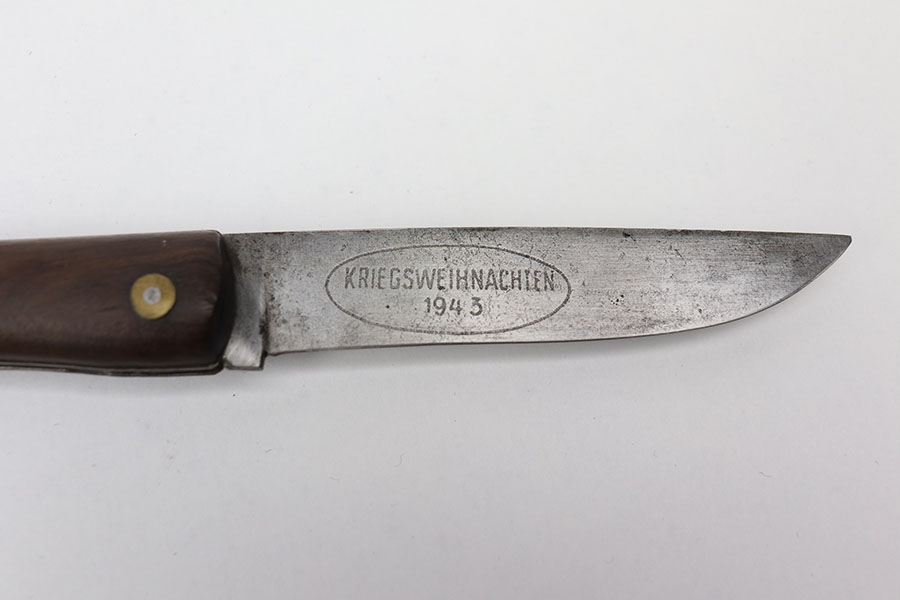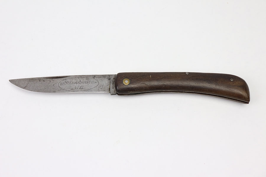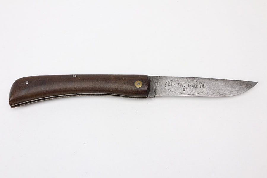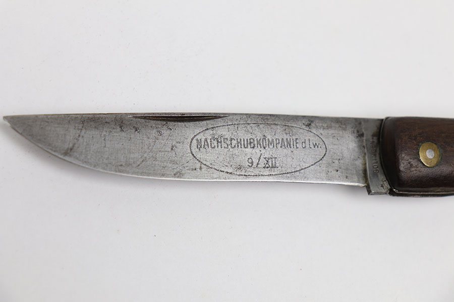 3/25/21 – This is a fairly unique “custom engraved” pocket knife. The knife is marked “Kriegsweihnachien 1943” which translates to “Christmas Battle 1943”. The reverse is engraved “Nachschubkompanie dlw 9/XII” which means “Supply Company” and a company number. The blade has some signs of aging but no serious signs of sharpening. The wood handle is in excellent condition with no cracks or chips.