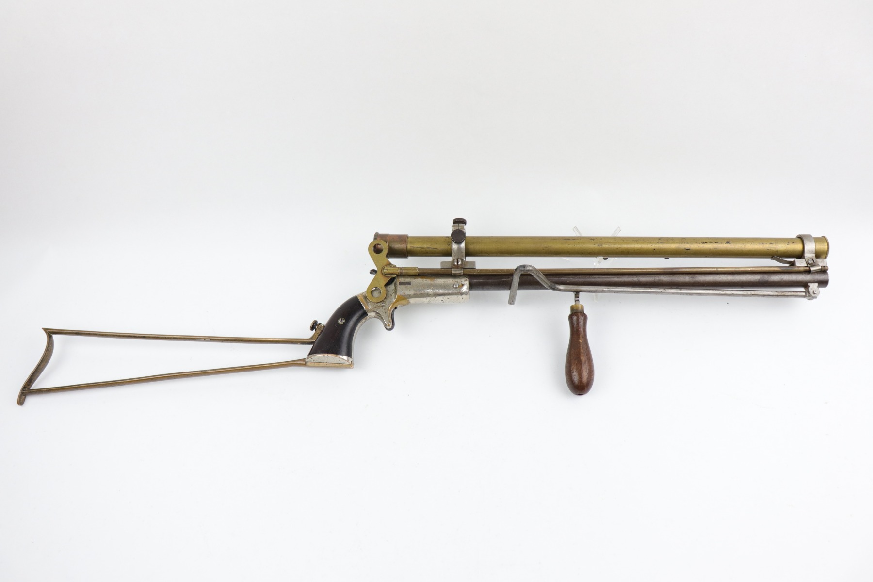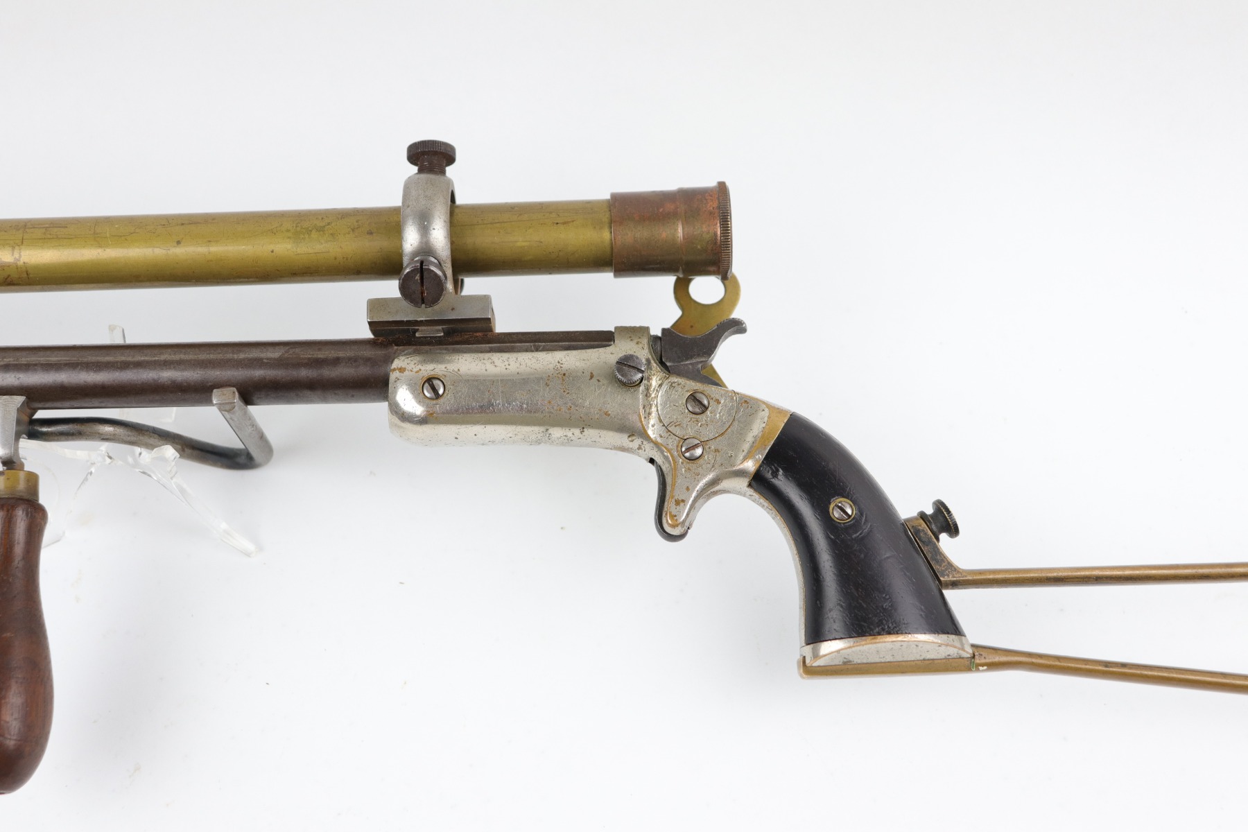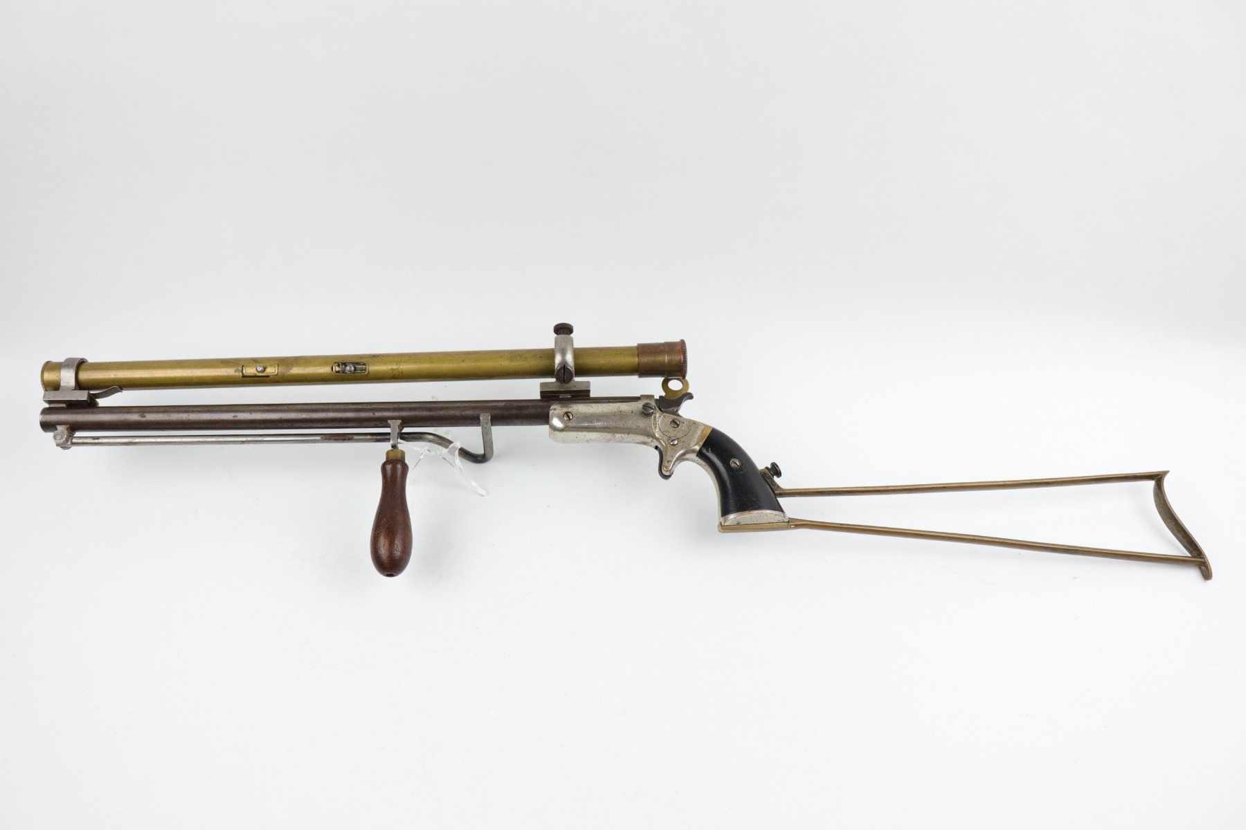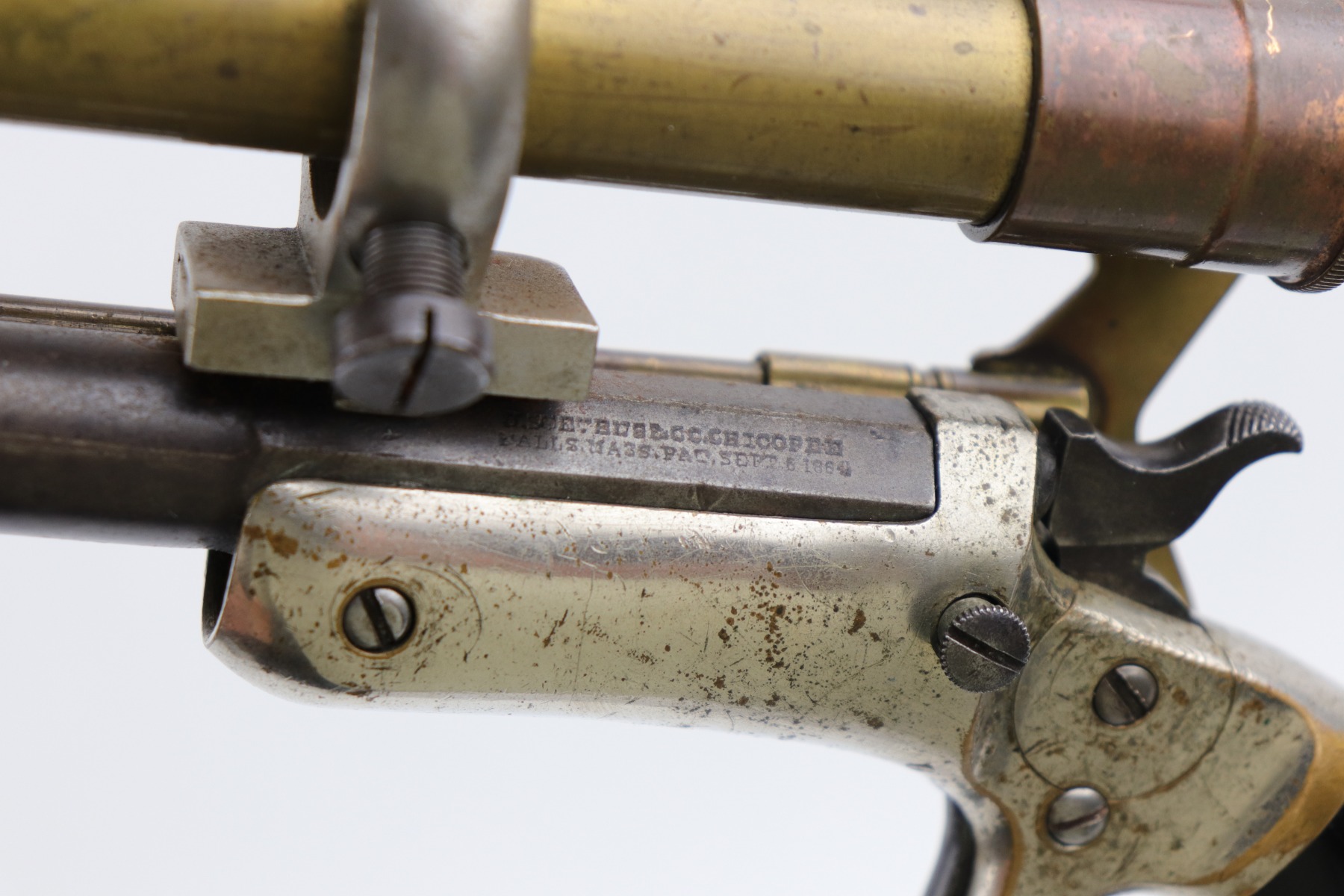 6/16/20 – This is a very interesting custom Stevens Arms Co New Model Pocket Rifle. From research, this gun was likely made in the late 1800’s. No FFL required. About 2,500 of these guns were produced, so it is quite rare. This particular example has been equipped with a full-length brass telescopic sight, folding monopod or palm rest, vertical foregrip and side-mounted cleaning rod. There are spotty areas of wear on the frame, especially near the trigger. There are small dings and dents on the frame throughout. There are scratches along the length of the barrel throughout. The barrel has an even layer of dark brown patina. There are handling marks and spots of discoloration on the brass scope throughout. The optics are excellent. It appears to be fully functional. The bore has good rifling but a decent amount of frosting. 14.75″ barrel.