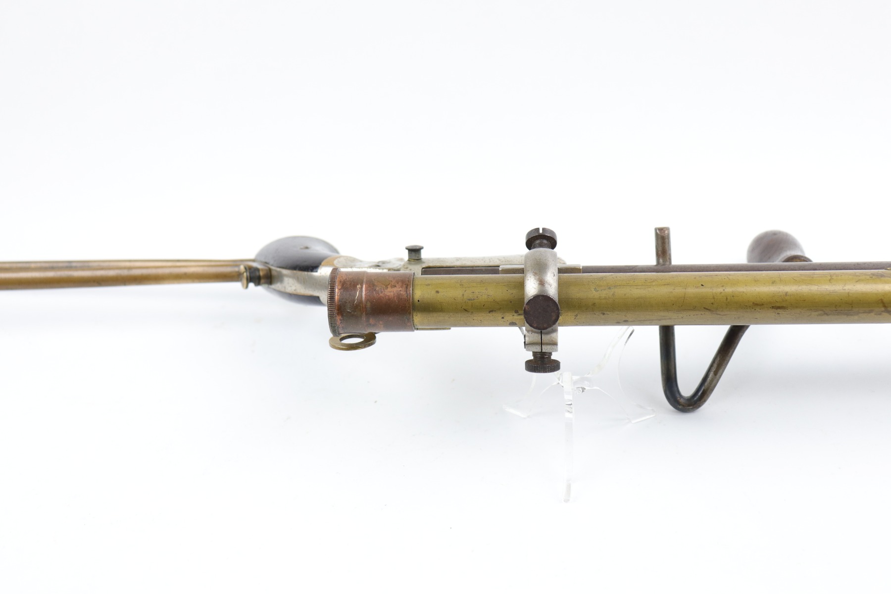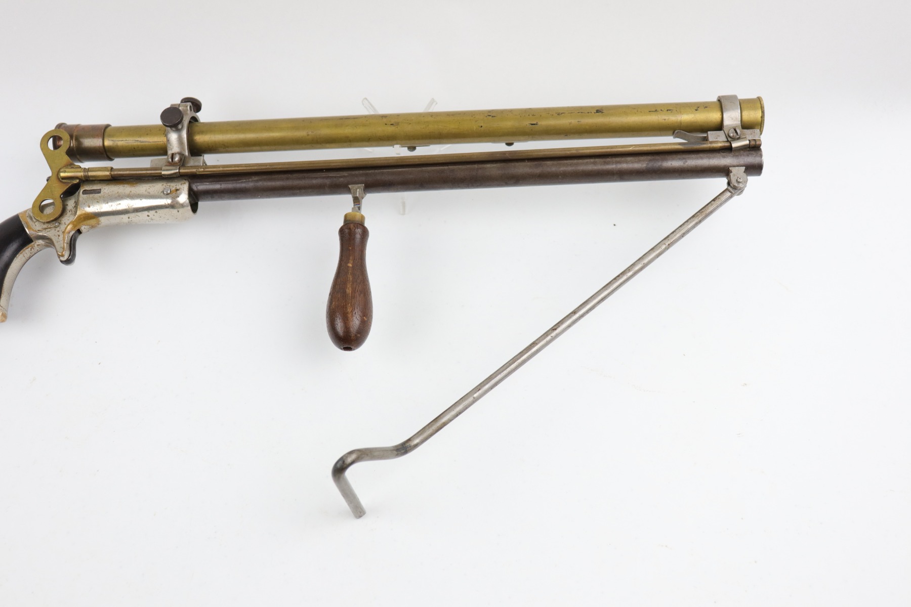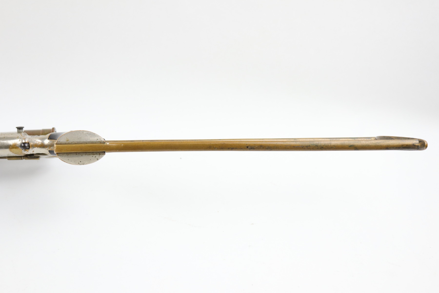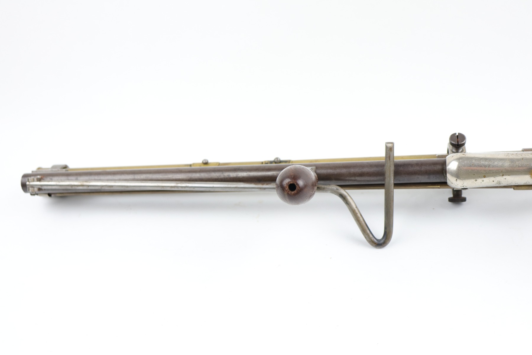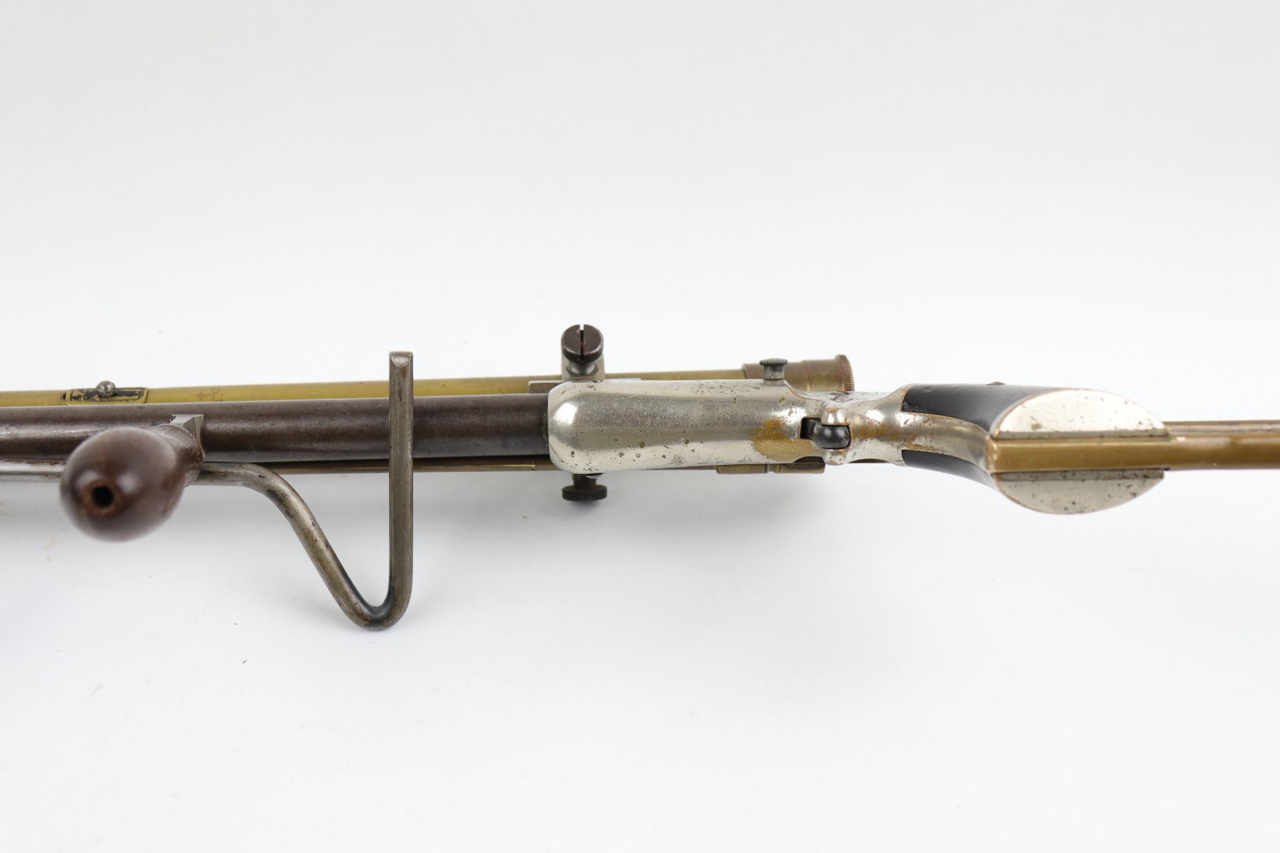 6/16/20 – This is a very interesting custom Stevens Arms Co New Model Pocket Rifle. From research, this gun was likely made in the late 1800’s. No FFL required. About 2,500 of these guns were produced, so it is quite rare. This particular example has been equipped with a full-length brass telescopic sight, folding monopod or palm rest, vertical foregrip and side-mounted cleaning rod. There are spotty areas of wear on the frame, especially near the trigger. There are small dings and dents on the frame throughout. There are scratches along the length of the barrel throughout. The barrel has an even layer of dark brown patina. There are handling marks and spots of discoloration on the brass scope throughout. The optics are excellent. It appears to be fully functional. The bore has good rifling but a decent amount of frosting. 14.75″ barrel.