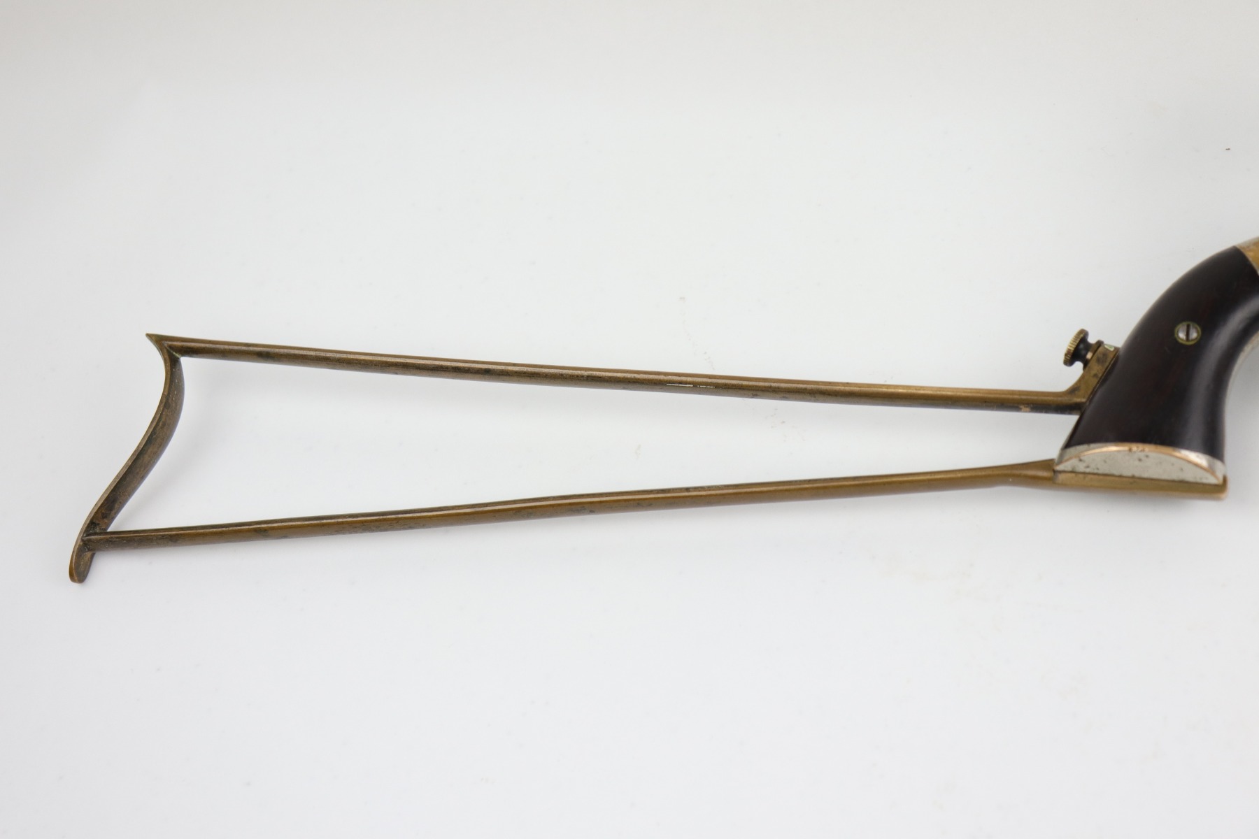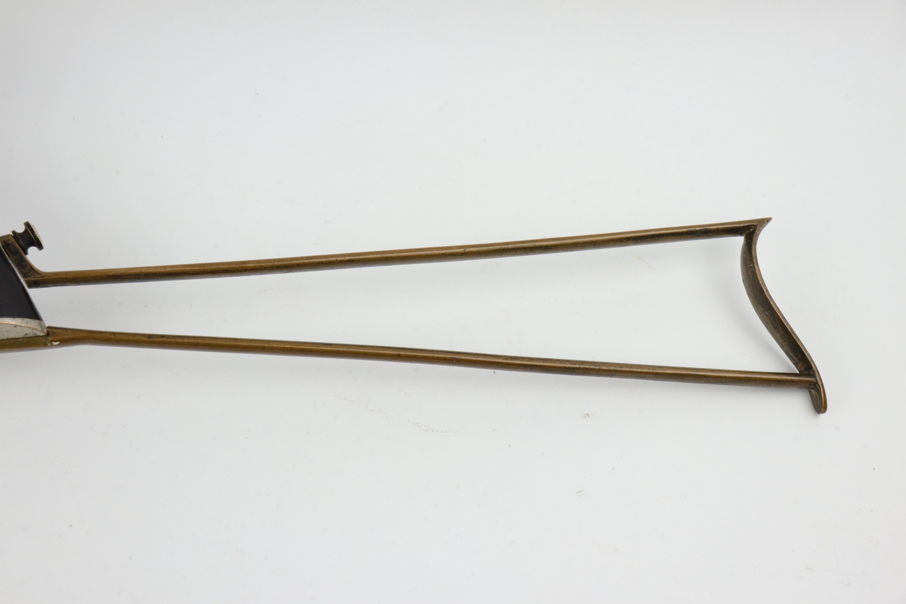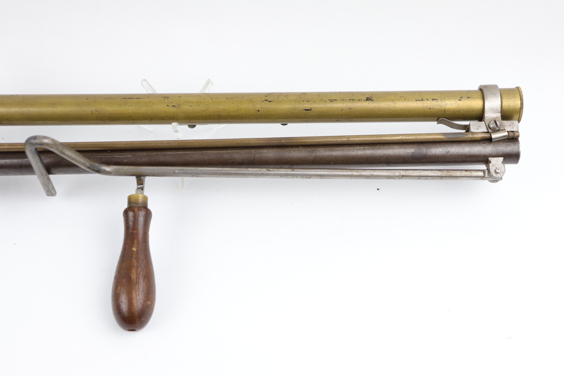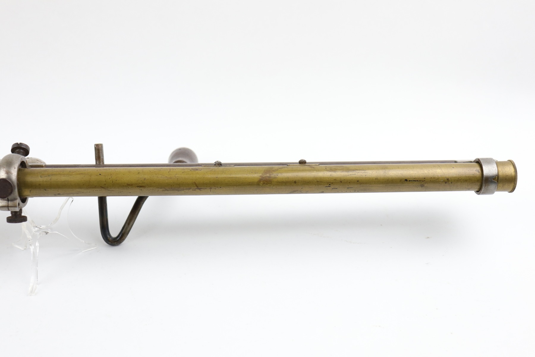 6/16/20 – This is a very interesting custom Stevens Arms Co New Model Pocket Rifle. From research, this gun was likely made in the late 1800’s. No FFL required. About 2,500 of these guns were produced, so it is quite rare. This particular example has been equipped with a full-length brass telescopic sight, folding monopod or palm rest, vertical foregrip and side-mounted cleaning rod. There are spotty areas of wear on the frame, especially near the trigger. There are small dings and dents on the frame throughout. There are scratches along the length of the barrel throughout. The barrel has an even layer of dark brown patina. There are handling marks and spots of discoloration on the brass scope throughout. The optics are excellent. It appears to be fully functional. The bore has good rifling but a decent amount of frosting. 14.75″ barrel.