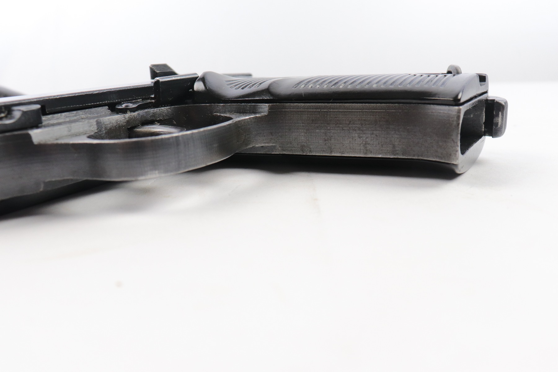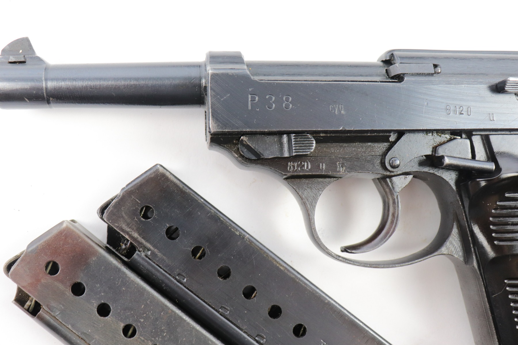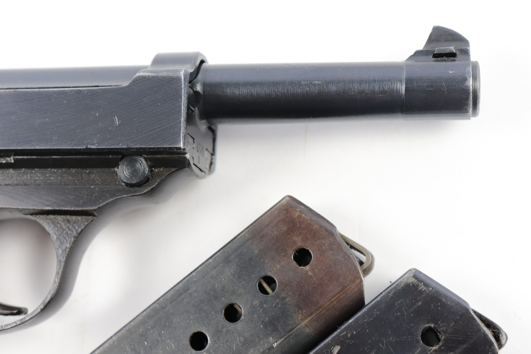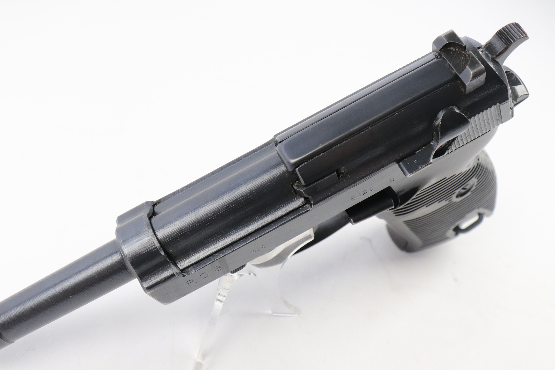 3/30/18 – This is an original CYQ P.38 Rig from late WW2. The serial number puts it in September 1944 production. The pistol has rough machining marks on the slide – an iconic sign of late war production. The pistol is in great conditoin overall and mechically sound as well as fully functional. The action is smooth and decocker functions properly. The finish on the pistol overall is about 96% with most of the wear appearing on the front strap. There’s also some light edge wear on the muzzle and slide. The bore is excellent with strong rifling and minimal patina. Guaranteed all original. Comes with a 1942 dated holster in good condition, but the back belt loops have been restitched. The stitching looks like a WW2 era field replacement. Missing the lift strap as well. Comes with a spare period correct magazine as well.