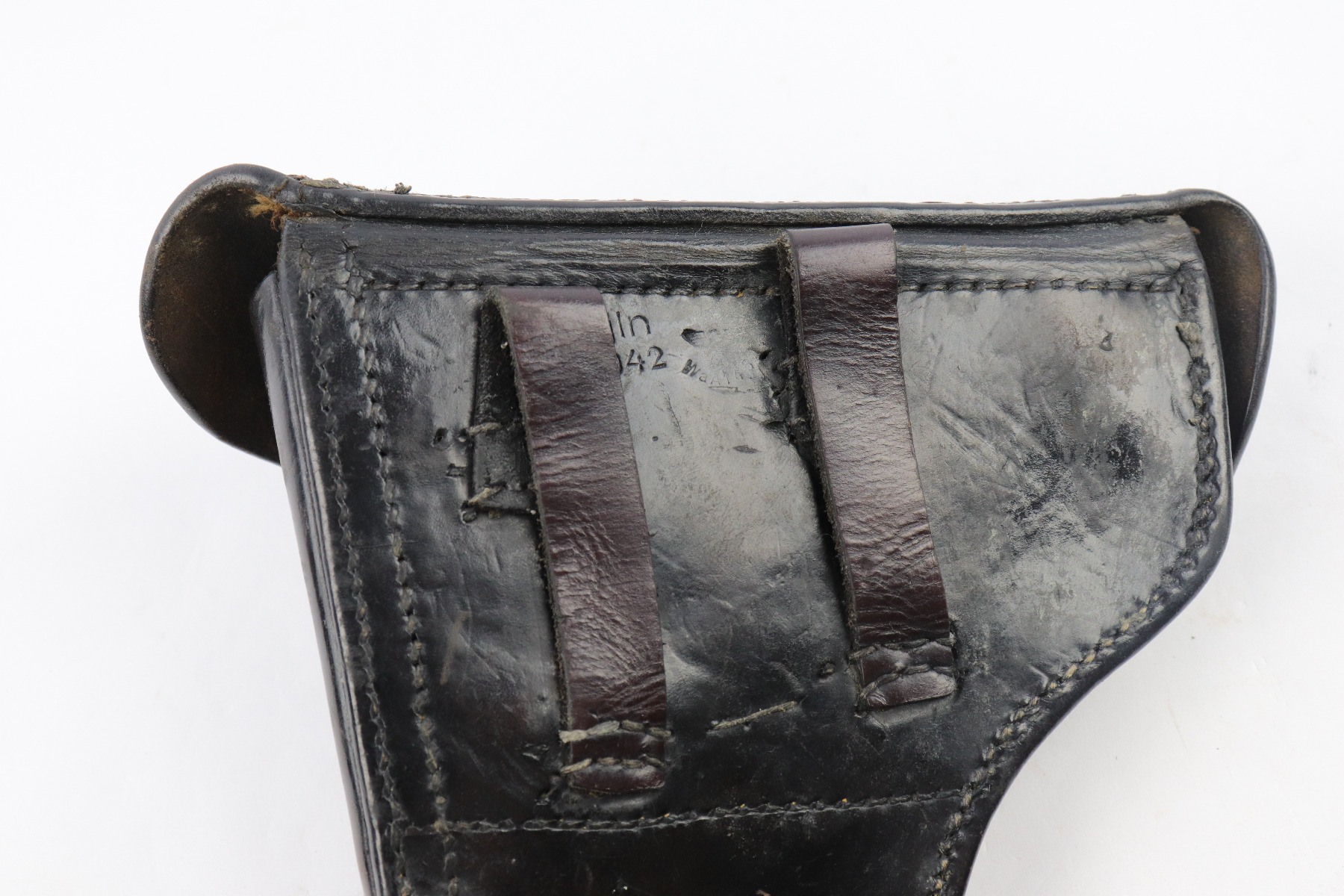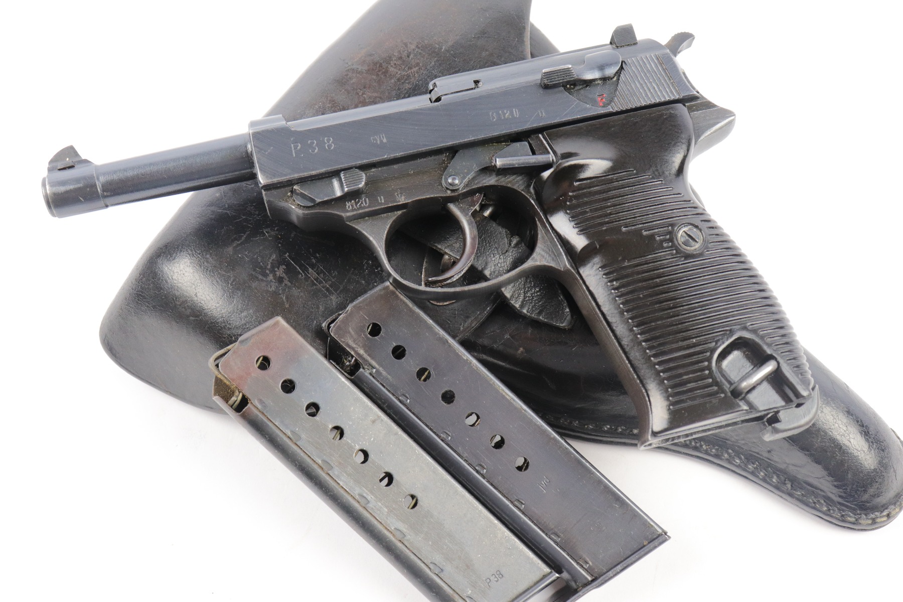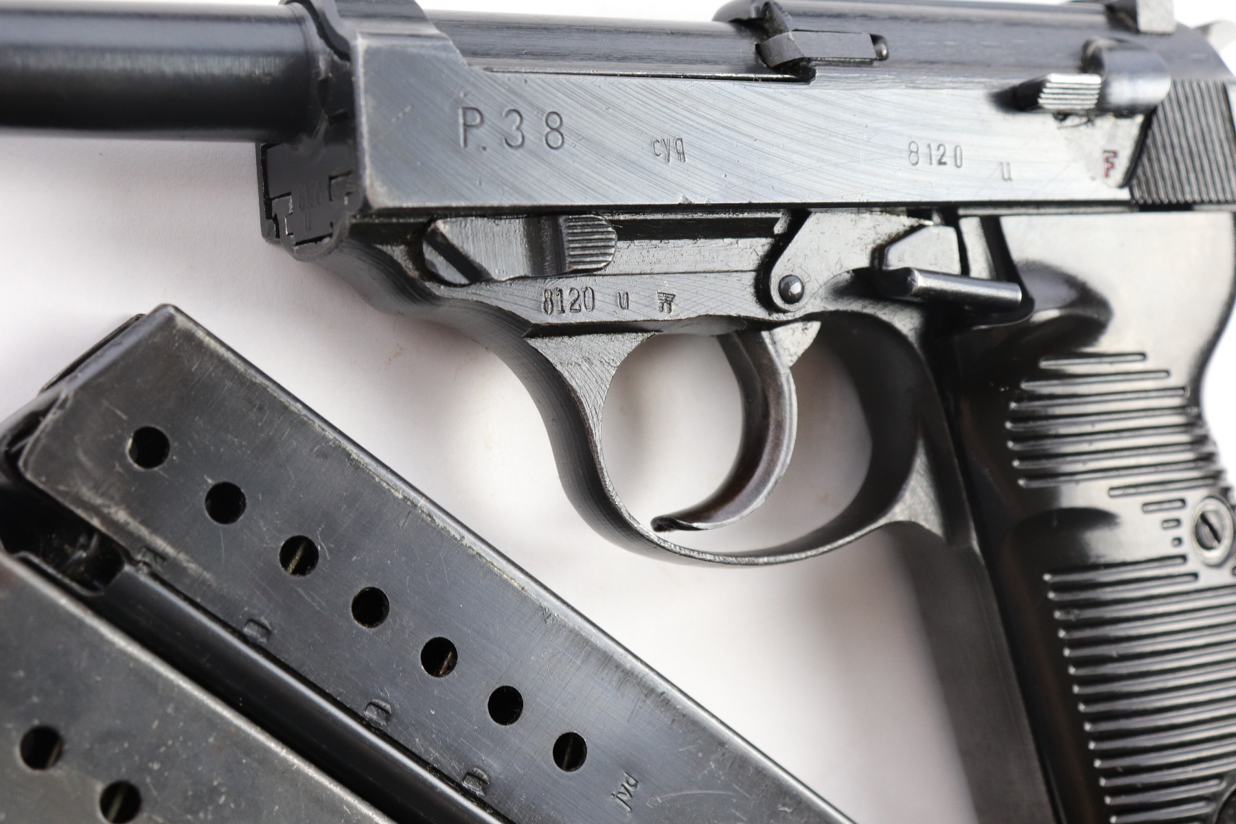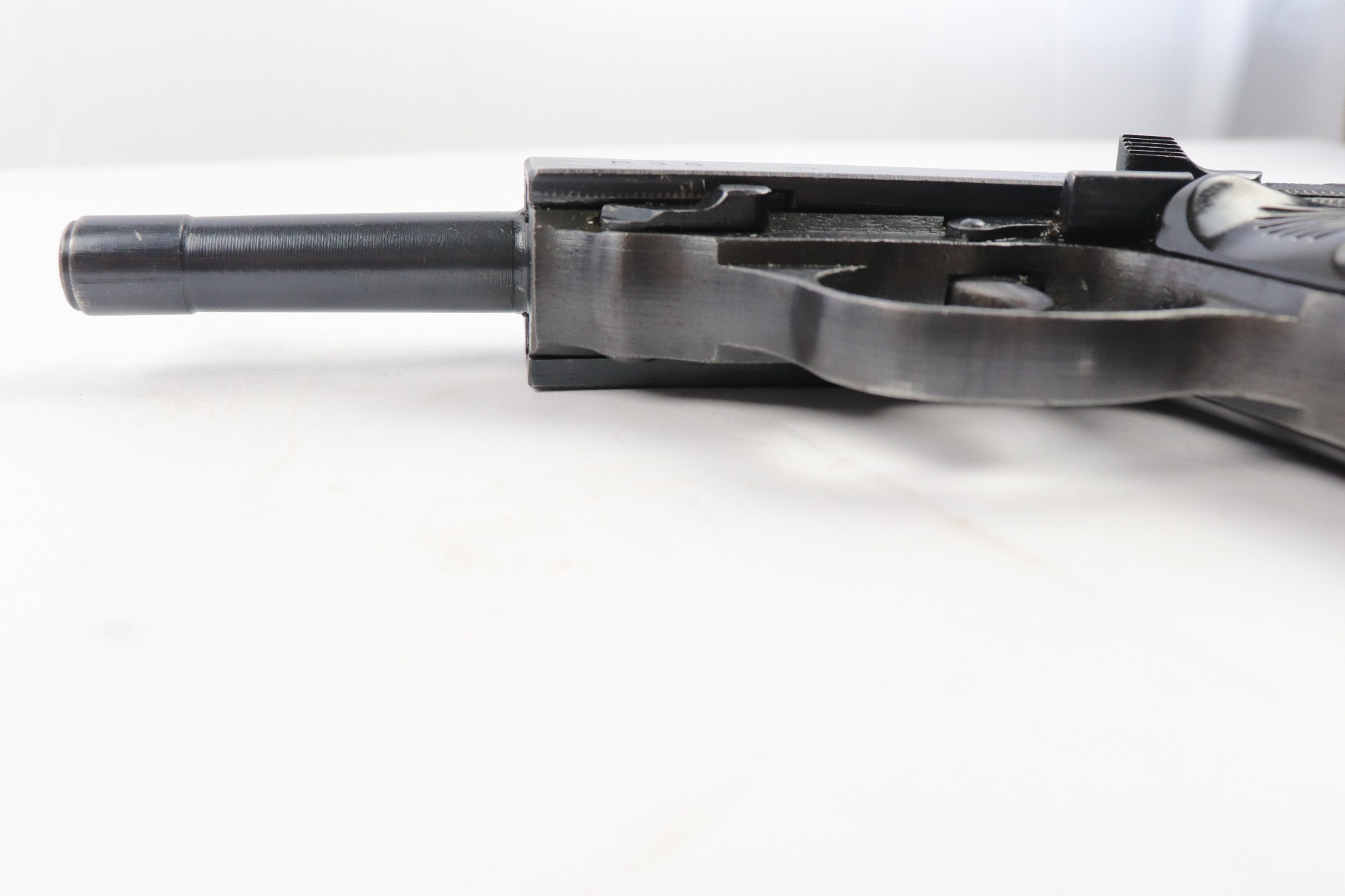 3/30/18 – This is an original CYQ P.38 Rig from late WW2. The serial number puts it in September 1944 production. The pistol has rough machining marks on the slide – an iconic sign of late war production. The pistol is in great conditoin overall and mechically sound as well as fully functional. The action is smooth and decocker functions properly. The finish on the pistol overall is about 96% with most of the wear appearing on the front strap. There’s also some light edge wear on the muzzle and slide. The bore is excellent with strong rifling and minimal patina. Guaranteed all original. Comes with a 1942 dated holster in good condition, but the back belt loops have been restitched. The stitching looks like a WW2 era field replacement. Missing the lift strap as well. Comes with a spare period correct magazine as well.