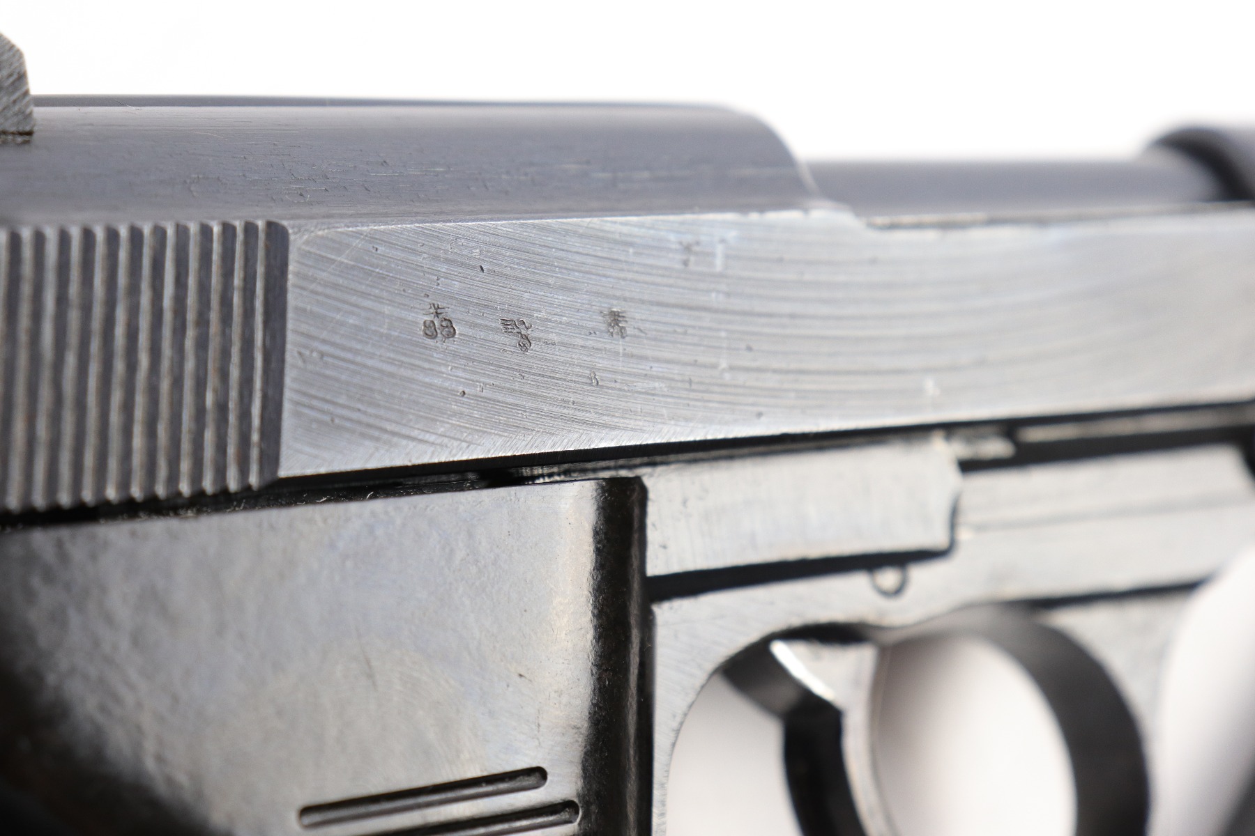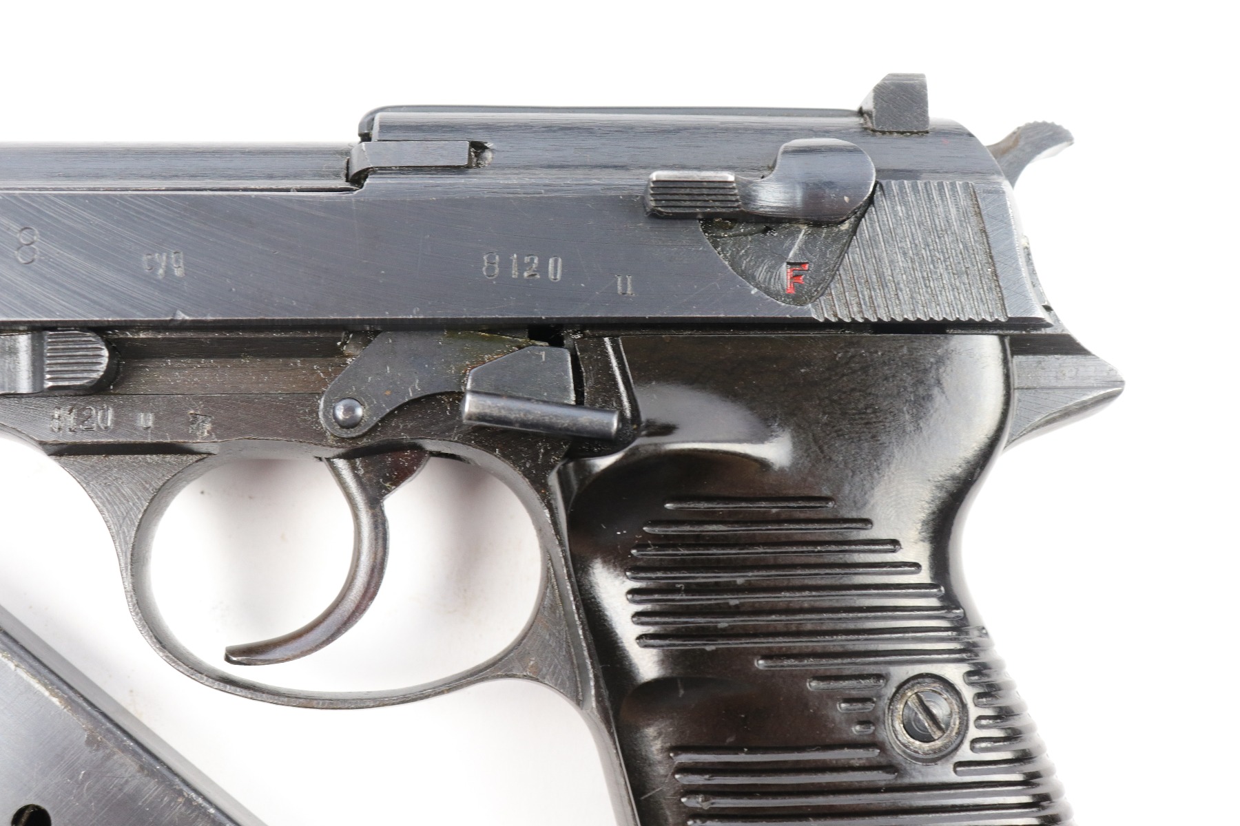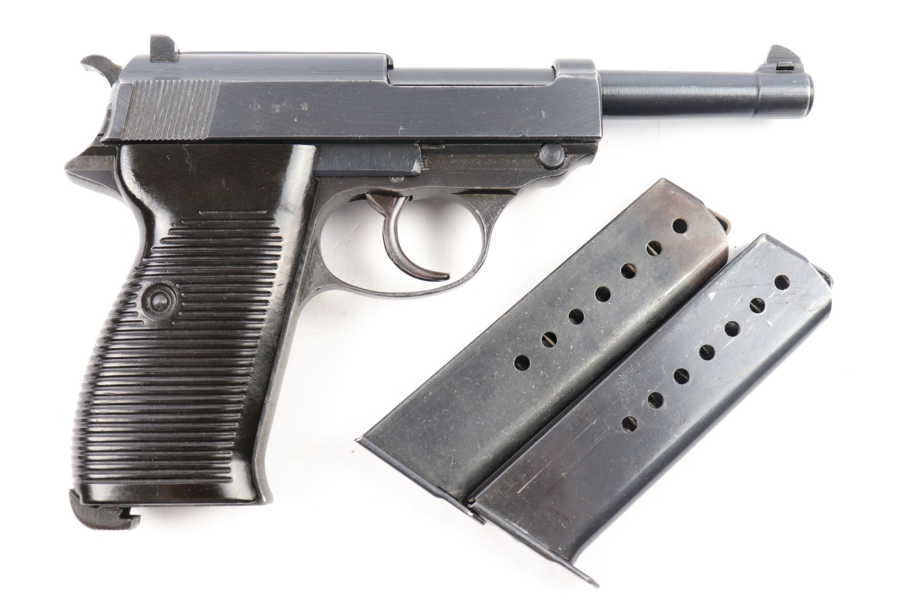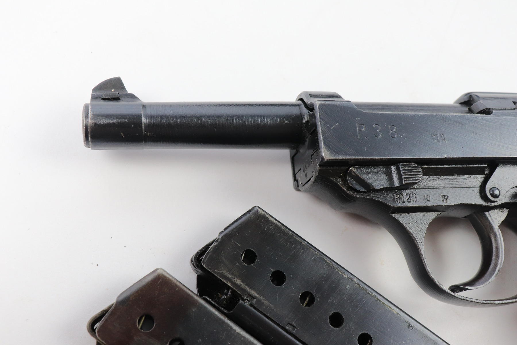 3/30/18 – This is an original CYQ P.38 Rig from late WW2. The serial number puts it in September 1944 production. The pistol has rough machining marks on the slide – an iconic sign of late war production. The pistol is in great conditoin overall and mechically sound as well as fully functional. The action is smooth and decocker functions properly. The finish on the pistol overall is about 96% with most of the wear appearing on the front strap. There’s also some light edge wear on the muzzle and slide. The bore is excellent with strong rifling and minimal patina. Guaranteed all original. Comes with a 1942 dated holster in good condition, but the back belt loops have been restitched. The stitching looks like a WW2 era field replacement. Missing the lift strap as well. Comes with a spare period correct magazine as well.