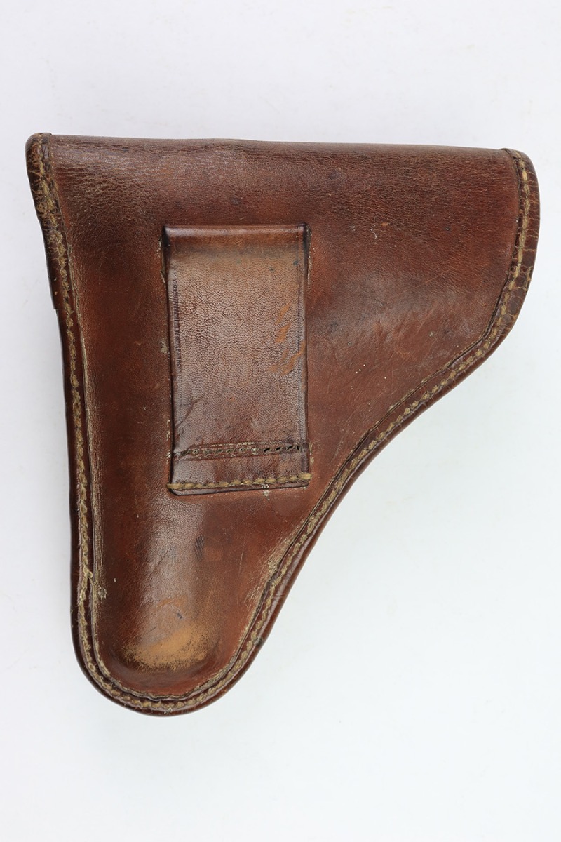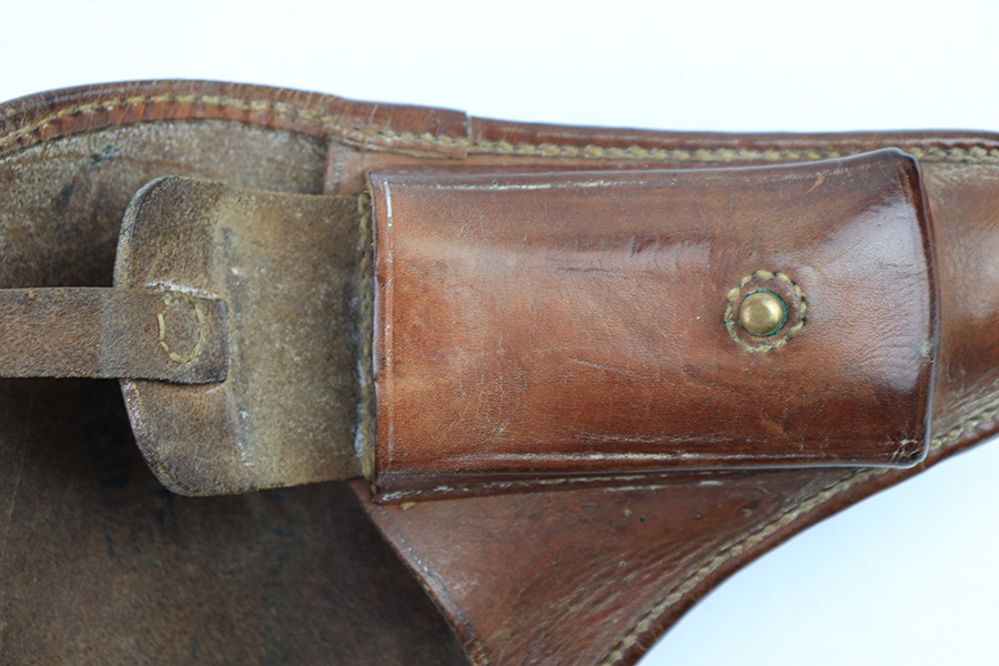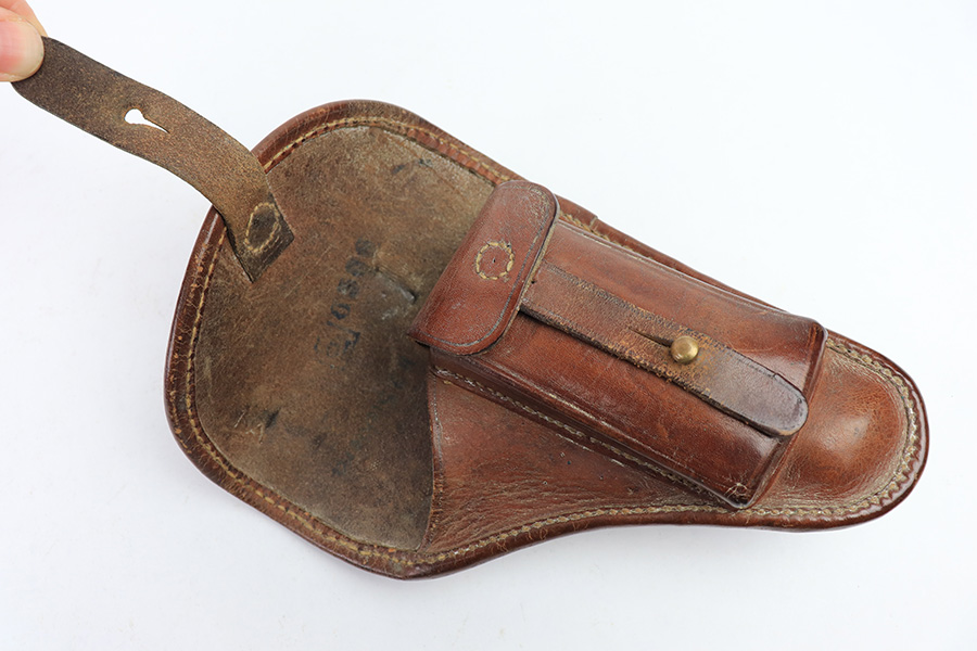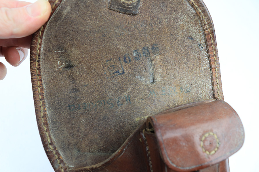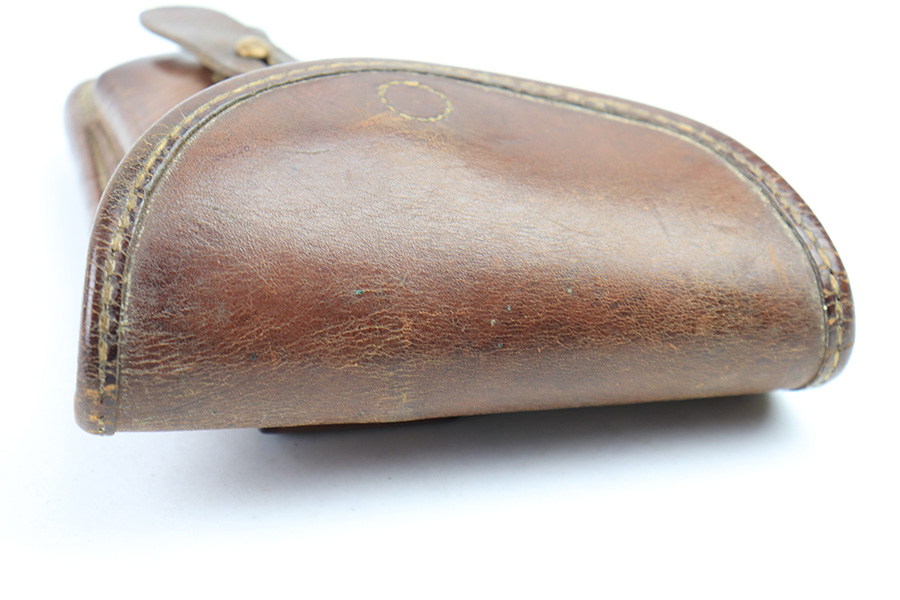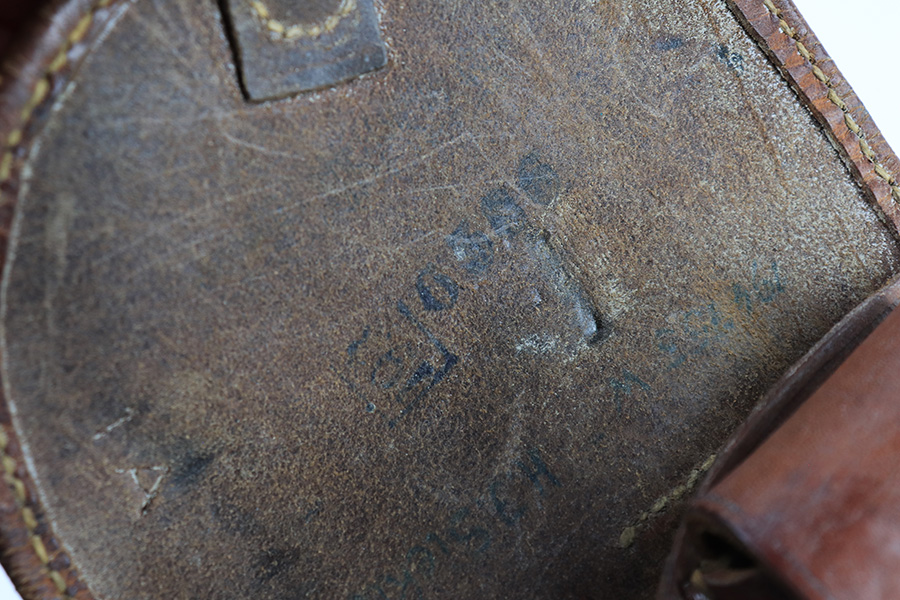 12/27/22 – This is an original CZ model 24 (or model 27) holster. Early / pre WW2 production with a brass closure knob and front ammo / mag pouch. The holster is in great condition with some mild surface wrinkling and light pliability. The interior leather is ink stamped, but the ink is faded and hard to decipher the numbers. The interior leather is also stamped “1A” into the leather as shown. No stitching issues.