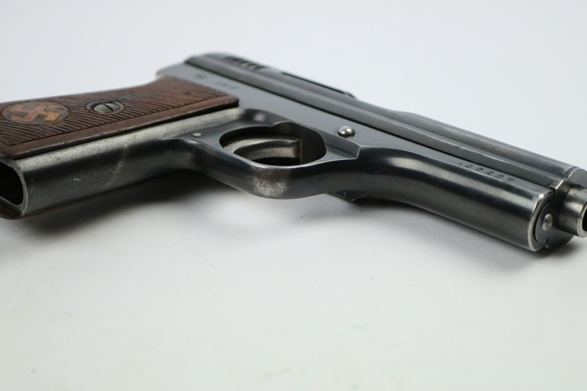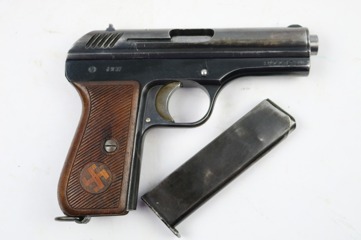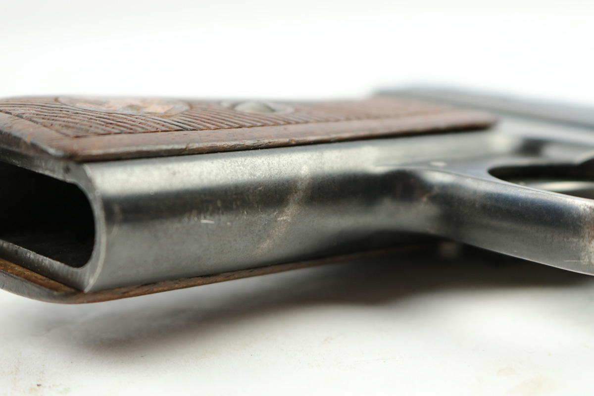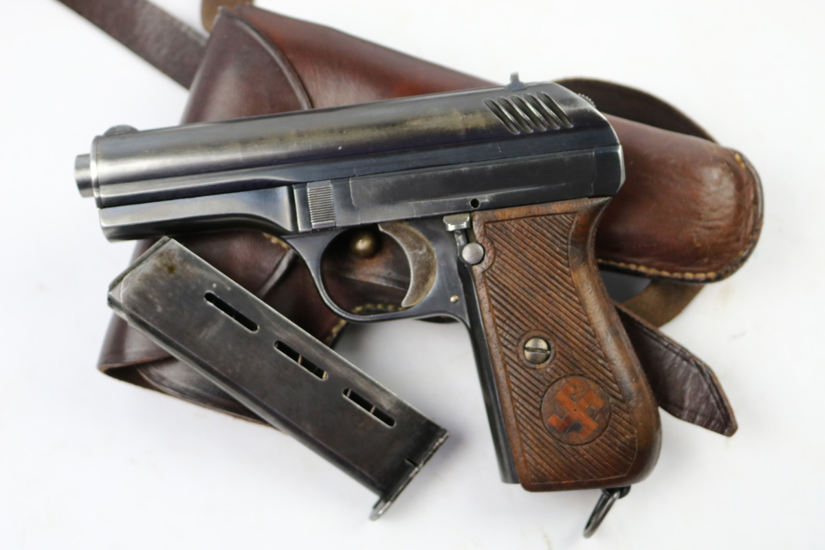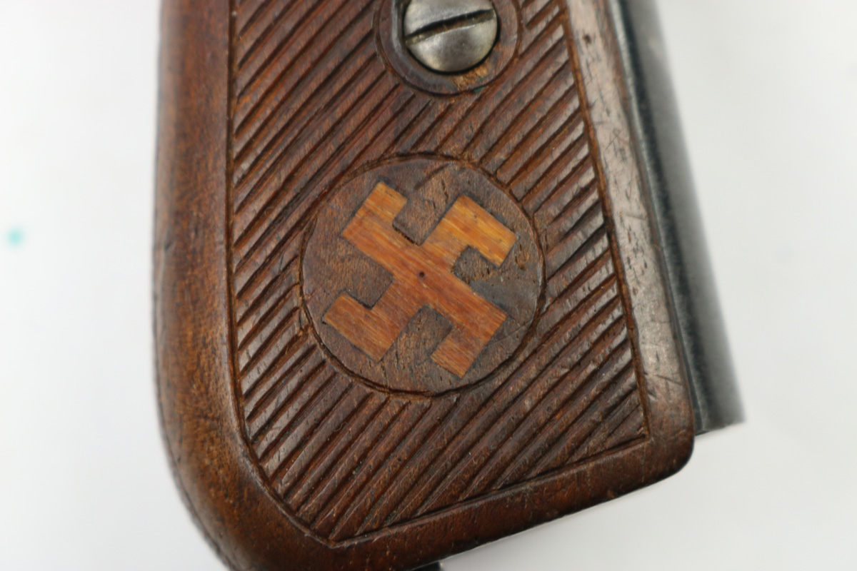 8/7/18 – This is an original CZ model 24 with an original shoulder holster. The pistol was made in 1937 and is in all original configuration except for the grips, which appear to have been custom made with a swastika logo on either side (they look WW2 era appropriate). The grips fit the gun perfectly and the wood has an aged look, which leads me to believe these were place on the gun in the early ’40s or late ’30s a few years after production. The gun has about 86-88% original finish in tact with thinning / bluing loss on both sides of the slide. The front strap similarly has normal bluing loss. No rust or pitting and a fairly clean bore. Nice lands and grooves. Comes with an unmarked but period correct shoulder holster. The holster has all original stitching and has a brass closure knob (seems fairly scarce). Guaranteed original.