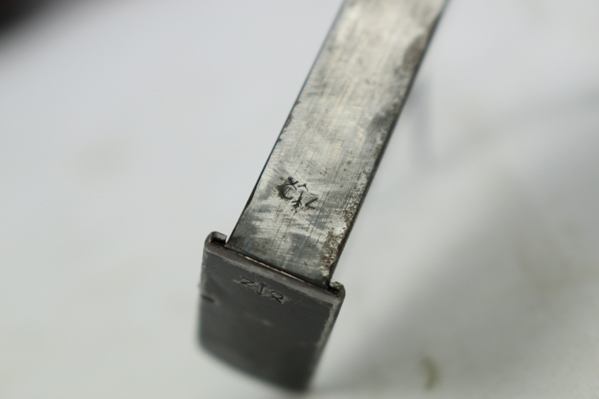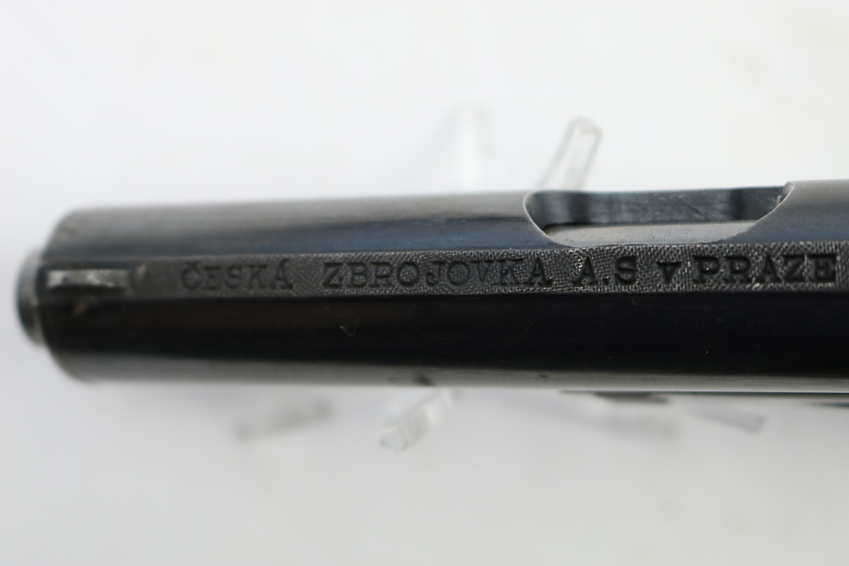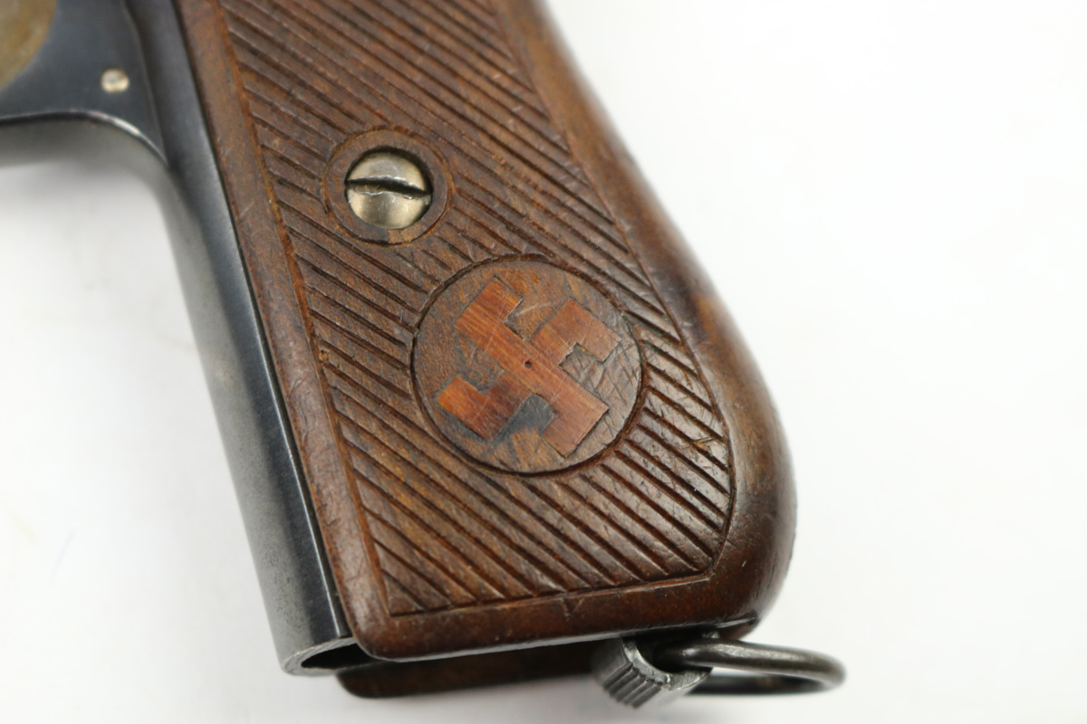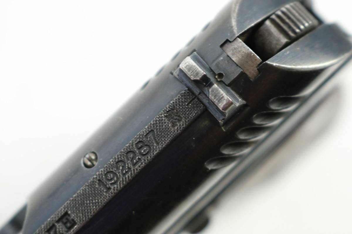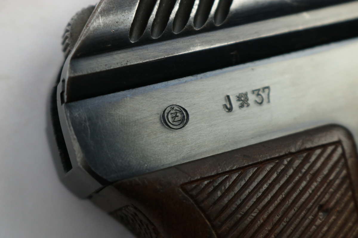8/7/18 – This is an original CZ model 24 with an original shoulder holster. The pistol was made in 1937 and is in all original configuration except for the grips, which appear to have been custom made with a swastika logo on either side (they look WW2 era appropriate). The grips fit the gun perfectly and the wood has an aged look, which leads me to believe these were place on the gun in the early ’40s or late ’30s a few years after production. The gun has about 86-88% original finish in tact with thinning / bluing loss on both sides of the slide. The front strap similarly has normal bluing loss. No rust or pitting and a fairly clean bore. Nice lands and grooves. Comes with an unmarked but period correct shoulder holster. The holster has all original stitching and has a brass closure knob (seems fairly scarce). Guaranteed original.