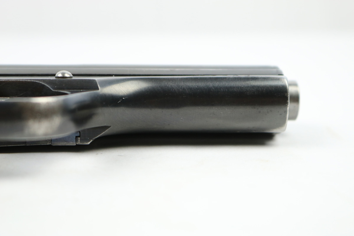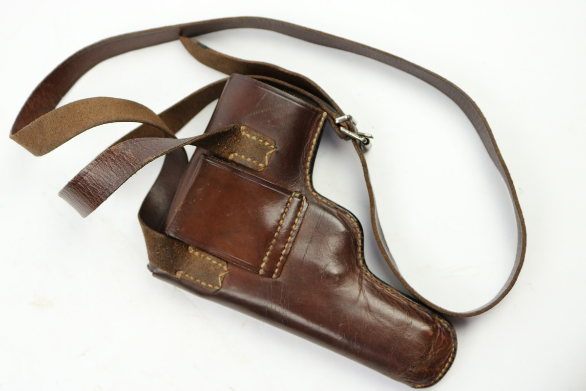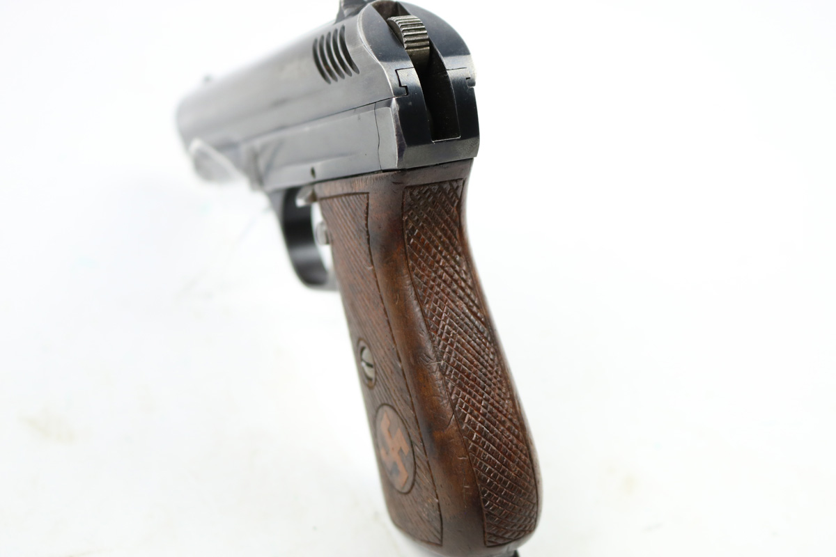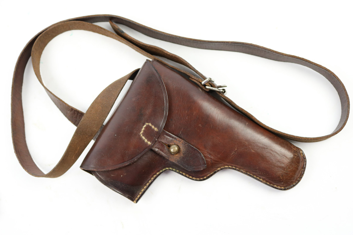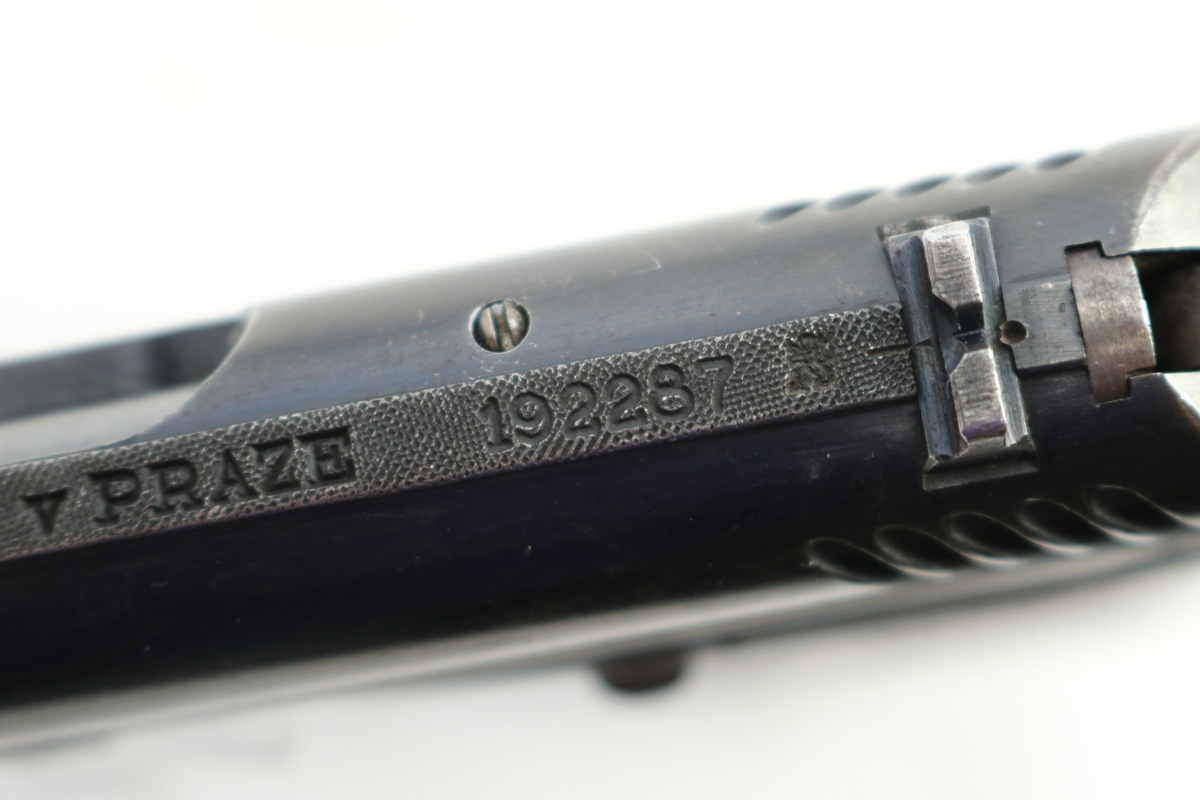8/7/18 – This is an original CZ model 24 with an original shoulder holster. The pistol was made in 1937 and is in all original configuration except for the grips, which appear to have been custom made with a swastika logo on either side (they look WW2 era appropriate). The grips fit the gun perfectly and the wood has an aged look, which leads me to believe these were place on the gun in the early ’40s or late ’30s a few years after production. The gun has about 86-88% original finish in tact with thinning / bluing loss on both sides of the slide. The front strap similarly has normal bluing loss. No rust or pitting and a fairly clean bore. Nice lands and grooves. Comes with an unmarked but period correct shoulder holster. The holster has all original stitching and has a brass closure knob (seems fairly scarce). Guaranteed original.